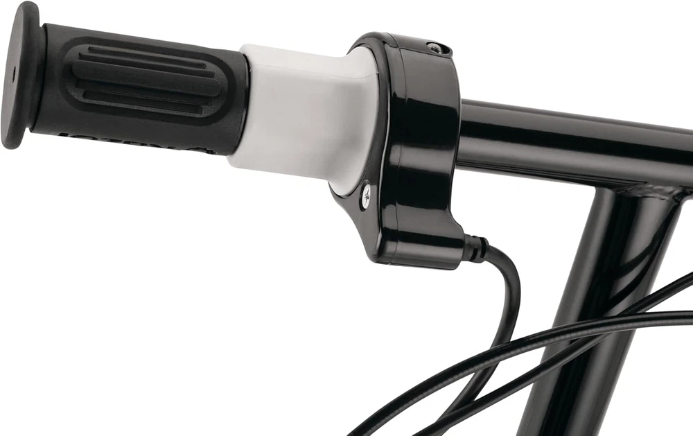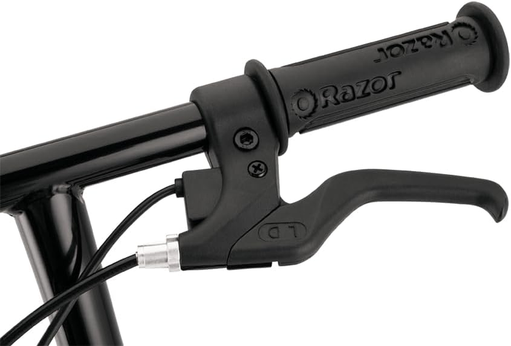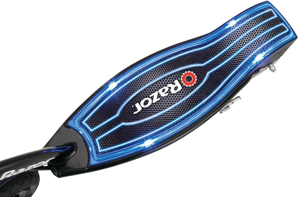 Product Note: Max speed and range per charge vary based on several factors, including: rider weight, riding surface, incline, ambient temperature, battery level, riding style (stop/start vs cruising), etc..Grips: Soft, rubber. Kickstand: Retractable. Rear Wheel: Urethane..Kickstand : Retractable. Grips : Soft, rubber All steel frame and fork construction. Front Wheel: 200 mm pneumatic front tire.Kickstand: Retractable. Some assembly required Features kick start, high-torque, chain-driven motor, twist-grip acceleration control and hand operated front brake For ages 8 and up;120 lbs Assembled Product Dimensions: 32.5 x 16 x 36 (inches); 8 inches pneumatic front tyre Electrical system certified compliant with UL2272 by ACT Lab LLC, an accredited testing lab Hop on the Razor E100 Glow that shines like a bolt of blue lighting! Designed for riders age 8 and up, the E100 Glow Electric scooter features a kick-to-start, 100-watt motor that provides speeds up to 10 mph (16 km/h) just enough to thrill younger riders. Its simple twist-grip acceleration control and hand-operated brake help kids take confident control of their ride. The 8" (200 mm) pneumatic front tire provides ample cushion to smooth out rough surfaces. With the LEDs on the deck that light up when throttle is twisted, the Razor E100 Glow electric scooter offers up to 40 minutes of fun, glowing, electric-powered ride time. Glow wherever you go, with the Razor E100 Glow!