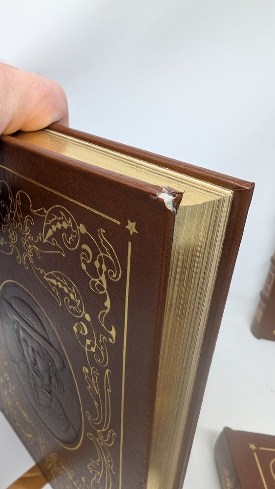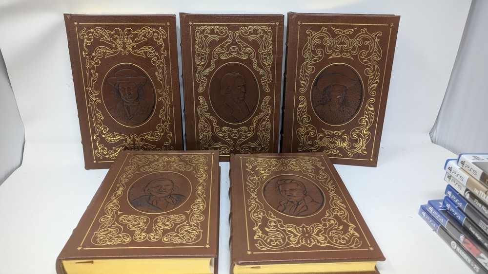 Vintage Leather Bound Frontier Heroes Book Set – Daniel Boone, Wild Bill, Davy Crockett, Kit Carson, Buffalo Bill Bring the legends of the American frontier to your shelf with this beautiful matching set of leather bound books. Each volume features a gold-embossed spine and cover, durable binding, and timeless subject matter focused on some of the most iconic figures of the Wild West. Titles & Authors Included: Daniel Boone by Michael Lofaro Wild Bill by Joseph Rosa Davy Crockett by James Shackford Kit Carson by Harvey Lewis Carter Buffalo Bill by Leonard & Goodman Features: Matching brown leather covers with gold gilt lettering & designs Classic decorative spines for an elegant display High-quality bindings, perfect for collectors or Western Americana enthusiasts Condition: Pre-owned, good overall. There is a little shelf wear, but bindings intact, pages clean. There is one front cover that may have some fading and a couple corners showing wear, as can be seen in the photos. Please review photos for exact condition. This set makes an excellent gift for history buffs, collectors of Western Americana, or anyone who appreciates finely bound books.