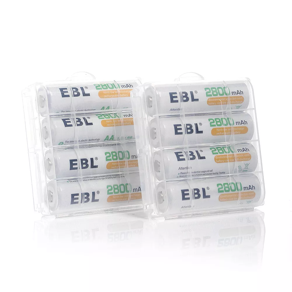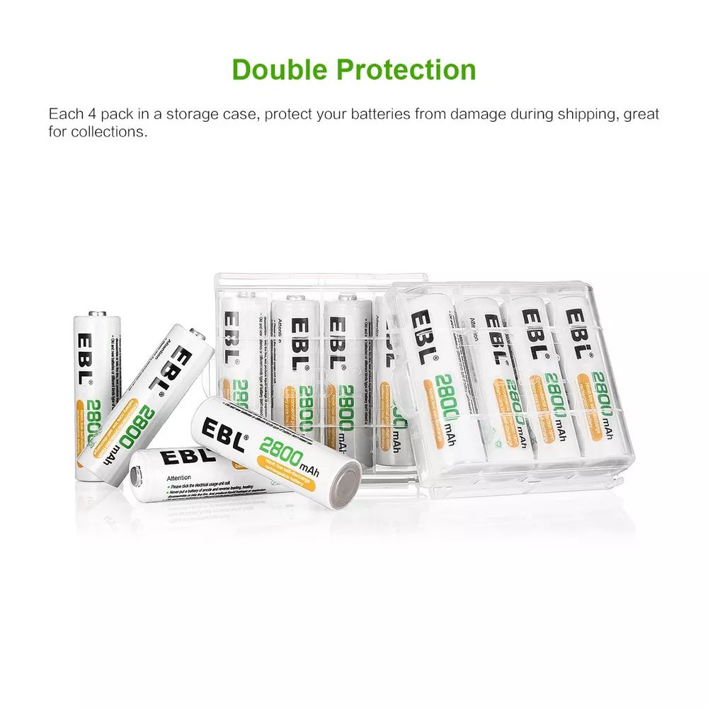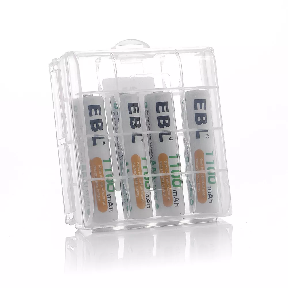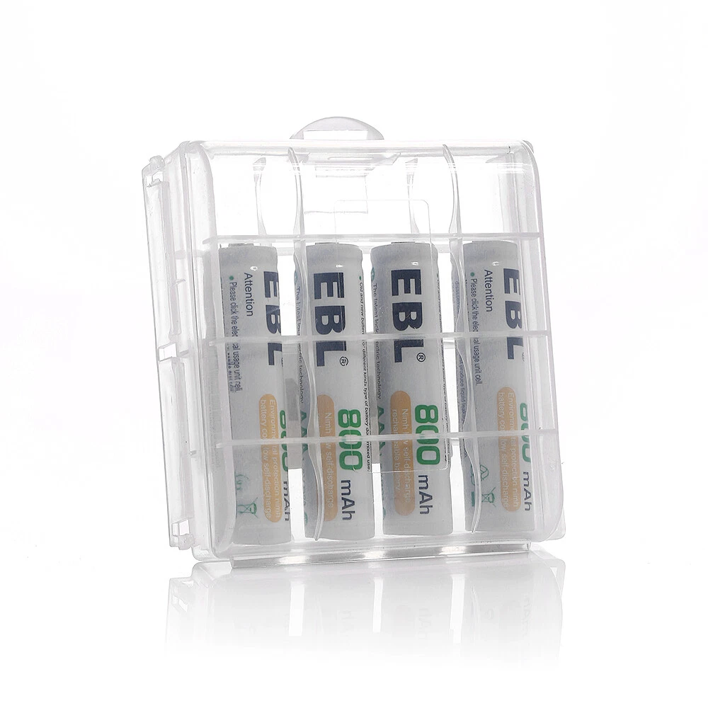Features For AA & AAA Ni-MH Rechargeable Batteries: Features 1. EBL Branded ,Pro-environment. 2. NO memory effect NIMH chemistry. 3. Recharged up to 1000 times. 4. Relatively long service life. 5. 100% New and high quality. 6. Superior performance under low temperature condition. The Details 1. Battery Voltage: 1.2V 2. Capacity: (800mAh AAA)/(1100mAh AAA )/(2300mAh AA )/(2800mAh AA) 3. Battery Size: AAA/AA 4. Rechargeable type: Ni-MH/ NIMH High capacity NO memory 5. Storage Case : Yes (for 4PCS Battery/per case) 6. Brand: EBL 7. Model: R03/ R06 8. Case : included(4pcs battery /case) For 500mAh AAA 1000mah AA Ni-CD Rechargeable Batteries: 1. Battery Type: AAA/ AA 2. Capacity: 400mAh/1000mAh 3. Voltage: 1.2V 4. Chemistry: Ni-CD 5. Weight: 7.8 ounce (220 g) 6. Pro-environment, 7. EBL batteries can be recharged up to 1200 times when fully or partially drained. 8. Batteries are great for use in household devices such as digital cameras, toys, remote controls, hand held games Compatible with Flash Light,LED Torch ,Camera, Remote control, Garden solar light, ,Detector ,toys etc , multifunction battery Package 4~20pcs AA / AAA Rechargeable Batteries (see dropdown menu droplist) with Clear Storage Box( 4pcs batteries /Case)