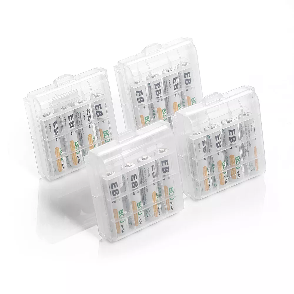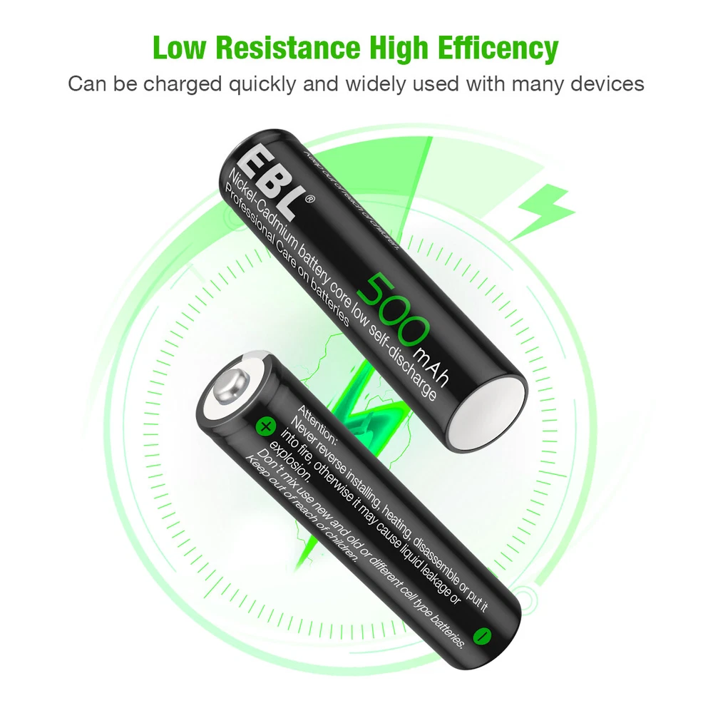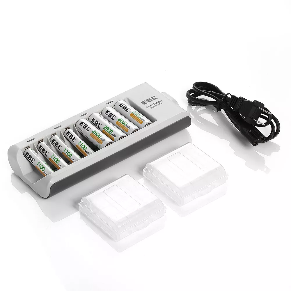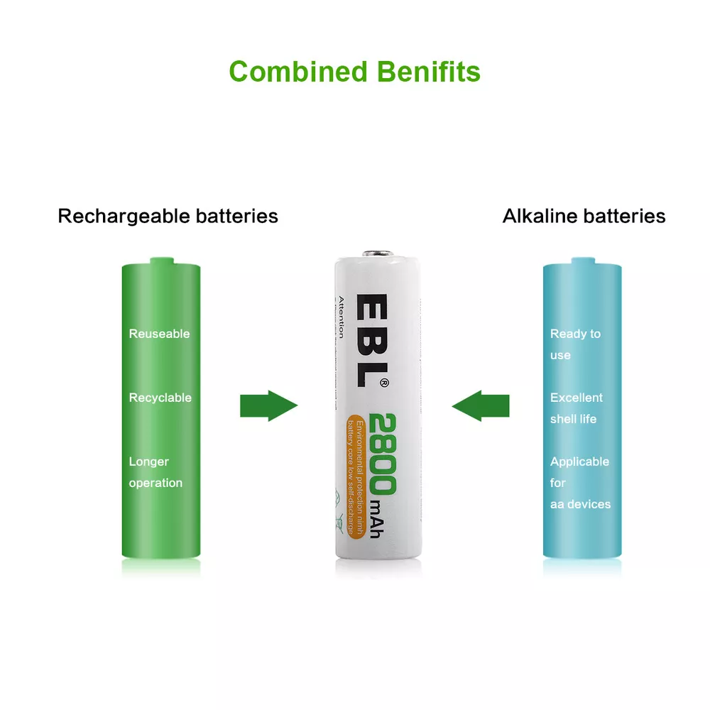 Features For AA & AAA Ni-MH Rechargeable Batteries: Features 1. EBL Branded ,Pro-environment. 2. NO memory effect NIMH chemistry. 3. Recharged up to 1000 times. 4. Relatively long service life. 5. 100% New and high quality. 6. Superior performance under low temperature condition. The Details 1. Battery Voltage: 1.2V 2. Capacity: (800mAh AAA)/(1100mAh AAA )/(2300mAh AA )/(2800mAh AA) 3. Battery Size: AAA/AA 4. Rechargeable type: Ni-MH/ NIMH High capacity NO memory 5. Storage Case : Yes (for 4PCS Battery/per case) 6. Brand: EBL 7. Model: R03/ R06 8. Case : included(4pcs battery /case) For 500mAh AAA 1000mah AA Ni-CD Rechargeable Batteries: 1. Battery Type: AAA/ AA 2. Capacity: 400mAh/1000mAh 3. Voltage: 1.2V 4. Chemistry: Ni-CD 5. Weight: 7.8 ounce (220 g) 6. Pro-environment, 7. EBL batteries can be recharged up to 1200 times when fully or partially drained. 8. Batteries are great for use in household devices such as digital cameras, toys, remote controls, hand held games Compatible with Flash Light,LED Torch ,Camera, Remote control, Garden solar light, ,Detector ,toys etc , multifunction battery Package 4~20pcs AA / AAA Rechargeable Batteries (see dropdown menu droplist) with Clear Storage Box( 4pcs batteries /Case)