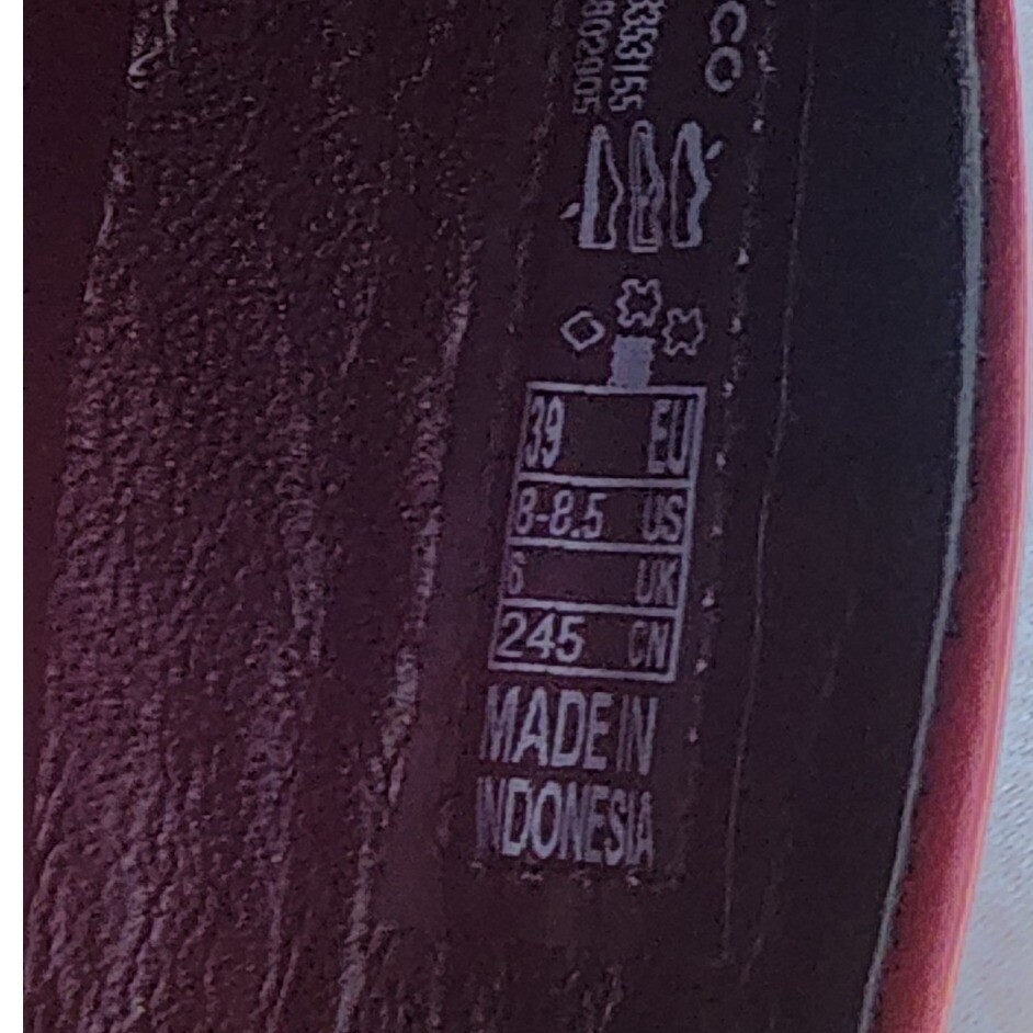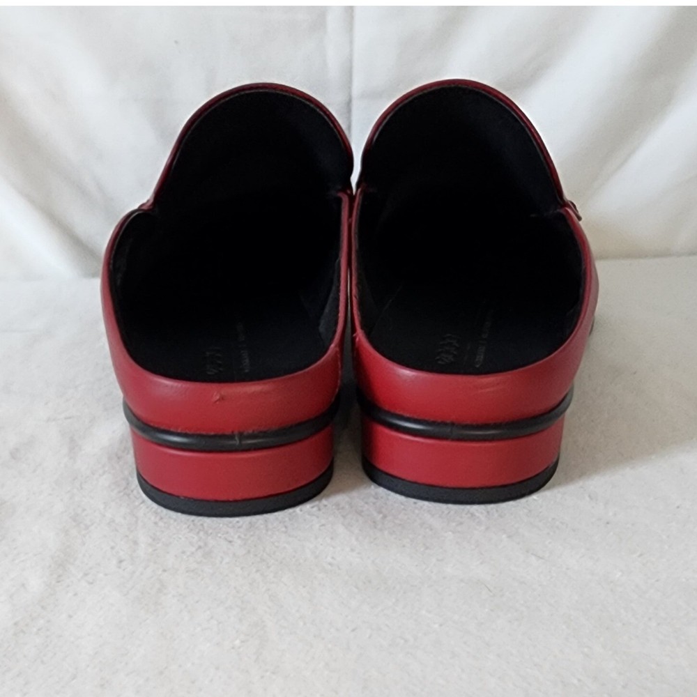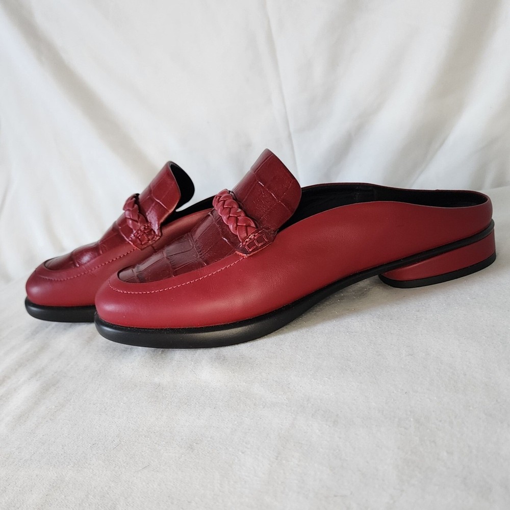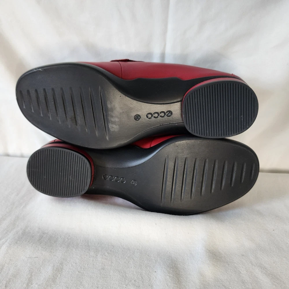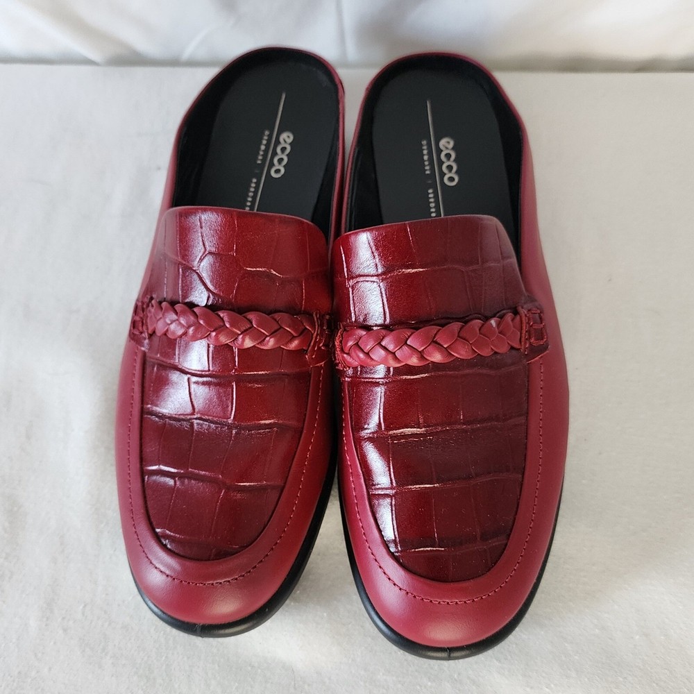 Stylish and comfortable slip-on loafer mules by ECCO, featuring a rich red color and sophisticated design. These mules showcase a croc-embossed upper with a braided accent across the vamp, adding a touch of elegance. The low block heel provides subtle lift and all-day comfort, while the slip-on style ensures ease of wear. Perfect for adding a pop of color to your office attire or for a casual weekend brunch. Keywords: ECCO, loafer mules, slip on shoes, red mules, croc embossed, braided accent, block heel, casual shoes, comfortable mules, size 39, leather mules, women's shoes, designer mules Clean and in great condition, with no snags, tears, or pilling. From a smoke-free home.