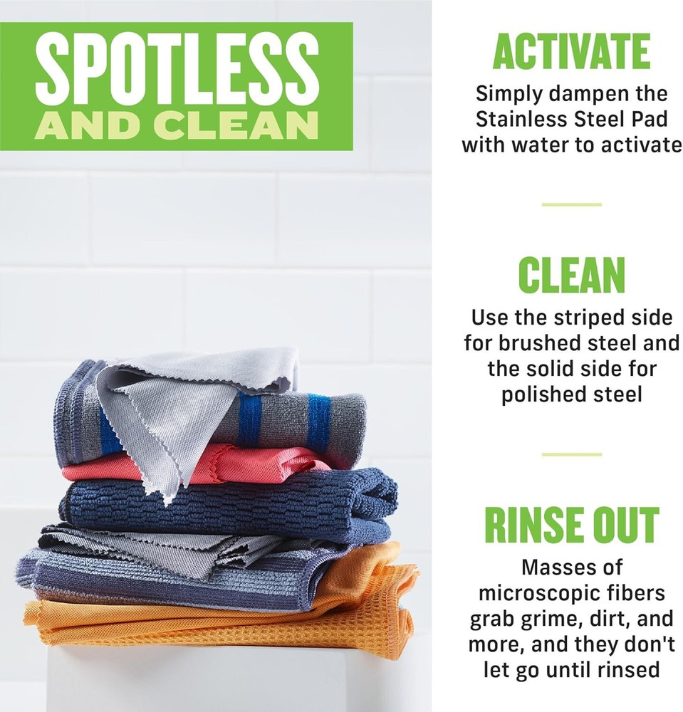 About this item 75% Polyester, 15% Polyamide 10% Polypropylene. STAINLESS STEEL KIT: All you need to keep stainless steel true to its name, our kit comes with a dual-sided cleaning cloth and a polishing cloth that doesn't need pastes, wipes, or sprays. WATER ACTIVATED: With precision-engineered microfibers that lift away virtually all grime, dirt, and dust, our cleaning cloths deliver a complete clean when activated with water, eliminating the need for additional cleaners. DUAL SIDED CLEAN: Dampen the Stainless Steel Cloth, wring, and wipe. The striped textured side is designed for brushed steel and the softer solid side for polished steel. Finish with the polishing cloth to leave the surface shining and streak-free. REUSE AND SAVE: Our reusable cloths go in the laundry, not the landfill. They come with a 100-wash, one-year promise that means they can be used again and again, helping you save in the long run while ridding the world of disposable cleaners. E-CLOTH: We develop ecological cleaning methods that cover all facets of life. Through dedicated education, research, and partnerships, E-Cloth is a revolutionary cleaning system that seeks to leave the world in a better place than it was yesterday.