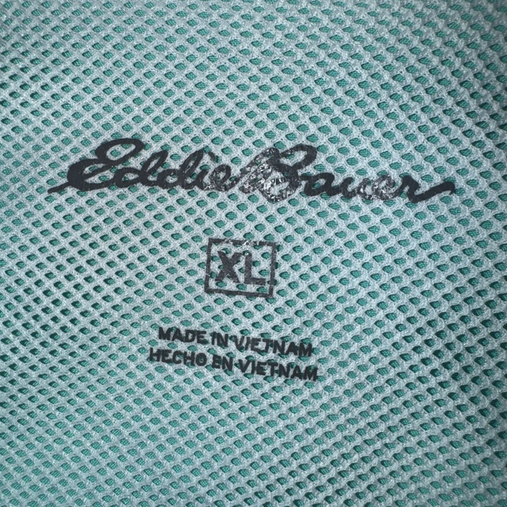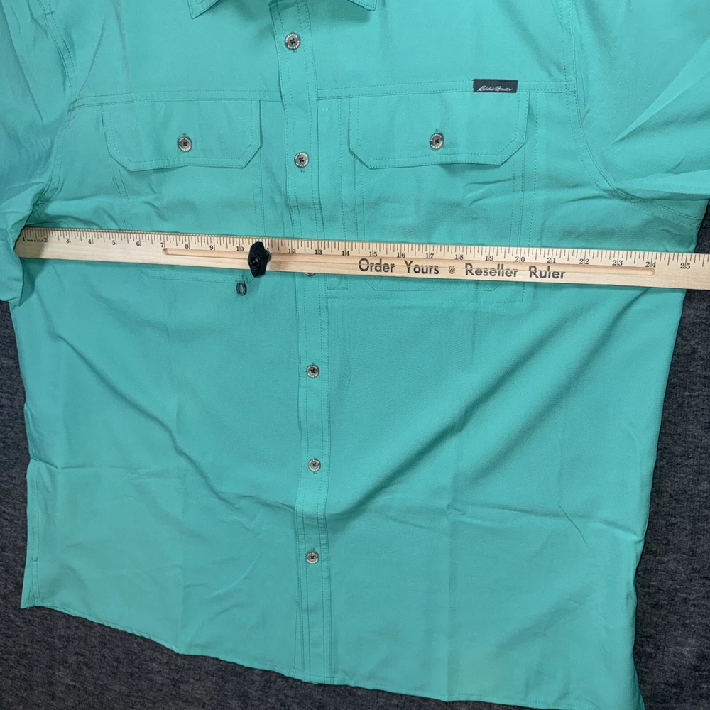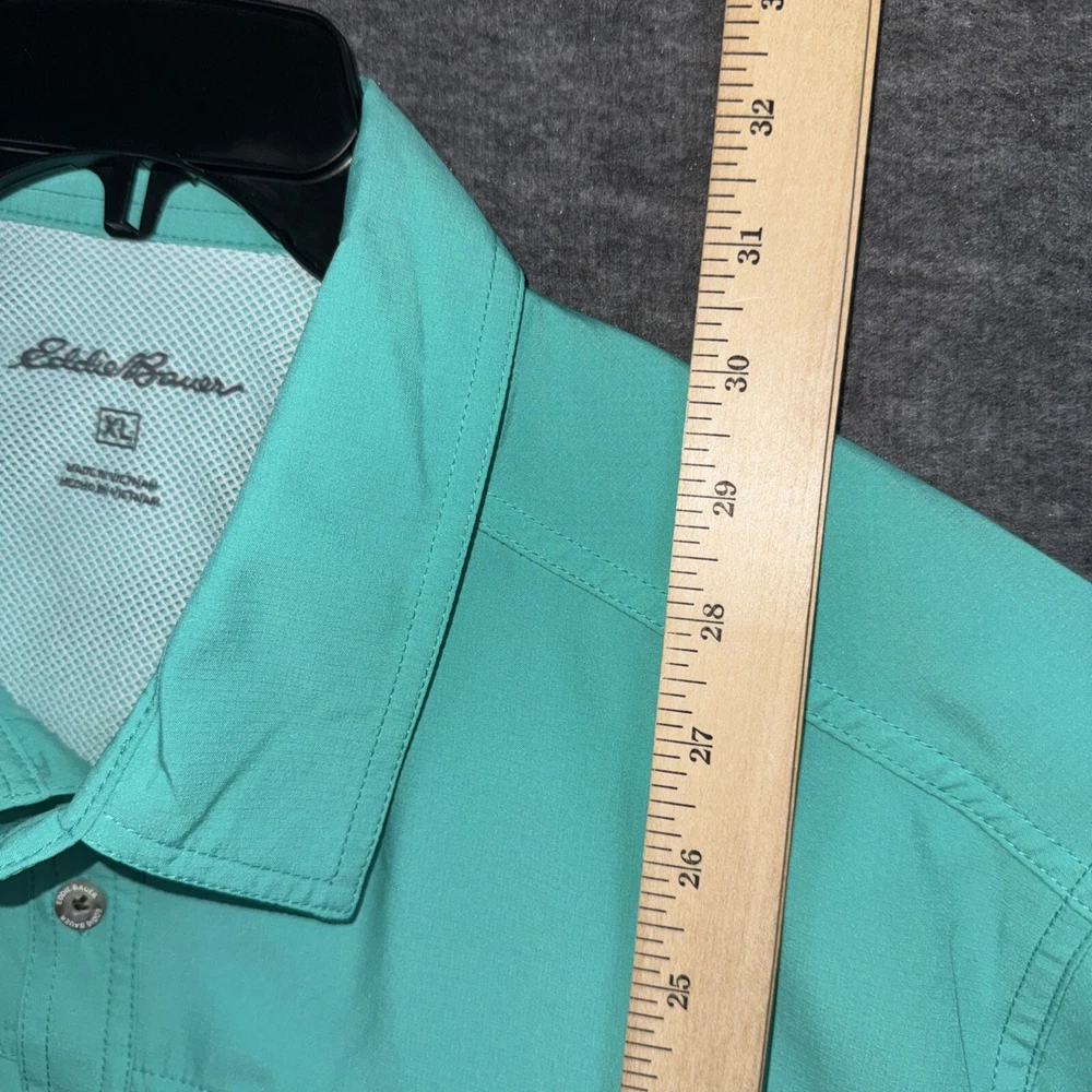 This Eddie Bauer men's fishing shirt is perfect for any outdoor adventure. Made with a blend of polyester and nylon, it features a solid pattern with a collared neckline and short sleeves. The shirt is designed with a button closure and a spread collar style, making it suitable for casual wear, workwear, and travel. The shirt is available in size XL and comes in a beautiful green color with accents of pockets and a logo. It has a regular fit and is machine washable. The shirt is perfect for those who love nature, hunting, adventure, fishing, and hiking. It features sun protection, a vented back, quick dry, moisture-wicking, and is breathable.