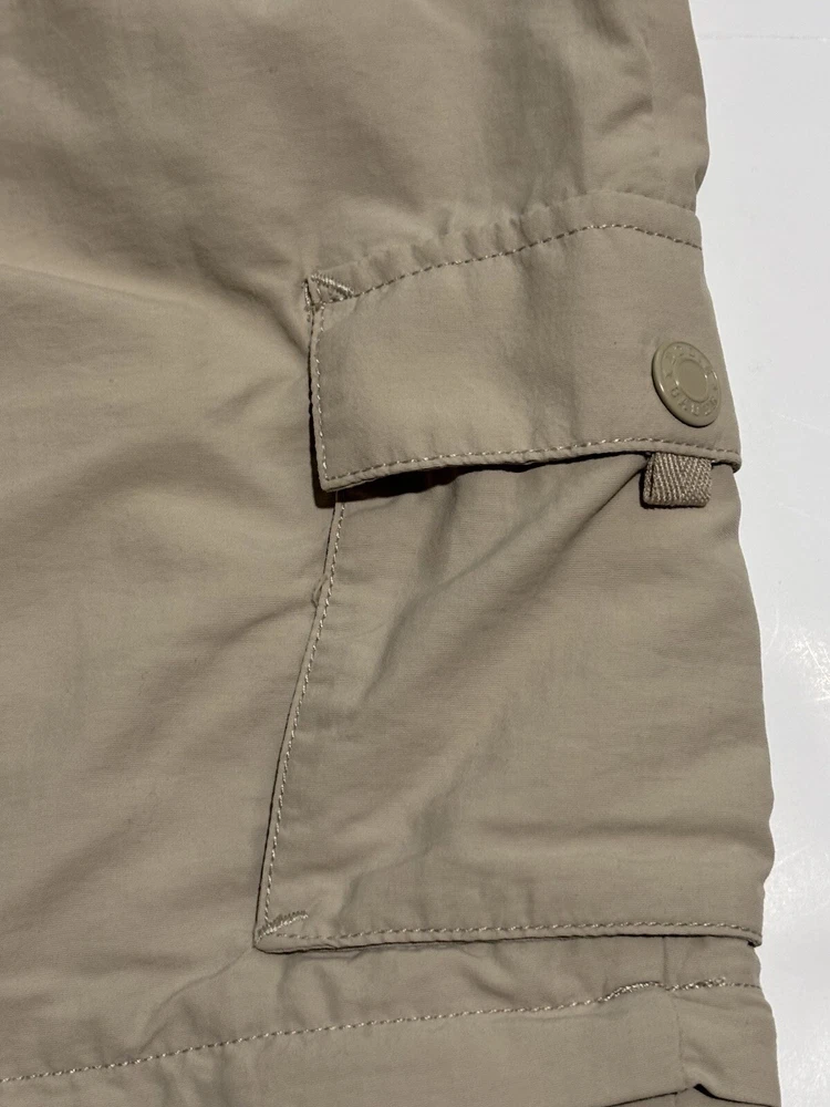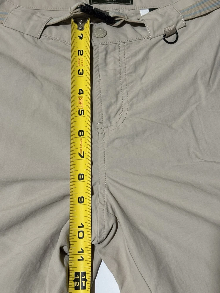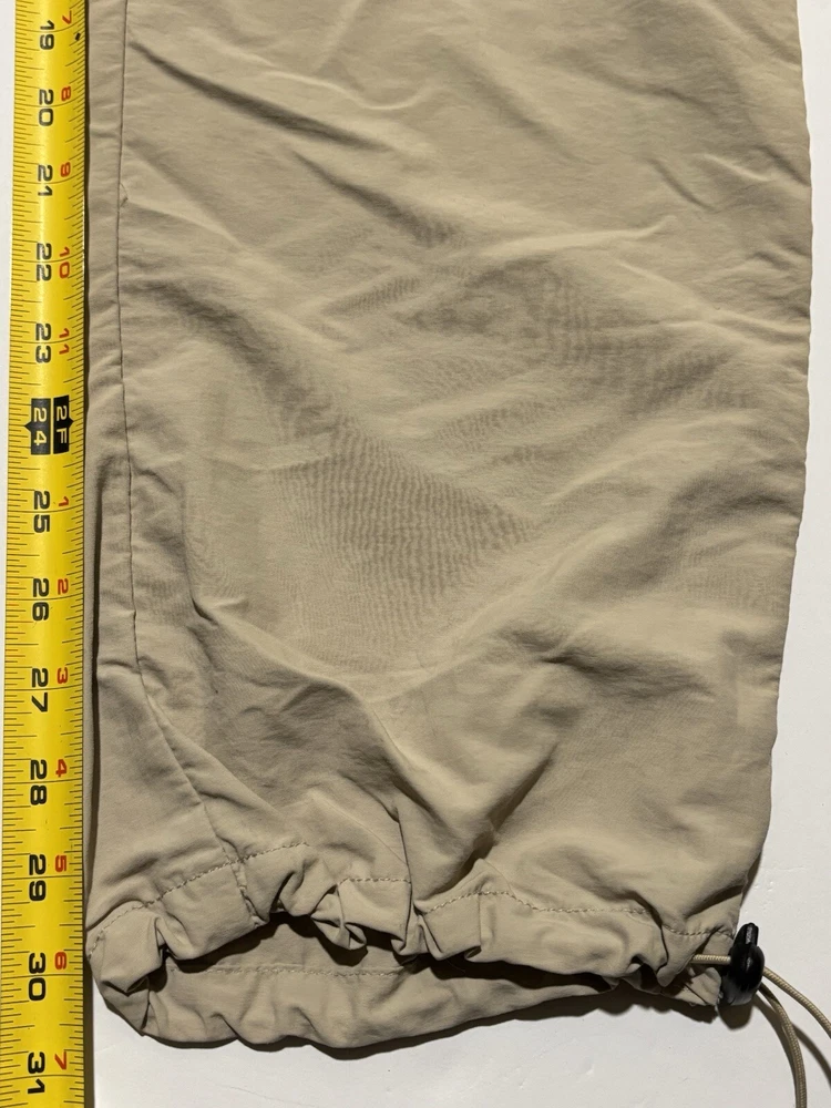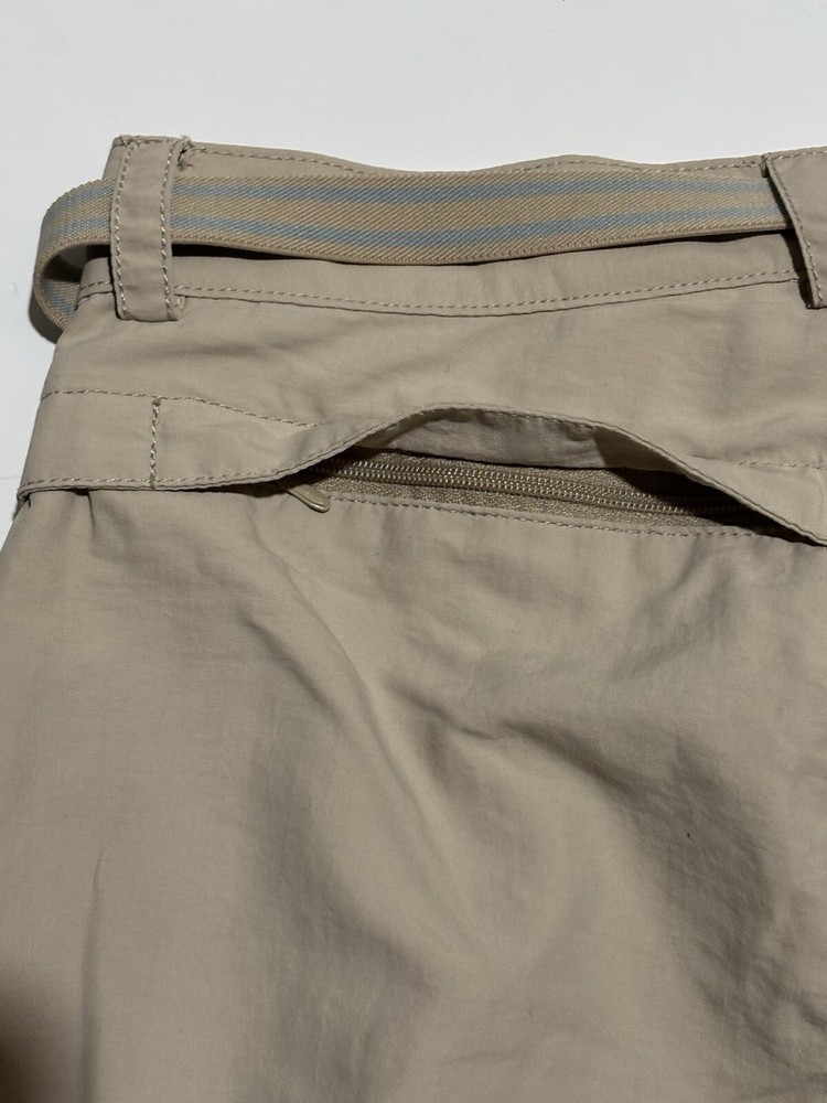 These Eddie Bauer women's size 6 outdoor hiking performance cargo pants are made of lightweight nylon with adjustable features like the waist and ankles. They feature mesh pockets, a colorful belt, and a zipper closure. Ideal for travel, casual wear, or workwear, these beige pants have a straight leg design and a flat front. Perfect for outdoor activities in various seasons.
