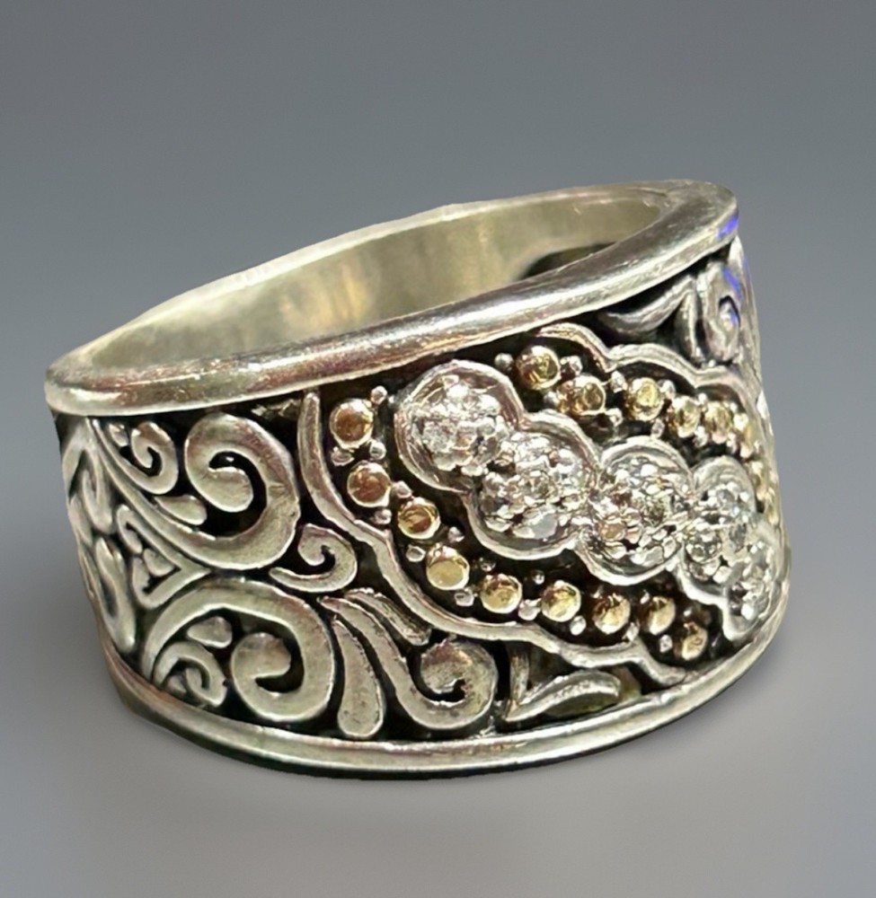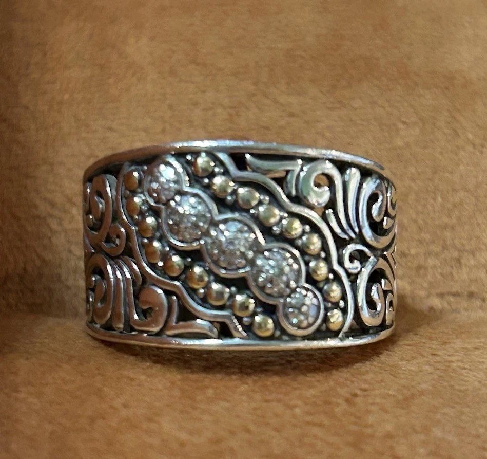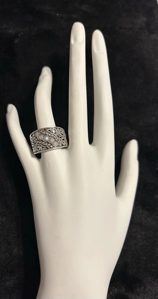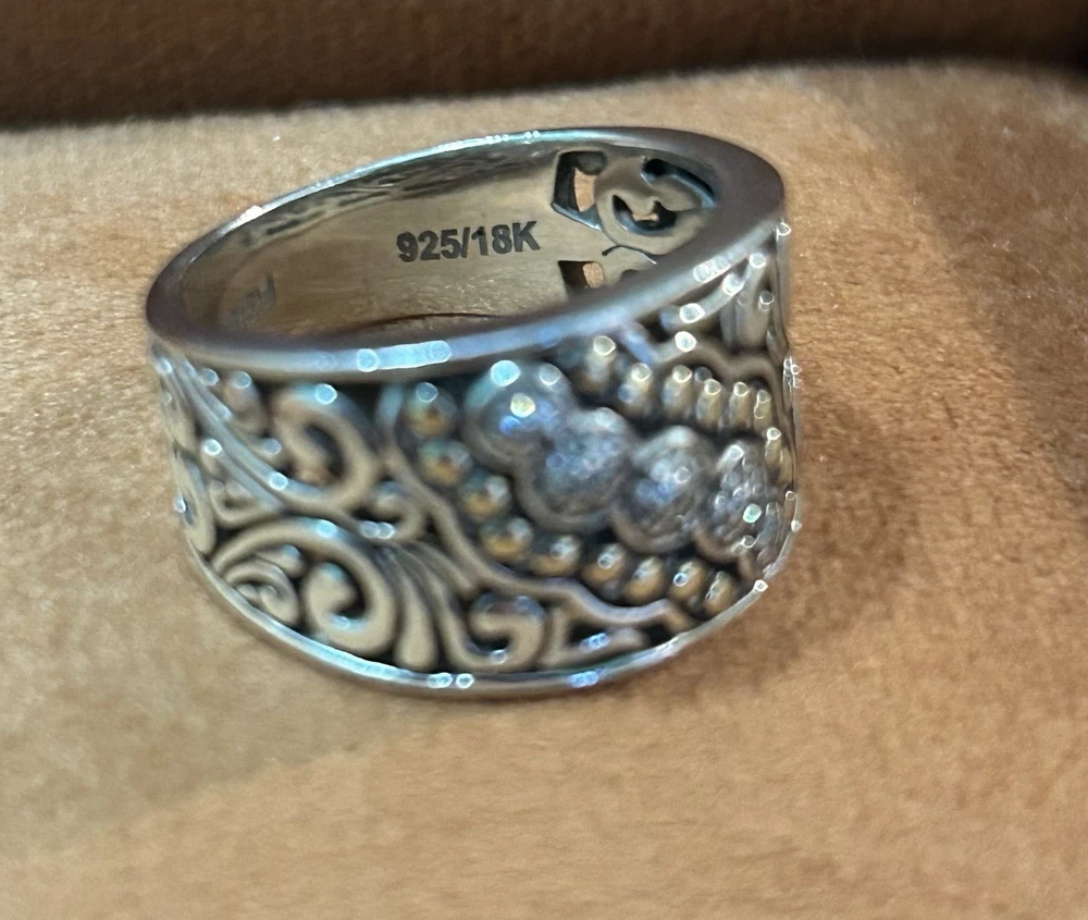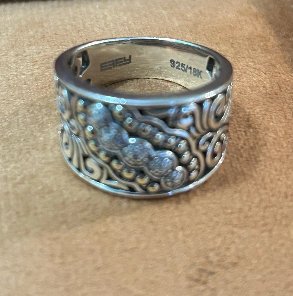 This EFFY 925 Sterling Silver & 18K Yellow Gold Diamond Ring features a stunning white/colorless diamond with a total weight of 0.10TCW. The cocktail style ring is crafted with a combination of sterling silver and 18K yellow gold, making it a luxurious and elegant choice for special occasions like Mother's Day or birthdays. Signed by the brand Effy, this ring is a timeless piece that exudes sophistication and luxury, perfect for adding a touch of glamour to any outfit. “ No original Box”