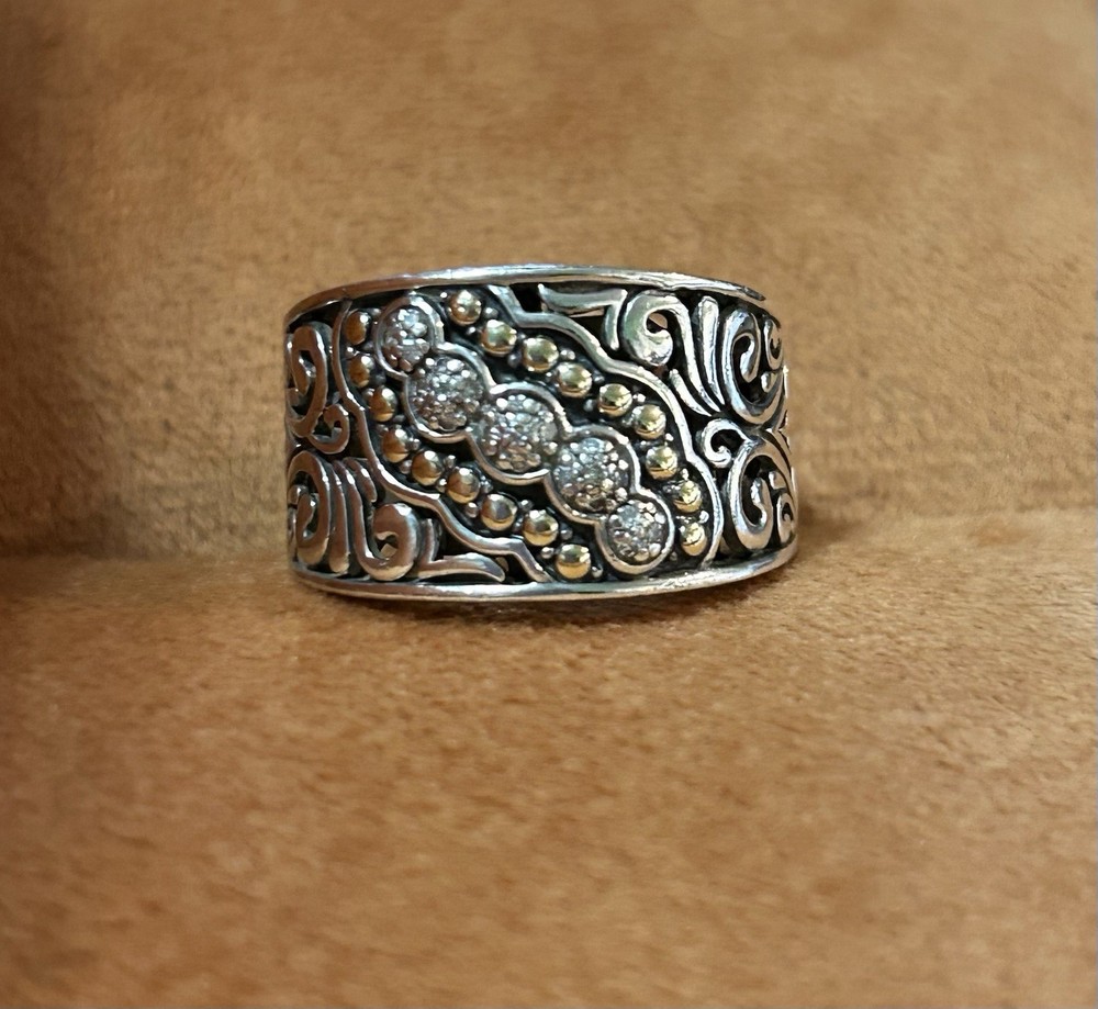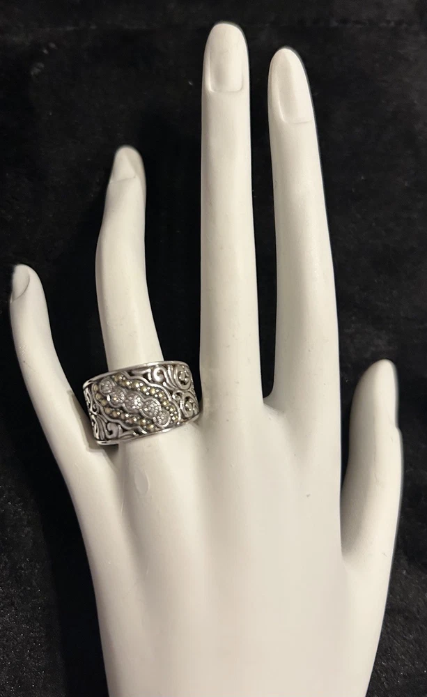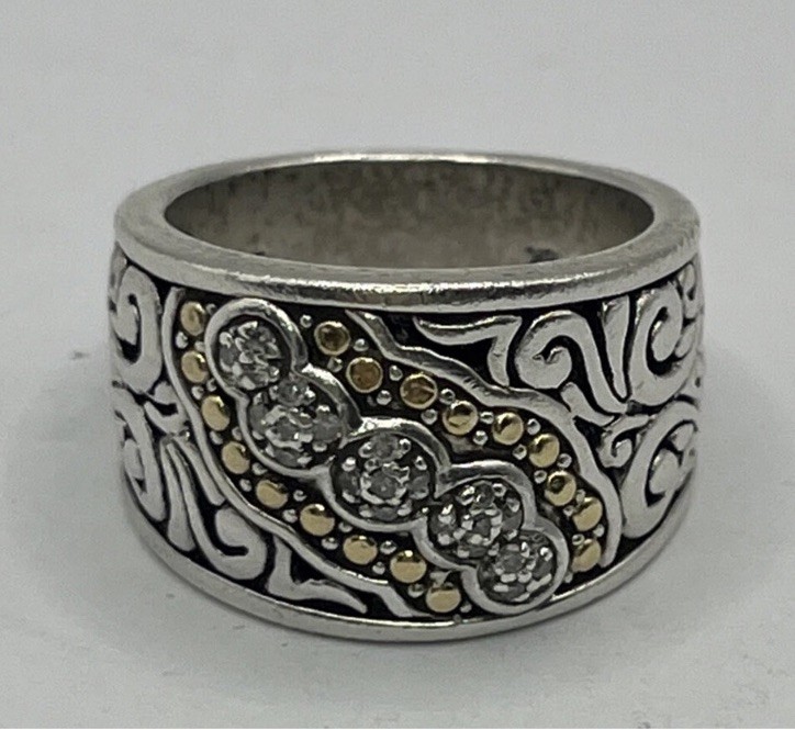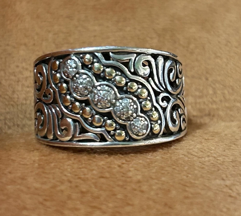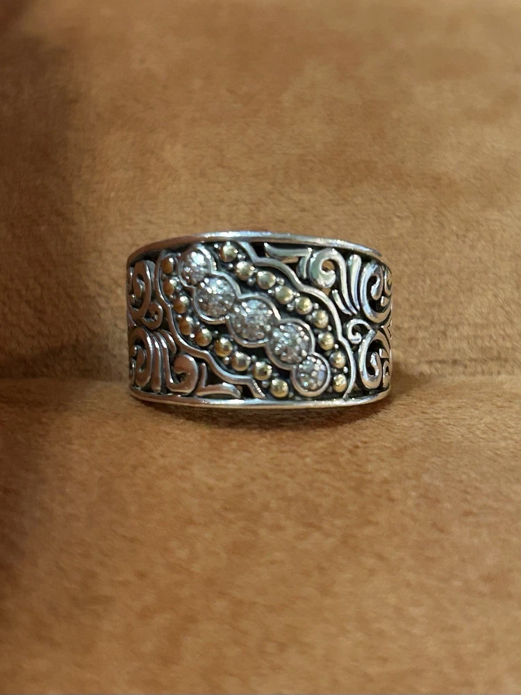 This EFFY 925 Sterling Silver & 18K Yellow Gold Diamond Ring features a stunning white/colorless diamond with a total weight of 0.10TCW. The cocktail style ring is crafted with a combination of sterling silver and 18K yellow gold, making it a luxurious and elegant choice for special occasions like Mother's Day or birthdays. Signed by the brand Effy, this ring is a timeless piece that exudes sophistication and luxury, perfect for adding a touch of glamour to any outfit. “ No original Box”