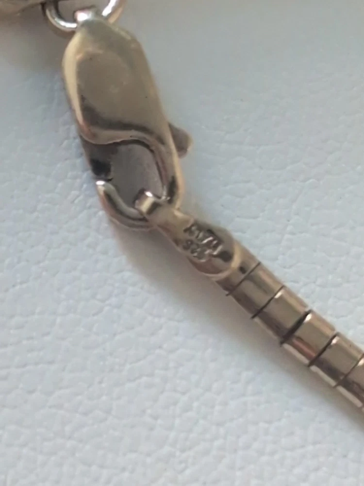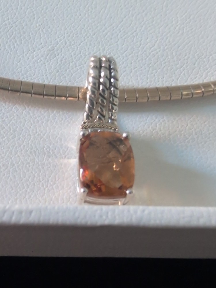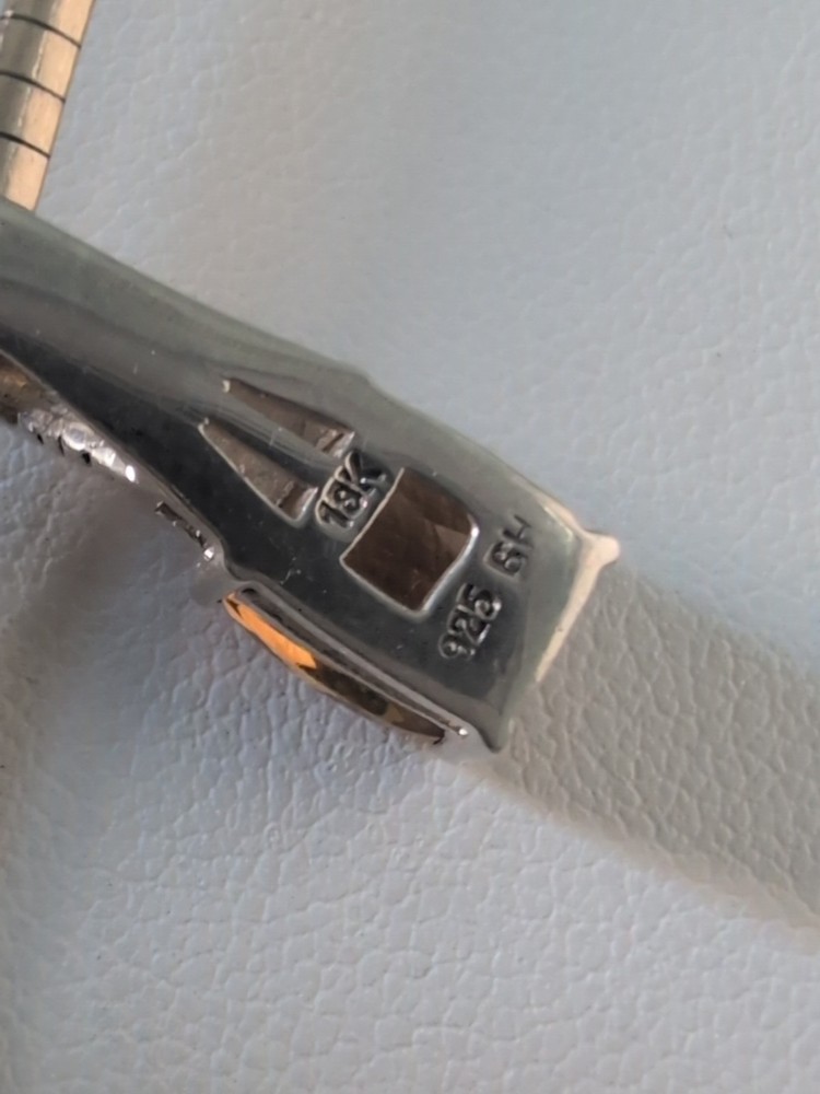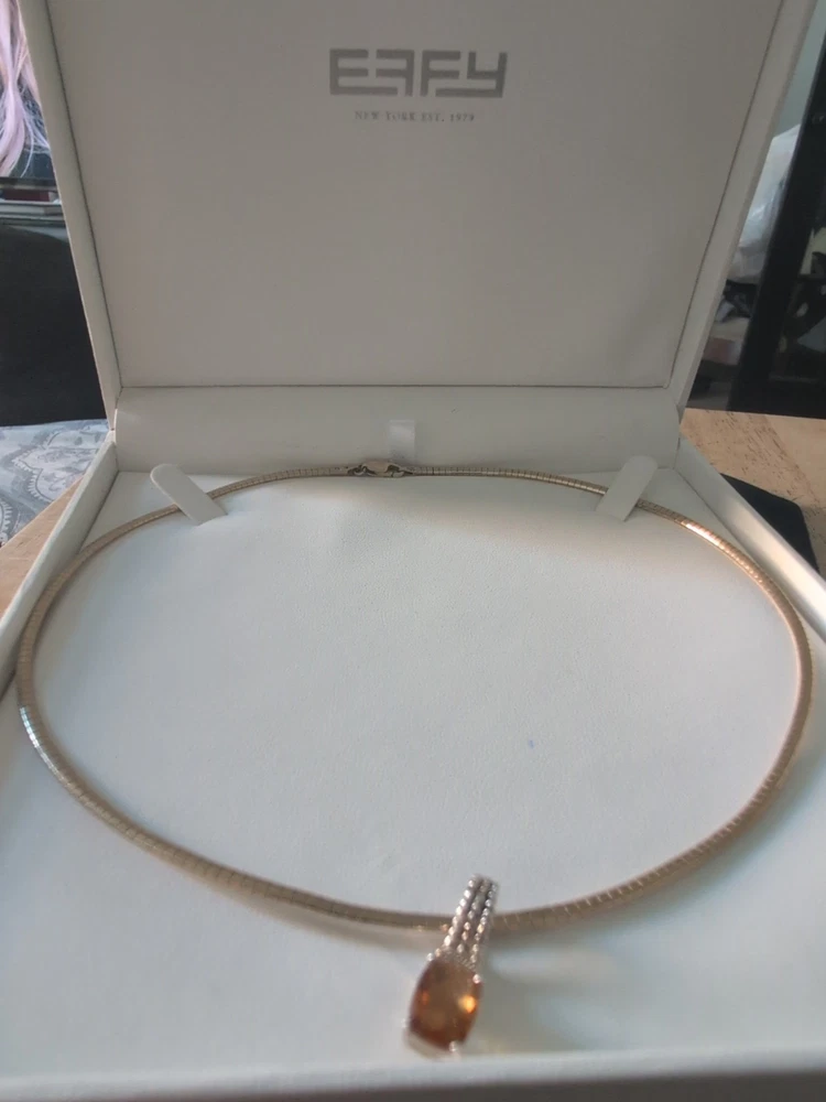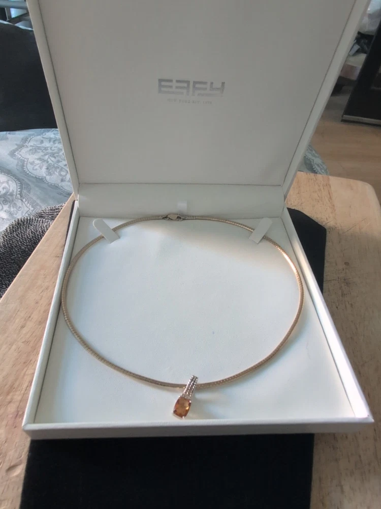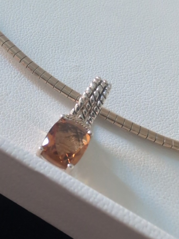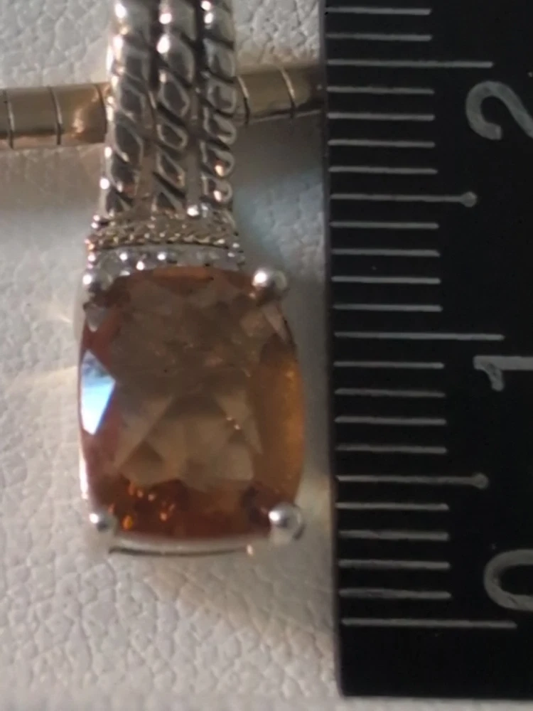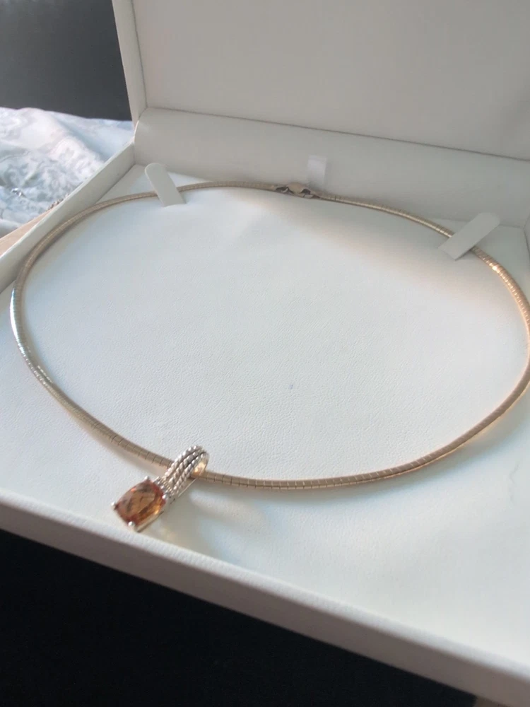 The necklace features a stunning pendant with a rectangular orange Padparadscha Sapphire surrounded by 18k gold and diamonds. The necklace is crafted from 925 sterling silver and includes a secure box closure. This a good condition omega chain with use slight wearing like any tight omega chain. The unique combination of precious gemstones and metals make this necklace a sophisticated and luxurious accessory that is sure to make a statement. The Omega chain is not Effy and adds an elegant touch to the overall design, making it a standout piece for any jewelry collection.!!!