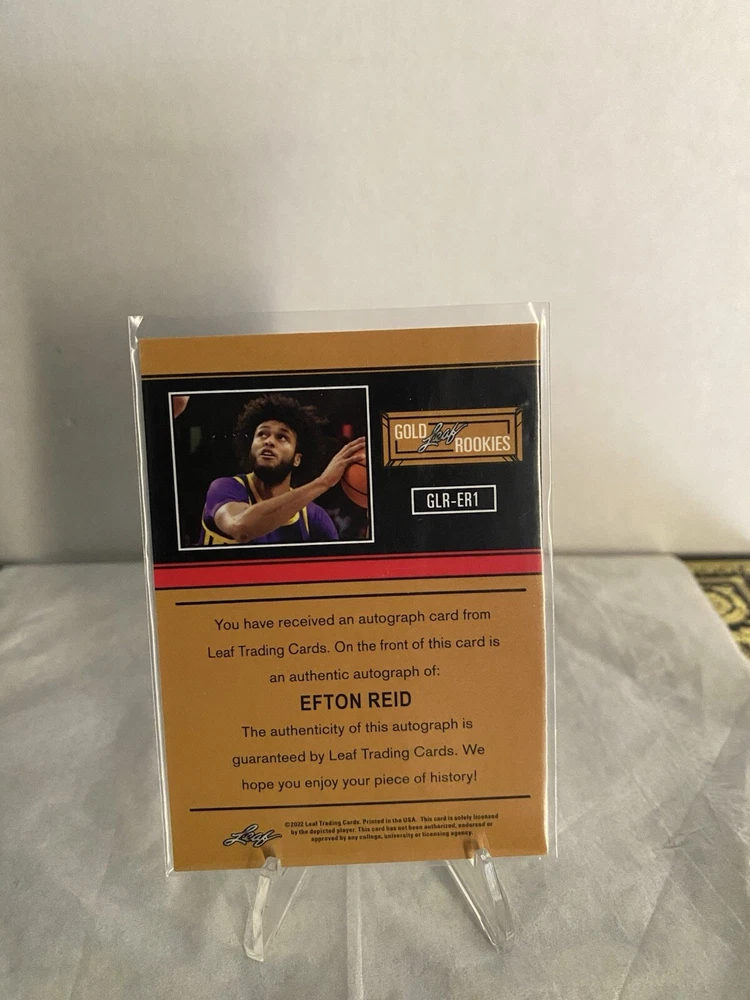 This is a 2022 Leaf Draft trading card featuring Efton Reid III, a rookie player from Wake Forest. The card is a Gold Rookies Autographs edition with an autograph from Reid, numbered out of 99. It is part of the Sports Trading Card set for the 2022 season, showcasing Reid's time with LSU Tigers, Wake Forest Demon Deacons, and Gonzaga Bulldogs in the NCAA.
