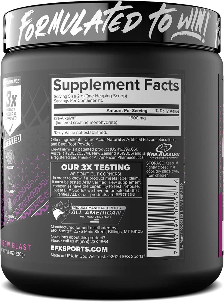 ➤ THE ONLY PH-CORRECT CREATINE MONOHYDRATE Traditional creatine supplements have pH levels below 7, which immediately begin converting to creatinine — a useless waste product — when mixed with a solution. (The lower the pH of the solution, the quicker the conversion.) Kre Alkalyn EFX, however, has a multi-patented pH range of 12-14, resulting in a buffered, stable creatine monohydrate. This means you only need 1.5-3 grams with no loading, no bloating, and no side effects! ➤ GAIN STRENGTH, BUILD MUSCLE & ENHANCE PERFORMANCE Creatine monohydrate is the single most studied sports supplement ever. It’s the top pre-workout and post-workout compound for athletes and bodybuilders who want to improve muscle mass, increase power, enhance performance, and accelerate muscle recovery. Kre Alkalyn EFX is 99.9% pure creatine monohydrate—science-backed, clinically tested, and safe for professional athletes looking for a legal edge! ➤ CONVENIENT POWDER & SCOOP Kre Alkalyn EFX flavored and neutral powders easily mix in water or your favorite drink. We include a scoop that gives you a precise serving with no guessing. Just grab the bottle from your gym bag, scoop, mix, and get to work! ➤ PATENT-HOLDER’S ORIGINAL BRAND Kre Alkalyn EFX was invented by Dr. Jeff Golini, the exclusive formulator of EFX Sports. He developed the patented manufacturing process that produces the ONLY creatine monohydrate with a pH level of 12-14. No other creatine product can make that claim! ➤ WE MANUFACTURE OUR OWN PRODUCTS EFX Sports is part of a very small, elite group of brands that actually make their products themselves. That’s why we can unquestionably guarantee Kre Alkalyn EFX always meets label claims and is 100% banned-substance free. When you use Kre Alkalyn by EFX Sports, you have the purest, most potent creatine product available anywhere!