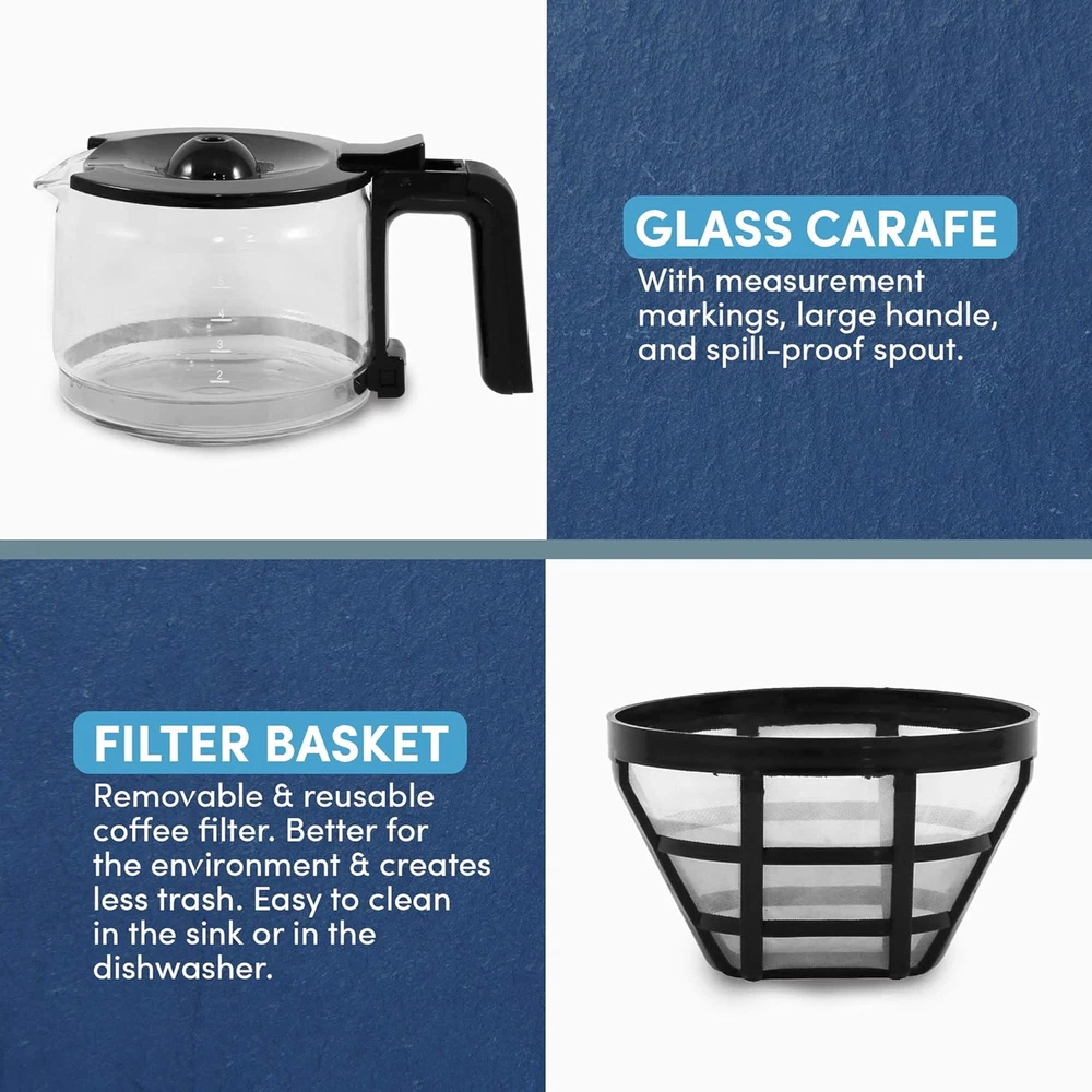 SEMI-TRANSPARENT WATER RESERVOIR holds up to 5 cups of water capacity with a level indicator to always ensure you have enough water ready for brewing. 5 CUP GLASS CARAFE for brewing the perfect quantity of hot fresh coffee for an individual or a small group of people. PAUSE 'N SERVE allows a quick sneak of fresh coffee in the middle of brewing of you're running low on time or just need a quick coffee fix. RE-USABLE FILTER in a swing-out basket is better for the environment and reduces additional cost of paper cone filters. SIMPLE ON/OFF SWITCH with a Power Indicator Light, plus no special programming or settings to complicate the coffee maker function. Start your day off right with the Elite Gourmet 5-Cup Coffeemaker. With its compact and sleek design that takes up limited counter space and fits into any nook. It is perfect for small spaces such as office kitchens, dorm rooms or recreatiol vehicles. Quickly and effortlessly brew your favorite coffee to jump start your day. No need to stop at a local coffee house to buy a cup of joe just to make it through the day. You can also use your own coffee grounds in the included reusable filter. Simply add fresh water for each brew. Cleanup is a cinch, all removable parts and accessories are dishwasher safe. Enjoy a cup of joe on the go with the Elite Gourmet 4-Cup Coffeemaker