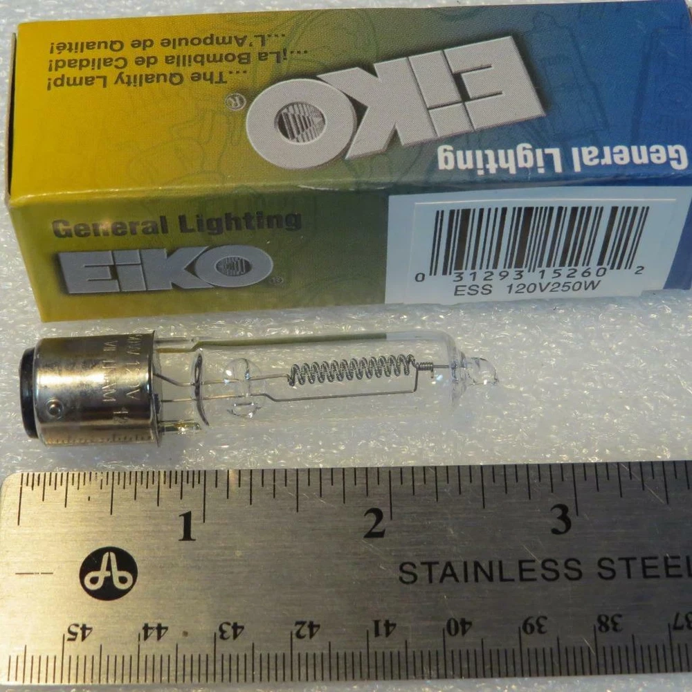 Vintage EIKO Modeling Projection Pool Lamp Made in Vietnam ( New in Box) This item is new in the box. Item has never been sold, never been used. Boxes look like they have been on the shelf 20+ years Model ESS This is a EIKO ESS - 250 Watts - 120 Volts. Modeling Lamp. It has an average life span on 2000 Hours. This item has been in stock in an Electronics Parts store too long and must be sold. It is new in the box. This is a non-returnable lamp which is standard in the industry. If it does not work as brand new we will send a return label and inspect the bulb. If it has never been on it's easy to tell. If the bulb has flashed from too much voltage or if the element has melted from going past it's life span this is not returnable for refund or exchange. EIKO ESS 120V 250W Modeling Pool Lamp Bulb AVG Life 2000Hrs Made in Vietnam EIKO ESS 120V 250W Modeling Pool Lamp Bulb AVG Life 2000Hrs Made in Vietnam Click images to enlarge Description Vintage EIKO Modeling Projection Pool Lamp Made in Vietnam ( New in Box) This item is new in the box. Item has never been sold, never been used. Boxes look like they have been on the shelf 20+ years Model ESS This is a EIKO ESS - 250 Watts - 120 Volts. Modeling Lamp. It has an average life span on 2000 Hours. This item has been in stock in an Electronics Parts store too long and must be sold. It is new in the box. This is a non-returnable lamp which is standard in the industry. If it does not work as brand new we will send a return label and inspect the bulb. If it has never been on it's easy to tell. If the bulb has flashed from too much voltage or if the element has melted from going past it's life span this is not returnable for refund or exchange. Images sell! Get Supersized Images & Free Image Hosting Create your brand with Auctiva's Customizable Templates. Attention Sellers - Get Templates Image Hosting, Scheduling at Auctiva.com. Track Page Views With Auctiva's FREE Counter