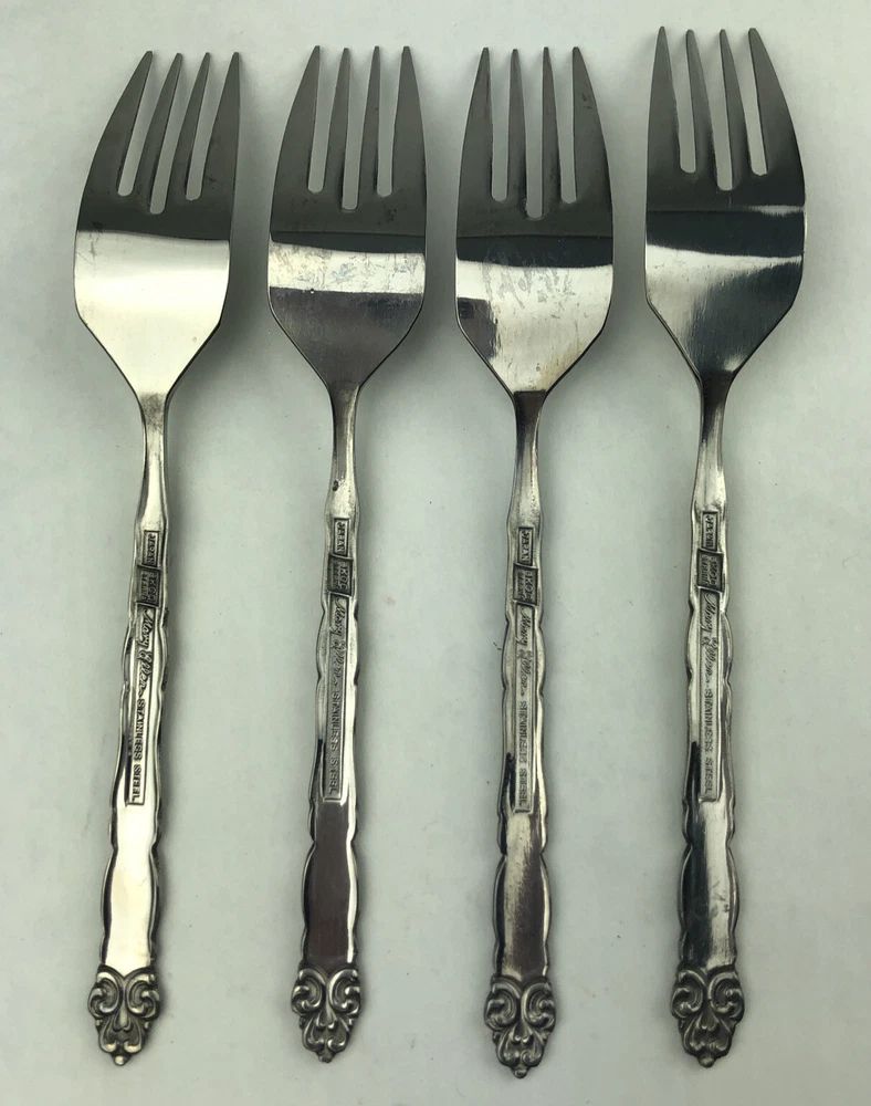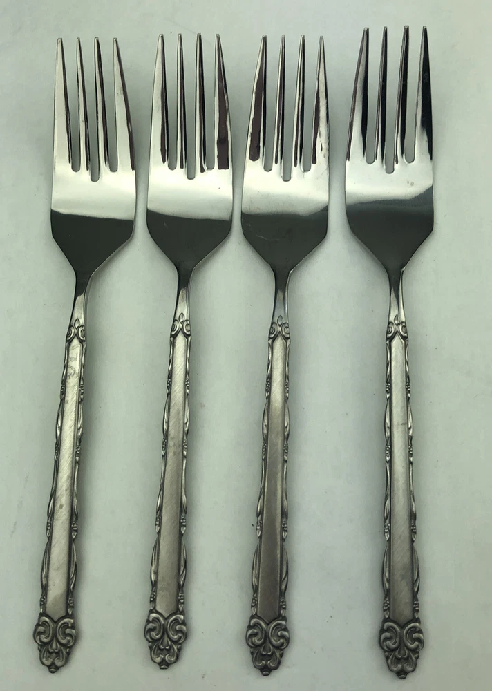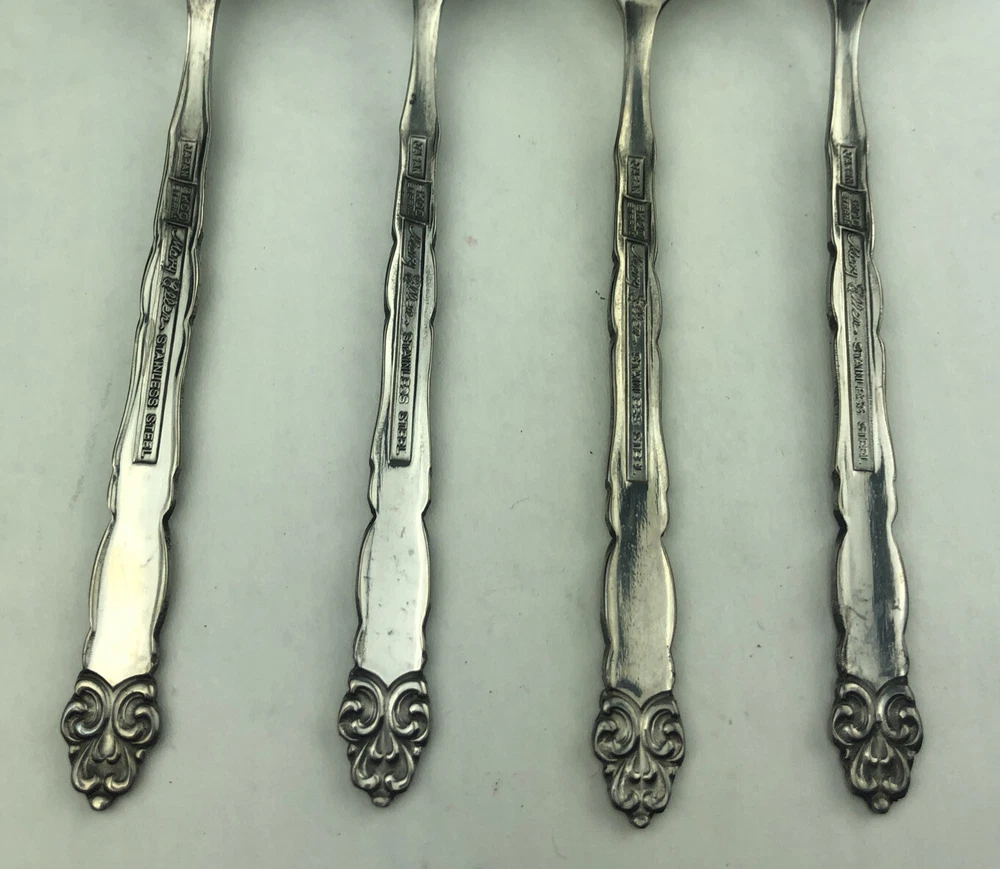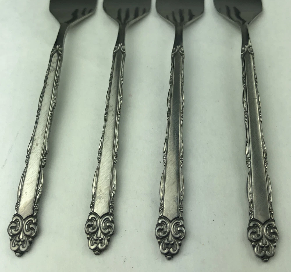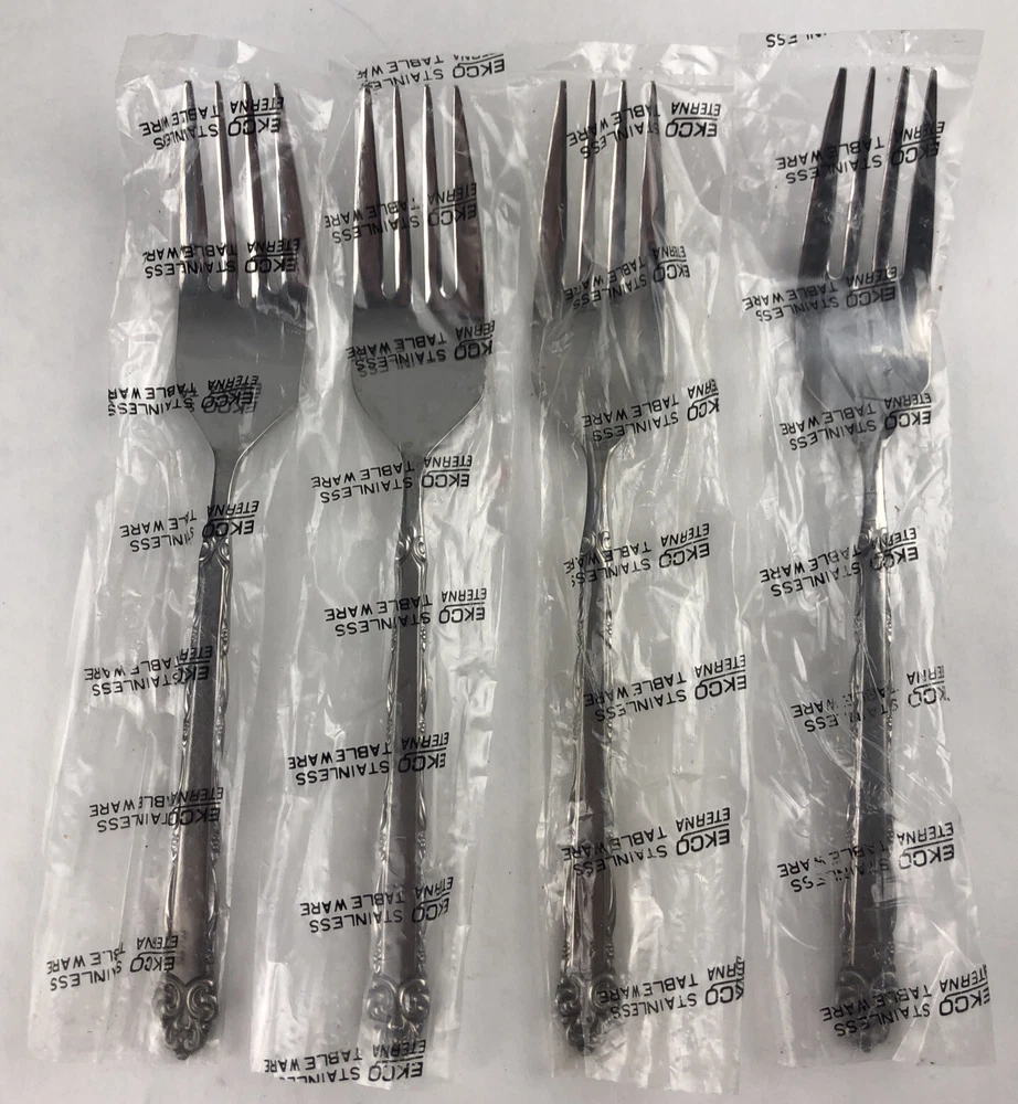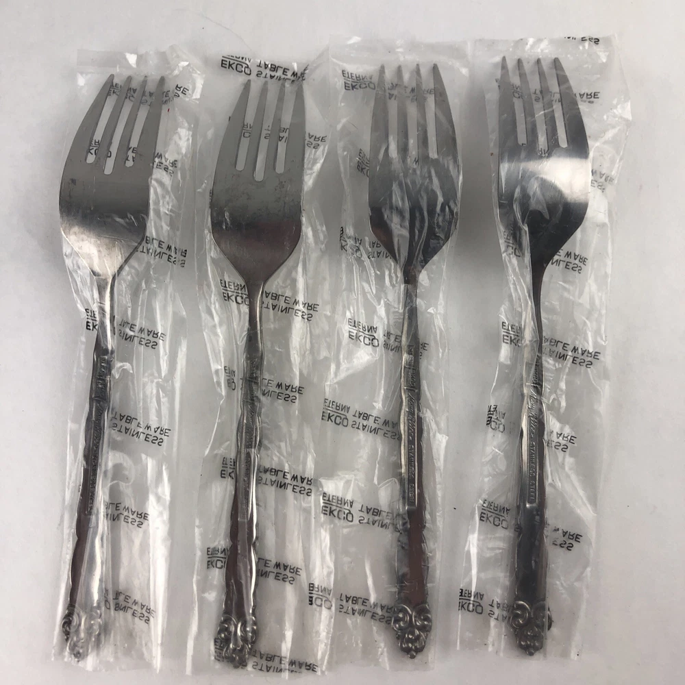 Vintage EKCO ETERNA MARY ELLEN Stainless Flatware 4 SALAD FORKS. Made in Japan. Glossy, will need a light polishing. Please see pictures for details as this is part of my description.