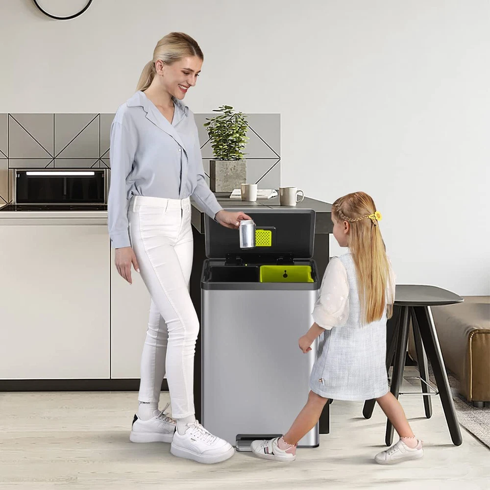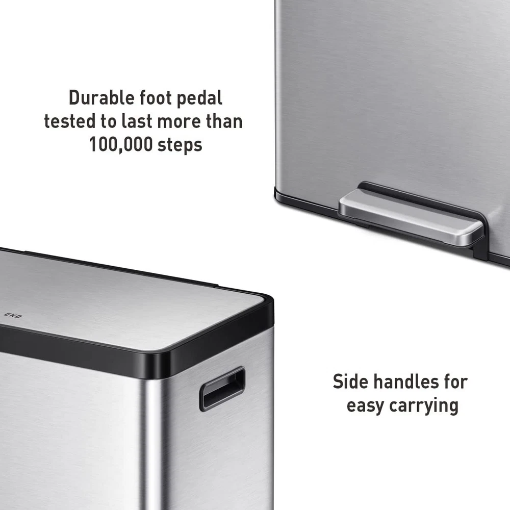 EKO EcoCasa II Rectangular Kitchen Step Trash Can, 20L+20L Dual Compartment Recycling Bins, Stainless Steel Lid and Pedal, Odor-Proof, Fingerprint Resistant Product information Brand EKO Capacity 40 Liters Color Black, Grey Opening Mechanism Step-On Material Stainless Steel, Plastic Recommended Uses For Product Kitchen Room Type Kitchen Special Feature Dual Compartment, Pedal, Removeable Bucket, Slow Close Lid, Compact, Sturdy, Portable Shape Rectangular Finish Type Stainless Steel Item Weight 17 Pounds Product Dimensions 17.7"L x 13.1"W x 25.8"H With Lid Yes Unit Count 1.0 Count Manufacturer EKO Global Trade Identification Number 06951800667464 Size 20L+20L Item Weight 17 pounds Country of Origin China Item model number EK9138MT-20L+20L Finish types Stainless Steel Number of pieces 1 Included Components Stainless Steel Trash Can Dual Compartment Trash Can - Easily distinguish between waste and recyclables with 2 removable 20 liter, color-coded inner buckets. Superior Stainless Steel Build- Our heavy-duty stainless steel garbage cans for kitchen boasts an ultimate fingerprint-resistant stainless steel construction that provides a durable and visually appealing look for any home decor styles. Ultimate Fingerprint Resistance - Say goodbye to smudges and hello to a flawless exterior that stays immaculate. The anti-fingerprint stainless steel finish keeps your space clean and stylish. Streamlined Rectangular Design- Our space-conscious dual trash can with recycling bin nestles perfectly against your wall, seamlessly optimizing your kitchen's layout. Step On With Confidence- Our durable stainless steel foot pedal is built to last over 200,000 times, ensuring smooth and reliable operation for years to come! The EcoCasa II Recycle Step Trash Can 20L + 20L streamlines all the sleek styling of our popular EcoCasa model into a space-saving slimmer profile that sits flush up against your wall or cabinet. The dual compartment configuration offers two equal 20L (5. 3 gallons each) inner liners to easily separate recyclable trash from regular household waste. The fingerprint resistant stainless steel finish extends to the Soft Close lid, which operates on a durable, cantilever foot pedal mechanism. And the Stay Open feature holds the lid up when you need it with just a slide of the button. Each removable inner bucket has a bag stabilizer to keep your trash bag from slipping down, so taking out the trash and recyclables is a breeze. There is a built-in deodorizer compartment to help keep things fresh between bag changes. Capacity: 20L + 20L (5.3G + 5.3G). Dimensions: 17. "W X 13. 1" D X 25. 8" H. US-based customer service support team. Shipping We offer FREE shipping on all orders! We ship within Three business days of payment, usually sooner. We use a selection of shipping services such as UPS, FedEx, USPS etc. We only ship to the lower 48 states, no APO/FPO addresses or PO Boxes allowed. Local pickups and combined shipping options are not provided at this time. Return You can return a product for up to 30 days from the date you purchased it. Any product you return must be in the same condition you received it and in the original packaging. Please keep the receipt. Payment We accept payment by any of the following methods: PayPal Please pay as soon as possible after winning an auction, as that will allow us to post your item to you sooner! Feedback Customer satisfaction is very important to us. If you have any problem with your order, please contact us and we will do our best to make you satisfied. Contact Us If you have any queries, please contact us via ebay. We usually respond within 24 hours on weekdays. Please visit our eBay store to check out other items for sale! Thank you for shopping at our store.