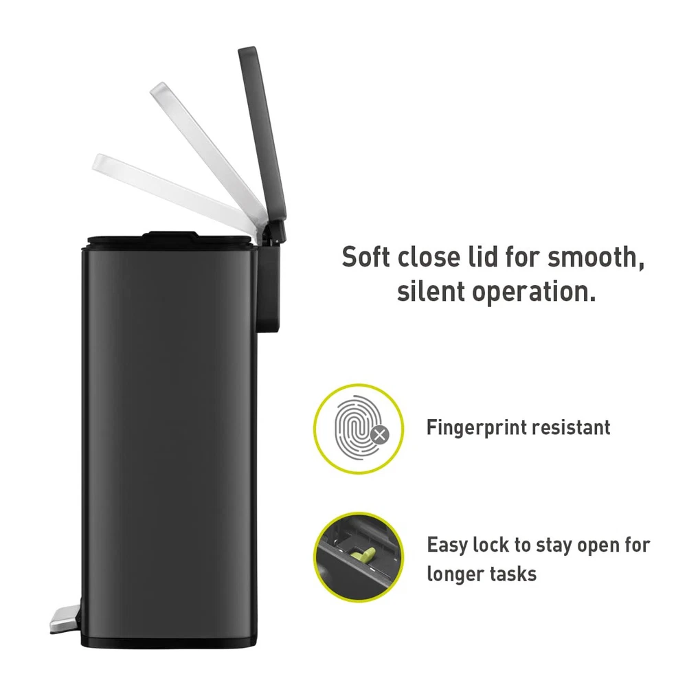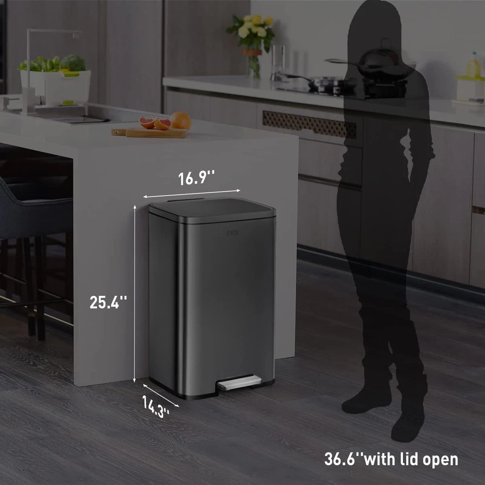The Madison Matte Black step kitchen trash can from EKO - constructed of quality stainless steel with a matte black painted finish that complements your kitchen style with an refined, updated look that also hides smudges and fingerprints. The Madison 13.2 Gallon (50 Liter) standard size trash can offers convenient, hands-free trash disposal in an understated sheen that works with your stainless, white, black, any appliances and decor. The rugged step pedal mechanism is built to withstand years of daily use, and the bi-force damper soft open and close lid prevents slamming and banging. Stay open locking lid allows you to hold the lid open longer when necessary. Use your favorite deodorizer in the built-in compartment on the underside of the lid to keep your kitchen smelling fresh between bag changes. The removable polypropylene inner liner has a cut out bag fixer slot to tuck in your trash bag so it won't slip down into the can. So easy to maintain with a simple wipe with a soft cloth. Generous 50L (13.2 Gallon) capacity takes standard kitchen trash bags so no special orders required. EKO brand extra-strong drawstring kitchen trash bags are available: Size Code F. Look for EKO model # EK33706B. Dimensions: 16.9"W x 14.3"D x 25.4"H. Height with lid open: 36.6" Ultimate fingerprint resistancy - Crafted from superior rolled steel with a refined, fingerprint-resistant matte black powder coat, this trash can embodies durable elegance, blending seamlessly into any home or office setting while offering a clean, stylish waste disposal solution. Whisper-quiet Closing - The rugged step pedal mechanism is built to withstand years of daily use, and the bi-force damper soft open and close lid prevents slamming and banging. Stay Open and Do Your Thing - This kitchen garbage can boasts an easy-to-use lid lock, ensuring it stays open as long as needed. Quality Construction Built to Endure - Our durable foot pedal is built to last over 200,000 times, ensuring smooth and reliable operation for years to come! Elevated Inner Bucket with Handles: The Madison kitchen or office trash can features a raised inner bucket with convenient handles, ensuring swift and hassle-free bag replacement.