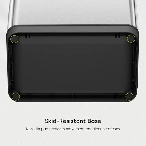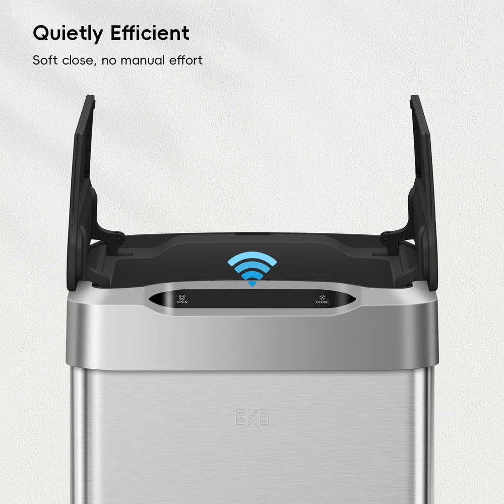 Premium Motion Sensor Technology - Experience the smoothest, most seamless lid opening and closing technology with this EKO hands-free automatic trash can. Ultimate Fingerprint Resistance - Say goodbye to smudges and hello to a clean flawless exterior that stays immaculate. The anti-fingerprint stainless steel finish keeps your space clean and stylish. Space-Saving Vertical Design - Save space with a vertical layout, and the dual-wing lid needs less room overhead when opening. 25% More Capacity - No liner design maximizes capacity by offering 25% more room to dispose of the trash. Long-lasting Power - Use with AA alkaline batteries and can last up to 8 months of use, making our kitchen garbage can eco-friendly and your wallet happy.
