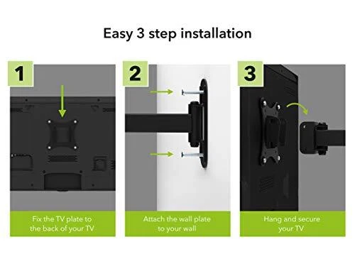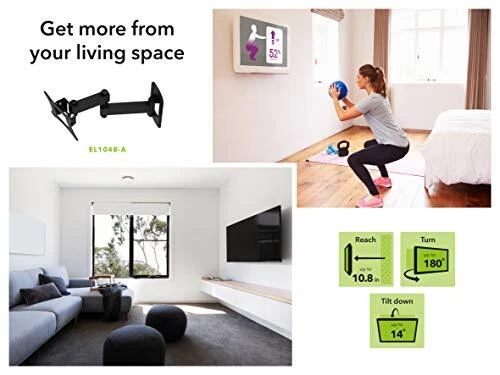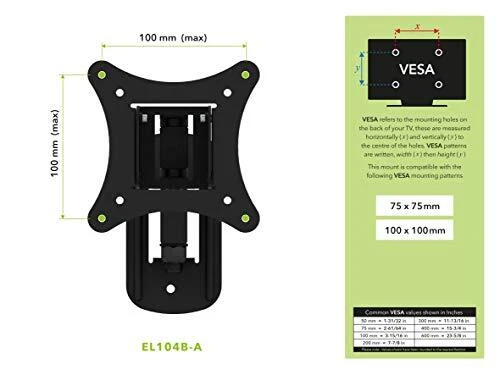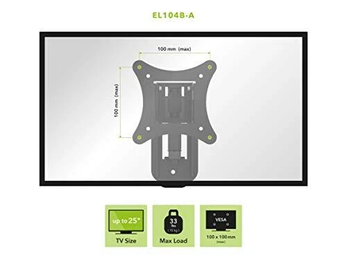 Return Policy Fast Delivery Trusted seller EL104B-A Multi Position, Full Motion, Long Extension TV Wall Mount for 12 Inch to 25 Inch TV or Monitor, Black, Universal Wall Mounting Bracket, VESA 50x50 to 100x100, Easy to Install Product Description Fits TVs up to 25 Inches and 33 lbs Pan, Swivel, Tilt, and extend TV Wall Mount with 2.05" Mounting Profile & 10.83" Extension Supports TVs up to 33 lbs 50x50 - 100x100mm VESA Mounting Patterns East Installation. Instructions and all hardware included Shipping Returns Payment Shipping Shipping is FREE to all addresses other than APO/PO boxes in the lower 48 states. All our stock ships from US-based warehouses. Shipped via USPS or UPS (depending on location and package weight) Unless stated otherwise, all orders will ship within 24-72 hours of your payment being processed. Check our feedback to see the great reviews of FAST shipping we offer. Returns Seller does not accept returns Payment We currently accept payment via eBay managed payments only. Once payment is cleared, we will dispatch your shipment within 1-3 business days. Please refer to the "Shipping" tab for more information regarding shipping speed to your destination.