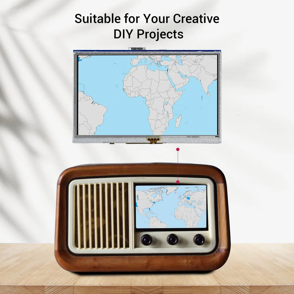 5 inch monitor for Raspberry Pi has a 800*480 LCD screen, high resolution picture, large viewing angle, fast response time, full color display. It supports manual backlight control, backlight switch can be turn off to lower power consumption The screen is resistive touch screen which comes with a touch pen for easy use. When used as Pi touch screen, compatible with Raspberry Pi 5 4 3B+ 3B 2B+, directly plugged, I/Os for touch function and power supply, HD interface for display This mini lcd display can also work with standard HDMI-compatible devices such as PC monitor, please adjust output resolution to 800*480 and use 5V2A power supply to power it; the touch function is not available in this case Package included: 5 inch touchscreen x1, CD x1, touch pen x1, HD adapter x1, copper pillars (4PCS) x1