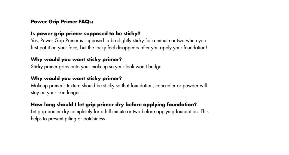 SKIN-SMOOTHING and GRIPPING PRIMER: Your makeup. It’s not going anywhere. Prep skin with this gel-based face primer that has the power to grip your makeup while giving skin a natural finish for a smoother complexion. FOR ALL SKIN TYPES: Our Power Grip Primer's formula goes on clear with a translucent finish for all skin types and skin tones. It is also non-comedogenic (does not clog pores.) MOISTURIZES WHILE PRIMING: Infused with powerhouse ingredients like Hyaluronic Acid to retain moisture for a plump complexion, this makeup primer moisturizes, preps, and smoothes to perfection, improving the look and feel of your skin. HOW TO USE: Apply evenly to face before makeup using your fingertips to pat into skin. The warmth of your fingers will help the product melt into skin for even application. Allow 30 seconds to set before applying makeup. Stop use if irritation. SKIN-LOVING INGREDIENTS: All e.l.f. products are made from skin-loving ingredients you want, minus the toxins you don’t—all at good-for-you prices. All e.l.f. products are 100% cruelty-free and Vegan. What it is: A gel-based, hydrating face primer that smoothes skin while gripping your makeup. Why we love: Gel primer formula grips makeup Gives skin a soft-focus effect Enriched with hydrating ingredients like Hyaluronic Acid Translucent finish gel primer works on all skin types and skin tones Key Ingredients: Hyaluronic Acid - Helps skin retain moisture for a plump complexion Your makeup? It’s not going anywhere. Prep skin with this gel-based face primer that has the power to grip your makeup while giving skin a soft-focus effect for a smoother complexion. Infused with powerhouse ingredients like Hyaluronic Acid, this makeup primer moisturizes, preps, and smoothes to perfection, improving the look and feel of your skin. The formula goes on clear, making it the ideal makeup application base for all skin types and skin tones. Great for: All skin types All e.l.f. products are made from skin-loving ingredients you want at good-for-you prices. All e.l.f. products are 100% vegan, cruelty-free, and leaping bunny certified. Because kindness is chic. Ingredients: Water (Aqua), Butylene Glycol, Glycerin, Peg-150 Distearate, Polysorbate 80, Niacinamide, Rosmarinus Officinalis (Rosemary) Leaf Water, Melissa Officinalis Flower/Leaf/Stem Water, Mentha Piperita (Peppermint) Leaf Water, Sodium Hyaluronate, Sodium Ascorbyl Phosphate, Menthol, Pentylene Glycol, Propylene Glycol, Peg-240/Hdi Copolymer Bis-Decyltetradeceth-20 Ether, Peg-40 Hydrogenated Castor Oil, Phenoxyethanol, Ethylhexylglycerin, Caprylyl Glycol, Disodium Edta, Trideceth-9, 1.2-Hexanediol May Contain: Blue 1 (Ci 42090), Yellow 5 (Ci 19140).