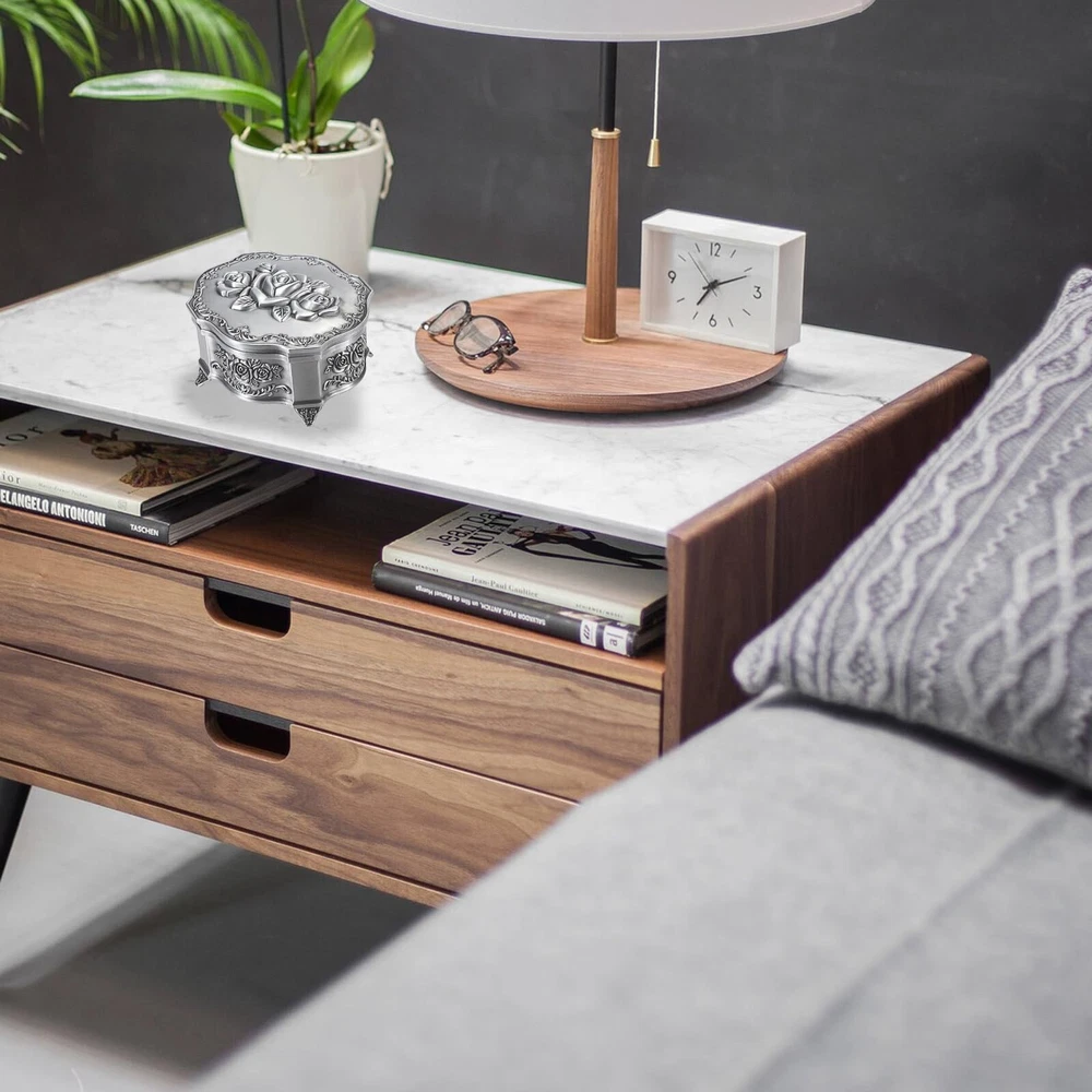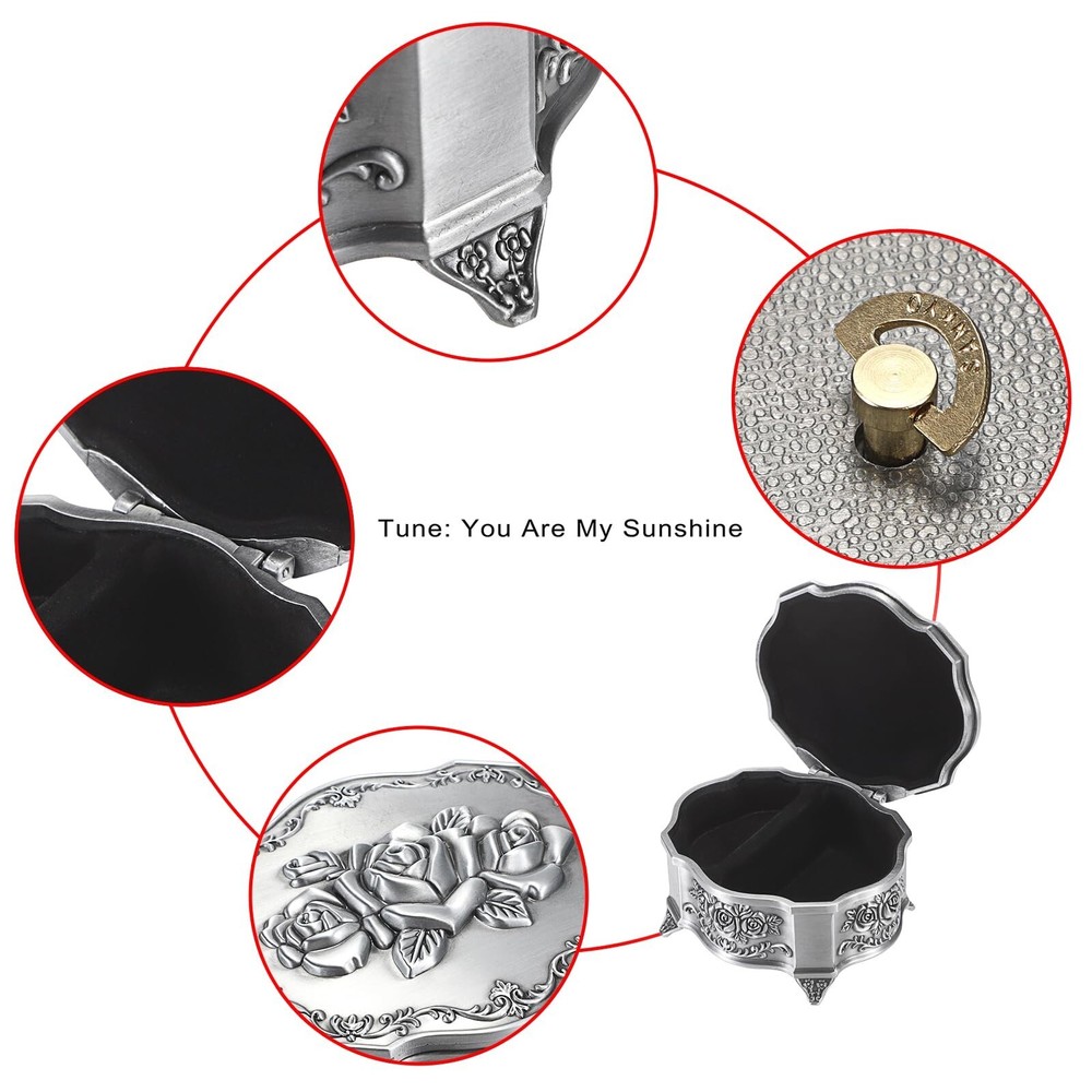 ELLDOO Vintage Music Box, Silver Metal Musical Jewelry Box Keepsake Box, Small Trinket Storage Organizer Jewelry Storage Box Gift for Girl Women (Tune: You are My Sunshine) - Buy Now with Fast Shipping! ELLDOO Vintage Music Box, Silver Metal Musical Jewelry Box Keepsake Box, Small Trinket Storage Organizer Jewelry Storage Box Gift for Girl Women (Tune: You are My Sunshine) Product Details Color: Silver Brand: ELLDOO Material: Metal Style: Antique Special Feature: Musical Recommended Uses For Product: Earring Product Dimensions: 5.12"D x 3.54"W x 2.16"H Target Audience: adult Shape: Polygonal Finish Type: Chrome Color: ‎Silver Brand: ‎ELLDOO Material: ‎Metal Style: ‎Antique Special Feature: ‎Musical Recommended Uses For Product: ‎Earring Product Dimensions: ‎5.12"D x 3.54"W x 2.16"H Target Audience: ‎adult Shape: ‎Polygonal Finish Type: ‎Chrome Inner Material: ‎Metal Number of Drawers: ‎1 Item Weight: ‎380 Grams Number of Compartments: ‎1 Jewelry Storage Type: ‎Jewelry Box Number of Items: ‎1 Manufacturer: ‎ELLDOO Occasion: ‎Valentine's Day Mounting Type: ‎Table Top Closure Type: ‎Latch Part Number: ‎NW7NI7-US391 Item Weight: ‎13.4 ounces Country of Origin: ‎China Item model number: ‎NW7NI7-US391 Finish: ‎Chrome Item Package Quantity: ‎1 Special Features: ‎Musical Included Components: ‎Musical Box Batteries Included?: ‎No Batteries Required?: ‎No Date First Available: July 3, 2024 Key Features ✅ Product Info - Dimensions(LxWxH): 4.5" x 3.9" x 2.6". Not only can play music, but also can hold jewelry. Packing included: 1 x Metal Music Box (Jewelry are not included) ✅ Romantic Music Box - This music box was made of quality beige metal, strong and sturdy.There is a silver rose pattern on the surface of the music box, which adds a romantic atmosphere ✅ Music Theme - Tune: You Are My Sunshine.This music jewelry box is ideal gift for your lovers on Birthday, Wedding, Anniversary, Valentine's Day, Mother's Day, Thanksgiving, Christmas, etc ✅ Movement built-in Music Box - The movement has a built-in music box for more storage space. The metal box is perfect for organizing jewelry, trinket, rings, earring, trinkets and other small accessories ✅ No Batteries Required - Easy to use, no batteries required. There is a hand crank at the bottom of the music box, you only need to twist the crank to wind up the string to play music Product Description