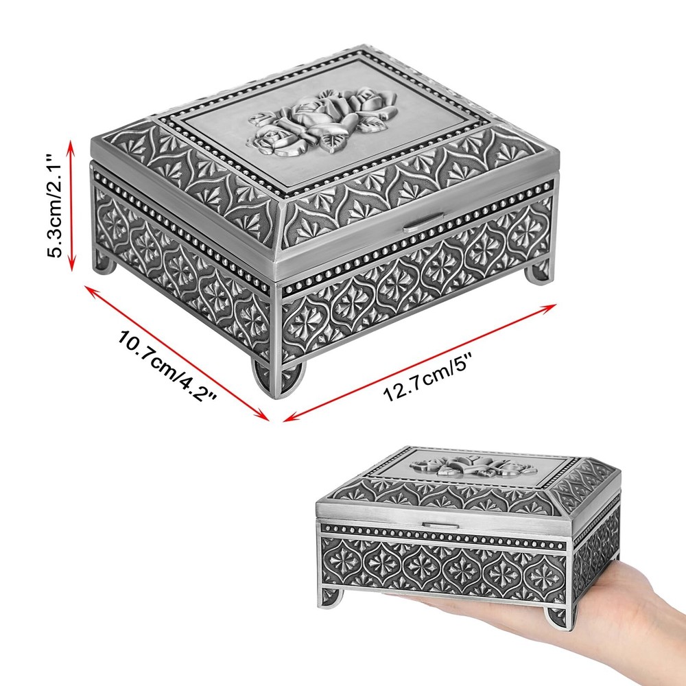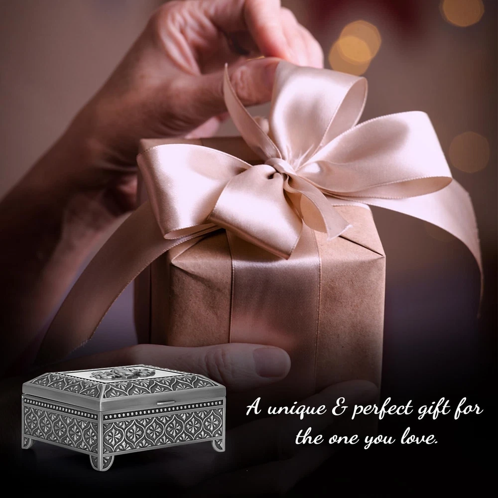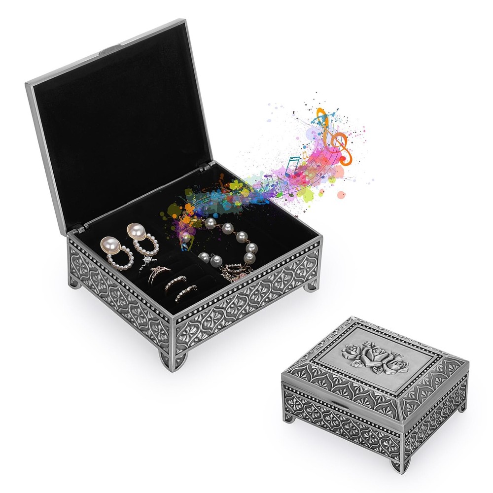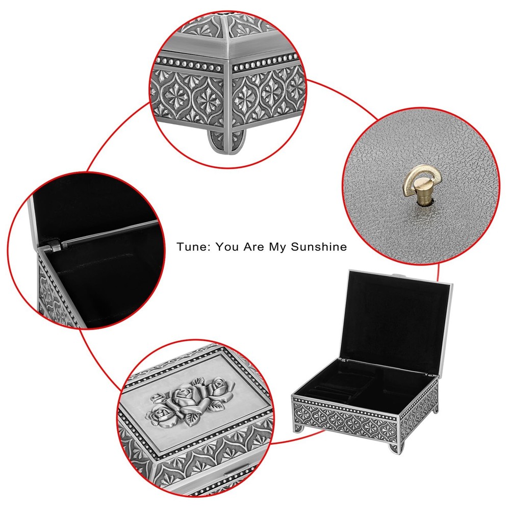 ELLDOO Vintage Music Box, Silver Metal Musical Jewelry Box Keepsake Box, Rose Pattern Small Trinket Jewelry Storage Box Gift for Girl Women (Tune: You are My Sunshine) - Buy Now with Fast Shipping! ELLDOO Vintage Music Box, Silver Metal Musical Jewelry Box Keepsake Box, Rose Pattern Small Trinket Jewelry Storage Box Gift for Girl Women (Tune: You are My Sunshine) Product Details Color: Silver Brand: ELLDOO Material: Metal Style: Vintage Special Feature: Musical Recommended Uses For Product: Ring Product Dimensions: 4.2"D x 5"W x 2.1"H Target Audience: adult Shape: Rectangular Finish Type: Polished Color: Silver Brand: ELLDOO Material: Metal Style: Vintage Special Feature: Musical Recommended Uses For Product: Ring Product Dimensions: 4.2"D x 5"W x 2.1"H Target Audience: adult Shape: Rectangular Finish Type: Polished Inner Material: Metal Number of Drawers: 2 Item Weight: 380 Grams Number of Compartments: 1 Number of Items: 1 Manufacturer: ELLDOO Occasion: Engagement, Mother's Day, Wedding, Birthday Mounting Type: Table Top Item Weight: 13.4 ounces Country of Origin: China Item model number: 5PF1U2-US086 Fabric Type: Metal Tick-repellent material: Metal Finish types: Polished Number of pieces: 1 Batteries required: No Included Components: Musical boxes Key Features ✅ Metal ✅ Product Info -Dimensions(LxWxH): 5" x 4.2" x 2.1". Not only can play music, but also can hold jewelry. Packing included: 1 x Metal Music Box (Jewelry are not included) ✅ Romantic Music Box - This music box was made of quality silver metal, strong and sturdy.There is a silver rose pattern on the surface of the music box, which adds a romantic atmosphere ✅ Music Theme - Tune: You Are My Sunshine.This music jewelry box is ideal gift for your lovers on Birthday, Wedding, Anniversary, Valentine's Day, Mother's Day, Thanksgiving, Christmas, etc ✅ Movement built-in Music Box - The movement has a built-in music box for more storage space. The metal box is perfect for organizing jewelry, trinket, rings, earring, trinkets and other small accessories ✅ No Batteries Required - Easy to use, no batteries required. There is a hand crank at the bottom of the music box, you only need to twist the crank to wind up the string to play music Product Description