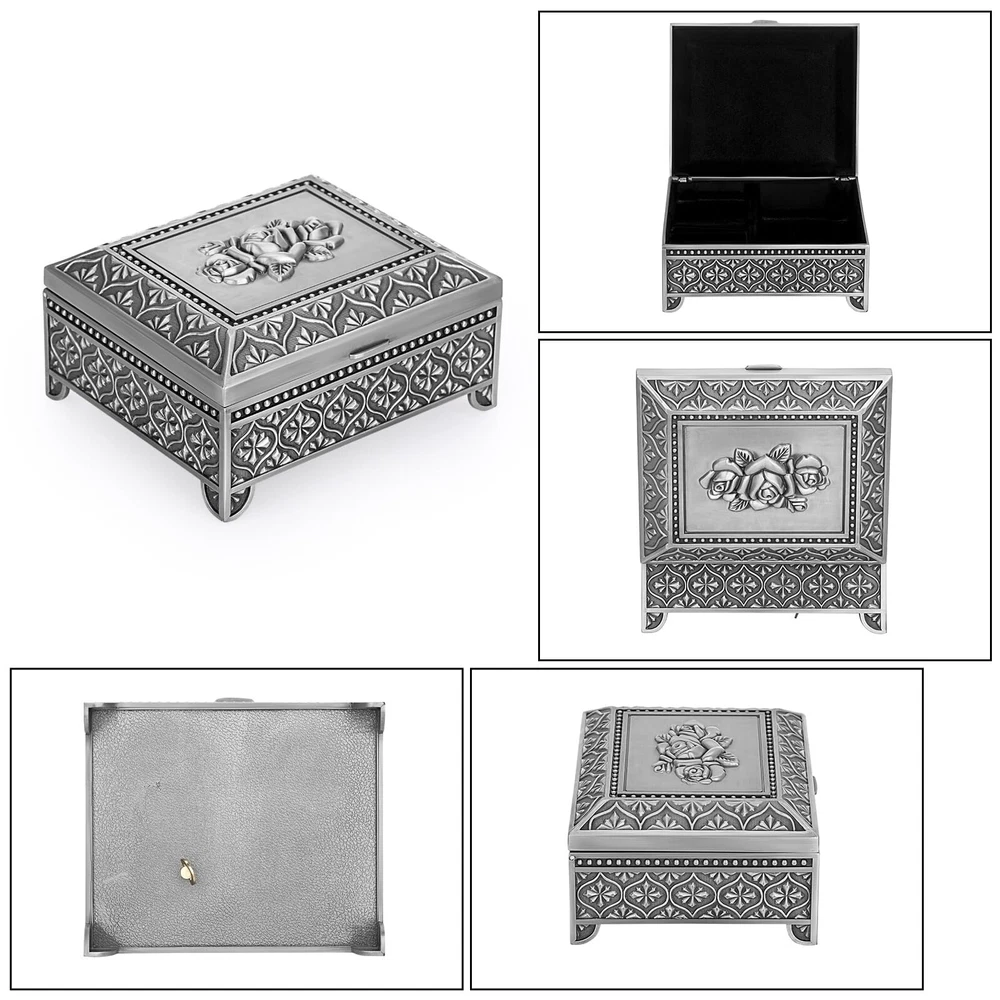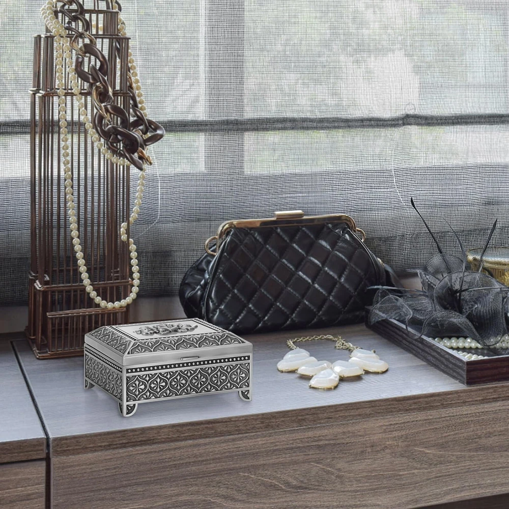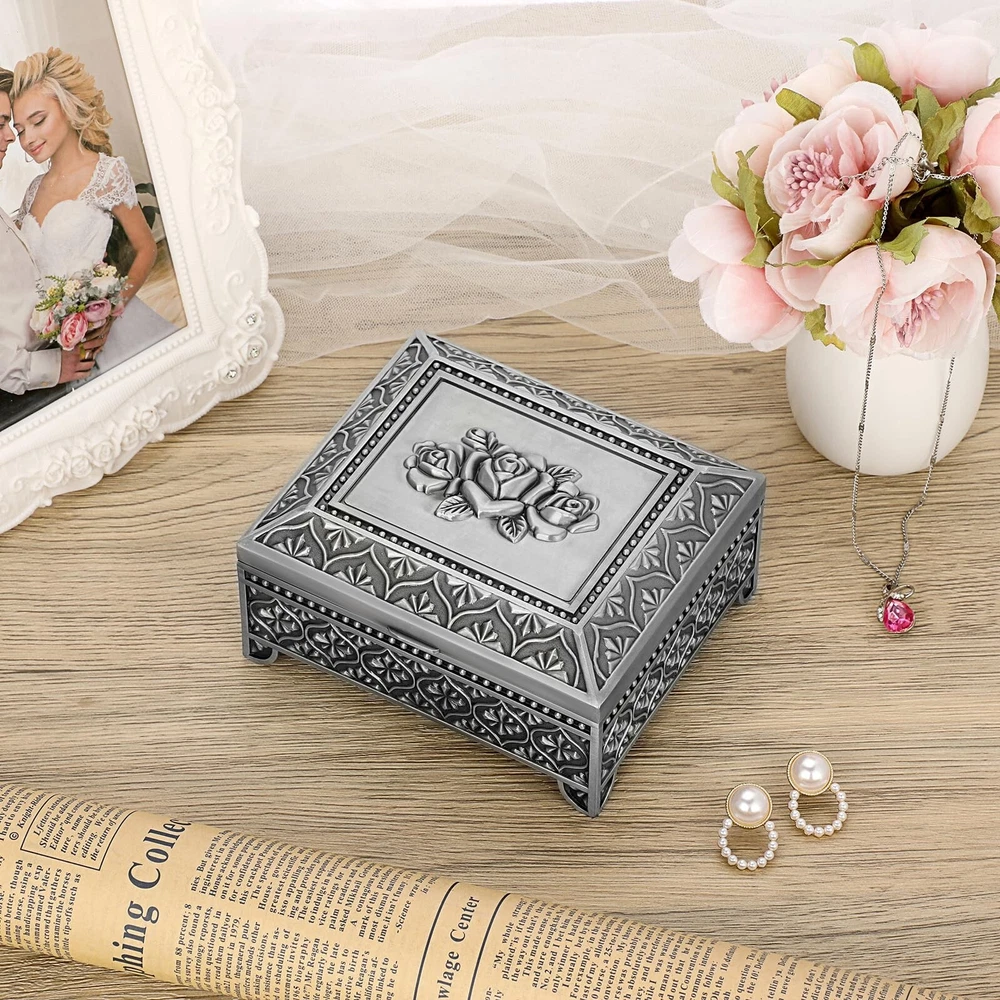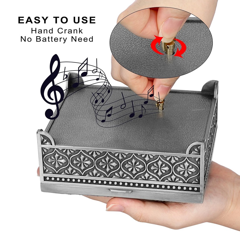 ELLDOO Vintage Music Box, Silver Metal Musical Jewelry Box Keepsake Box, Rose Pattern Small Trinket Jewelry Storage Box Gift for Girl Women (Tune: You are My Sunshine) - Buy Now with Fast Shipping! ELLDOO Vintage Music Box, Silver Metal Musical Jewelry Box Keepsake Box, Rose Pattern Small Trinket Jewelry Storage Box Gift for Girl Women (Tune: You are My Sunshine) Product Details Color: Silver Brand: ELLDOO Material: Metal Style: Vintage Special Feature: Musical Recommended Uses For Product: Ring Product Dimensions: 4.2"D x 5"W x 2.1"H Target Audience: adult Shape: Rectangular Finish Type: Polished Color: Silver Brand: ELLDOO Material: Metal Style: Vintage Special Feature: Musical Recommended Uses For Product: Ring Product Dimensions: 4.2"D x 5"W x 2.1"H Target Audience: adult Shape: Rectangular Finish Type: Polished Inner Material: Metal Number of Drawers: 2 Item Weight: 380 Grams Number of Compartments: 1 Number of Items: 1 Manufacturer: ELLDOO Occasion: Engagement, Mother's Day, Wedding, Birthday Mounting Type: Table Top Item Weight: 13.4 ounces Country of Origin: China Item model number: 5PF1U2-US086 Fabric Type: Metal Tick-repellent material: Metal Finish types: Polished Number of pieces: 1 Batteries required: No Included Components: Musical boxes Key Features ✅ Metal ✅ Product Info -Dimensions(LxWxH): 5" x 4.2" x 2.1". Not only can play music, but also can hold jewelry. Packing included: 1 x Metal Music Box (Jewelry are not included) ✅ Romantic Music Box - This music box was made of quality silver metal, strong and sturdy.There is a silver rose pattern on the surface of the music box, which adds a romantic atmosphere ✅ Music Theme - Tune: You Are My Sunshine.This music jewelry box is ideal gift for your lovers on Birthday, Wedding, Anniversary, Valentine's Day, Mother's Day, Thanksgiving, Christmas, etc ✅ Movement built-in Music Box - The movement has a built-in music box for more storage space. The metal box is perfect for organizing jewelry, trinket, rings, earring, trinkets and other small accessories ✅ No Batteries Required - Easy to use, no batteries required. There is a hand crank at the bottom of the music box, you only need to twist the crank to wind up the string to play music Product Description