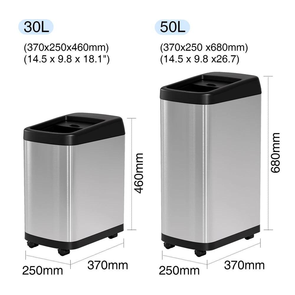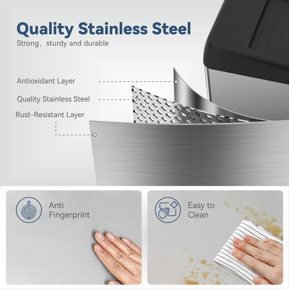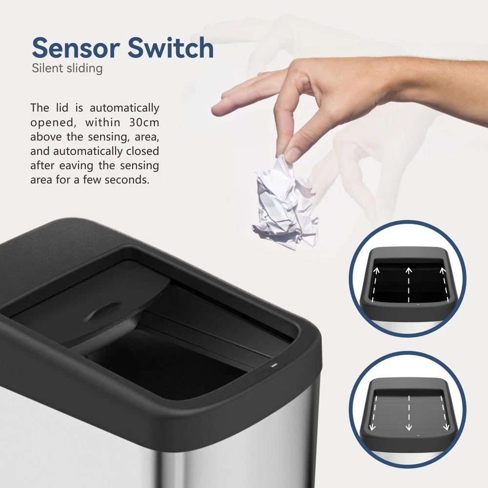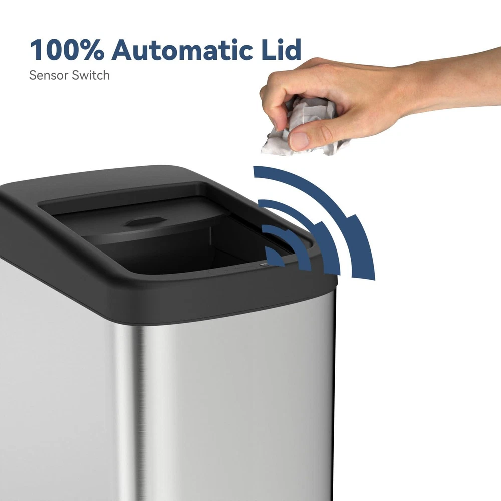【Premium Motion Sensor Technology】: The touchless kitchen trash can features cutting-edge sensor technology that detects motion within inches, offering a truly hands-free operation. With the touchless operation, you can dispose of kitchen waste without touching the surface of the trash can, maintaining optimum hygiene and preventing cross-contamination. 【Durable Stainless Steel Construction】:Crafted from high-quality stainless steel, this 13-gallon trash can is built to last. The robust material ensures long-lasting use and adds a modern touch to your kitchen. The stainless steel surface of the garbage can is easy to wipe clean, making maintenance a breeze. 【Sleek Roll-Top Lid Design】 :The roll-top lid design not only keeps the trash hidden but also prevents unpleasant odors from escaping. The smooth opening and closing mechanism effortlessly seals in the odor, keeping your kitchen smelling fresh. 【High-Tech Induction Device】Our touch free trash can used high technology induction device, whether it is sensing the proximity of a human hand or an object, it can respond quickly to open the lid of the trash can, and automatically close the lid within 5 seconds after the trash is thrown in. 【After-Sale Service】If you have any problem with the product or meet any question during the usage, please feel free to contact with our customer service, we promise we will provide you the most professioal technical support and best solution.