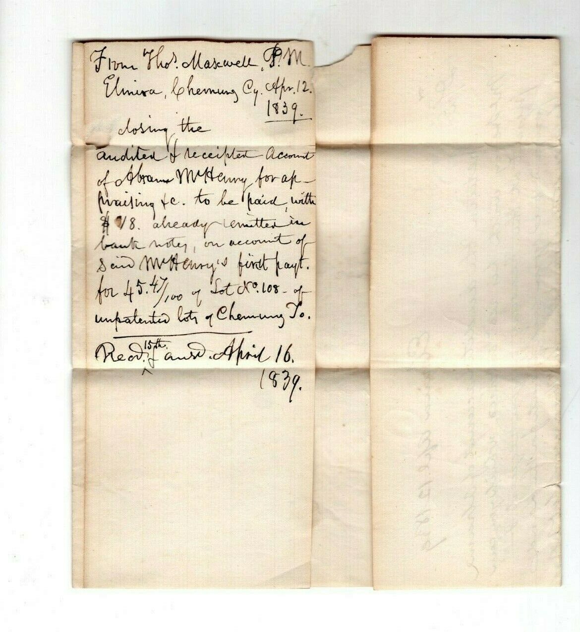 ELMIRA NY POSTMASTER'S FREE FRANK 1839,THOMAS MAXWELL TO O L HOLLEY,ALBANY NY