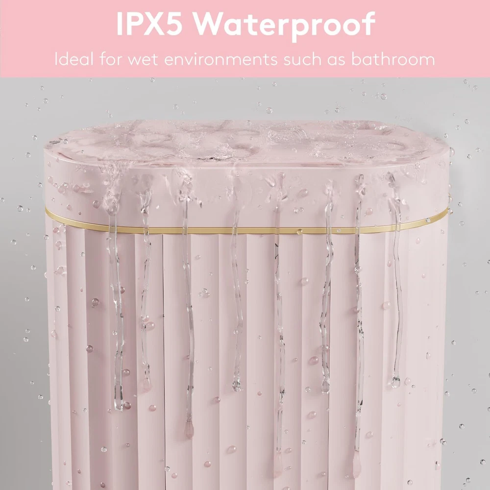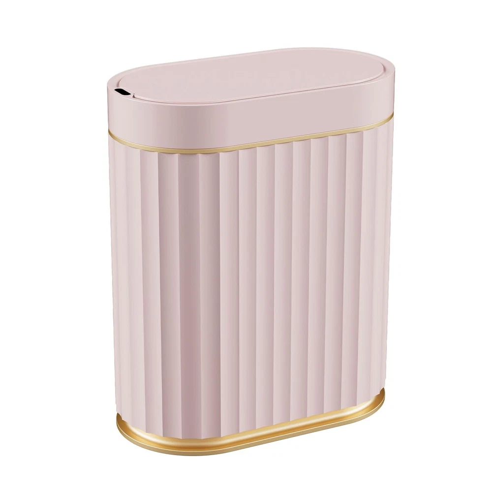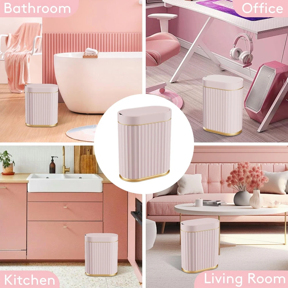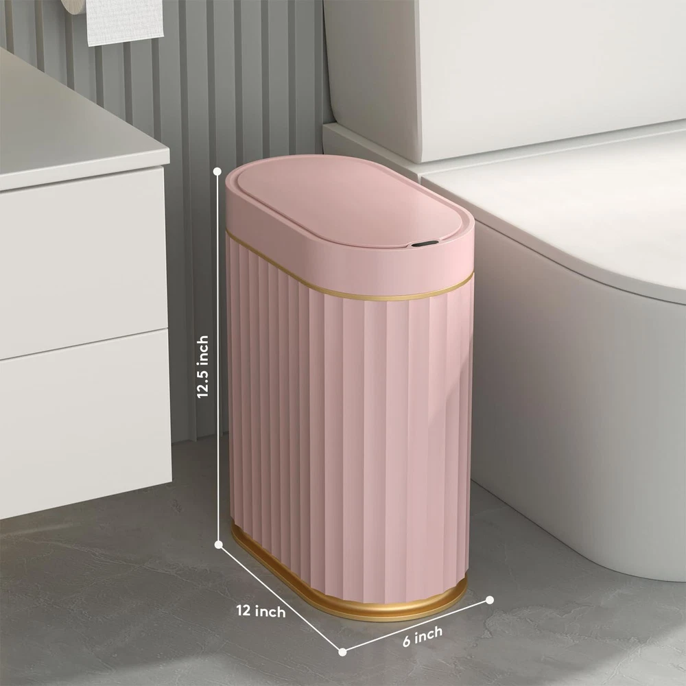 Bathroom Trash Can with Lid 2 Gallon Sensor Garbage Can, 8 Liter Narrow Smart Trash Bin Small Slim Waterproof Garbage Bin Pink Automatic Waste Bins for Bedroom, Bathroom, Living Room NOTICE FOR CUSTOMERS - This product is a motion sensor trash can. Customers need to install 2 AA batteries as well as follow the steps to put on the garbage bag to ensure the bin works properly. In the process of use, please do not hesitate to contact us immediately if any problem occurs. SMART SENSOR - Our fully-developed sensing technology reduces unnecessary openings and extends battery life. The lid stays open if you keep your hands above the infrared motion sensor, which improves user experience greatly. Lid closes after 5 seconds automatically if none movement is detected by sensor. Product powered by 2 AA batteries (not included). IPX5 Waterproof - Advanced IPX5 waterproof technology prevents water or humid environment from damaging the unit. Leaving none water stain on surface after rinse. Pink Exterior Design - Elegantly designed in pink, this bin combines a refined look with ample capacity, ensuring style and functionality in every corner. Lock Special Smell - Enjoy a fresher home with our pink bin's special odor-lock technology, keeping unpleasant smells contained stylishly. Horizontal large-diameter design - Effortlessly toss in larger waste with the wide opening of our chic pink bin, designed for both convenience and elegance. CUSTOM FIT GARBAGE BAGS: Our code A trash bags are designed to fit perfectly in this trash can so they don't slip and are completely hidden. The extra thick plastic and double stitched construction prevents tears and breakage.