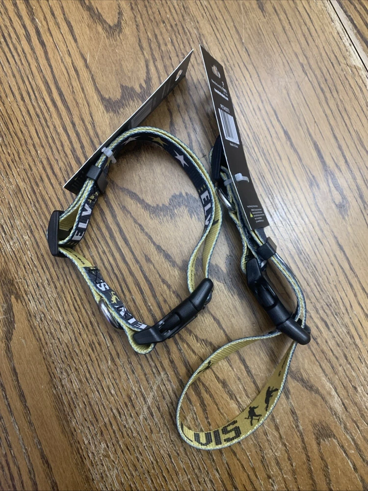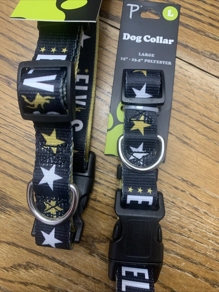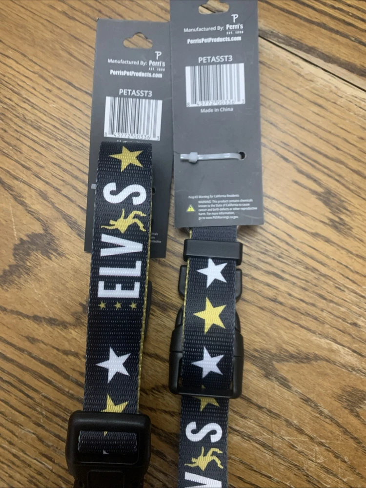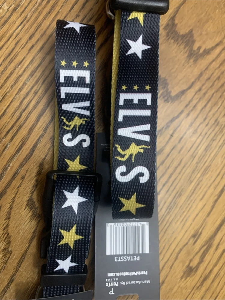 This Elvis Presley dog collar from Perri's Pet Products is perfect for any large dog, with a size range of 15"-23.5". The collar features a quick release buckle and is made of durable polypropylene webbing. This collar is adjustable and comes in a set of two, making it a great value for any pet owner. The collar is designed for both male and female dogs and is not personalized. It is made in China and comes with a warning label for California Prop 65. The collar is a standard dog collar with a unique design featuring Elvis Presley. This collar is perfect for any dog lover who wants to add a touch of style to their furry friend's wardrobe.