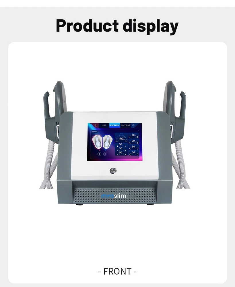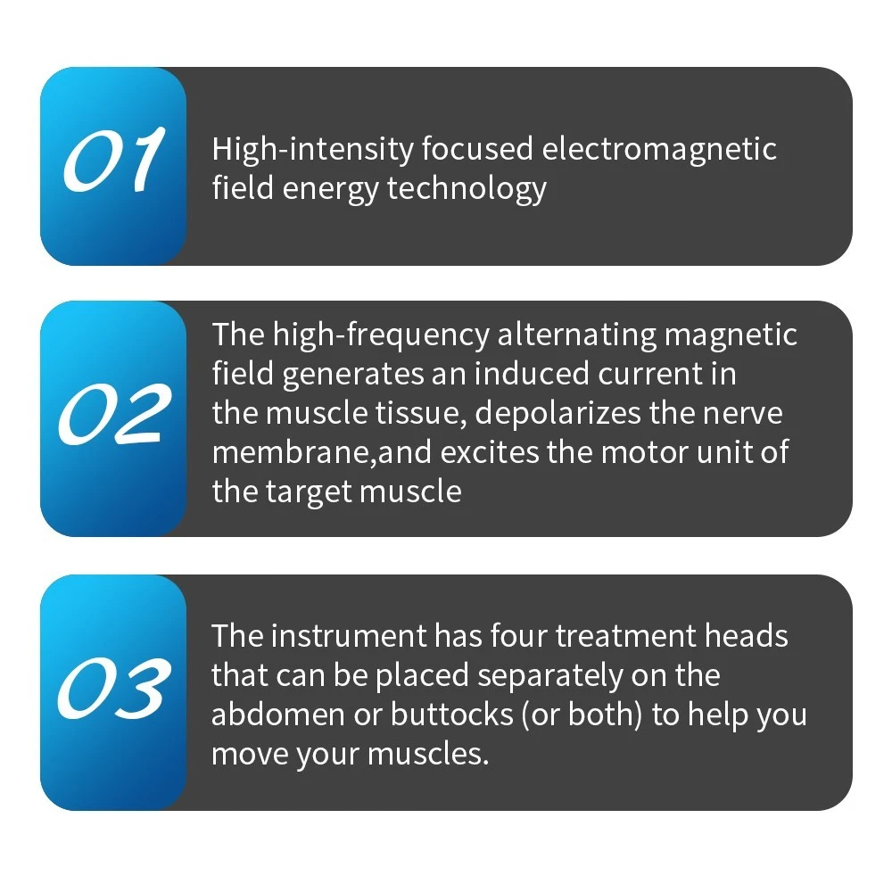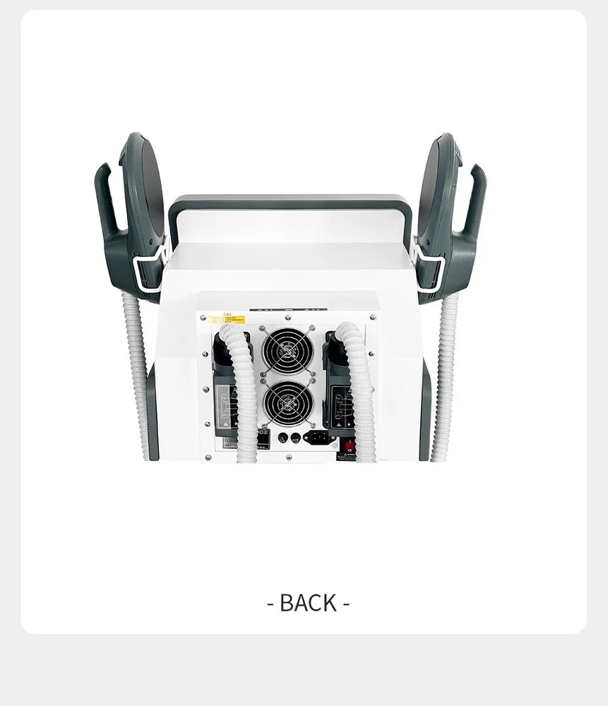 Fat Breakdown In less than 4 minutes the temperature in fat reaches levels that cause their permanent damage. Muscle Warm-Up The muscle temperature raises by several degrees, similarto what a warm-up activity does beforeany workout. Supramaximal Contraction Muscles in the treated area are contracted at intensities that are not achievable during routine exercise. After Treatment The fat cells are slowly removed from the body and the strained muscle fibers initiate a growth process. This results in fat elimination and muscle building. The Real Machine Iteam Name Factory Supply 4 Handle /5 Handle EMS Body Scuplting Muscle Building Cellulite Reduction Beauty Machine Operating Language English & Chinese (can be customized) Voltage AC110-220V 50HZ/60HZ Output maximum power 6500W Frequency 0-200Hz Screen size 8 inches Machine size 55*61*52(38.8kg) Warranty One-year quality guarantee Functions Body Slimming, Muscle building, Skin Tightening, Cellulite Reduction, Body Muscle Sculpting, etc. MOQ Sample accept Packaging Standard Carton or Wooden Case. Inside: Foam Shipment By Sea, Air or Express dlivery Technical Support Online/Video technical support/Other Warranty 12 months. Any problems during warranty period, we will provide component replacement. Service OEM&ODM Support, Customer logo printing. 01 30mins Treatment = 20,000 sit-ups 02 Fat Burning, Cellulite Removal 03 Muscle Thickening, skin tightening, Weight loss, Shaping a strong and handsome figure. 04 Buttocks Sculpting, Abdomen Firming, Waist Slimming, Legs and arms Toning, Waistcoat line and Peach Butt Shaping 05 Improving the constitution of obesity and the efficiency of weight loss. 06 Preventing from aging and maintaining physical youth 07 Reducing chronic pain in muscles and joints.