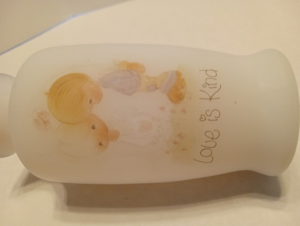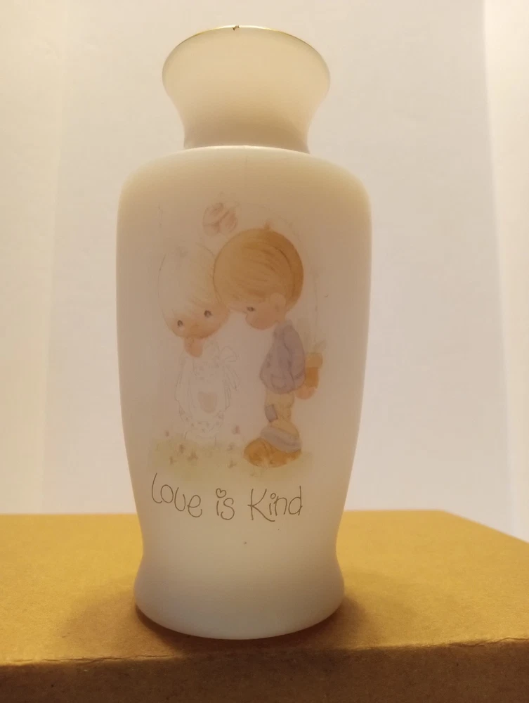 The ENESCO JONATHAN & DAVID 1970s LOVE IS KIND PRECIOUS MOMENTS 4.5" Mini BUD VASE is a small round vase made of frosted white glass, featuring a vintage 1970s style. This decorative collectible from the Precious Moments brand is perfect for all occasions and can be enjoyed by teens, boys, adults, kids, and even toddlers. Its original design and small size make it a charming addition to any home decor setting.
