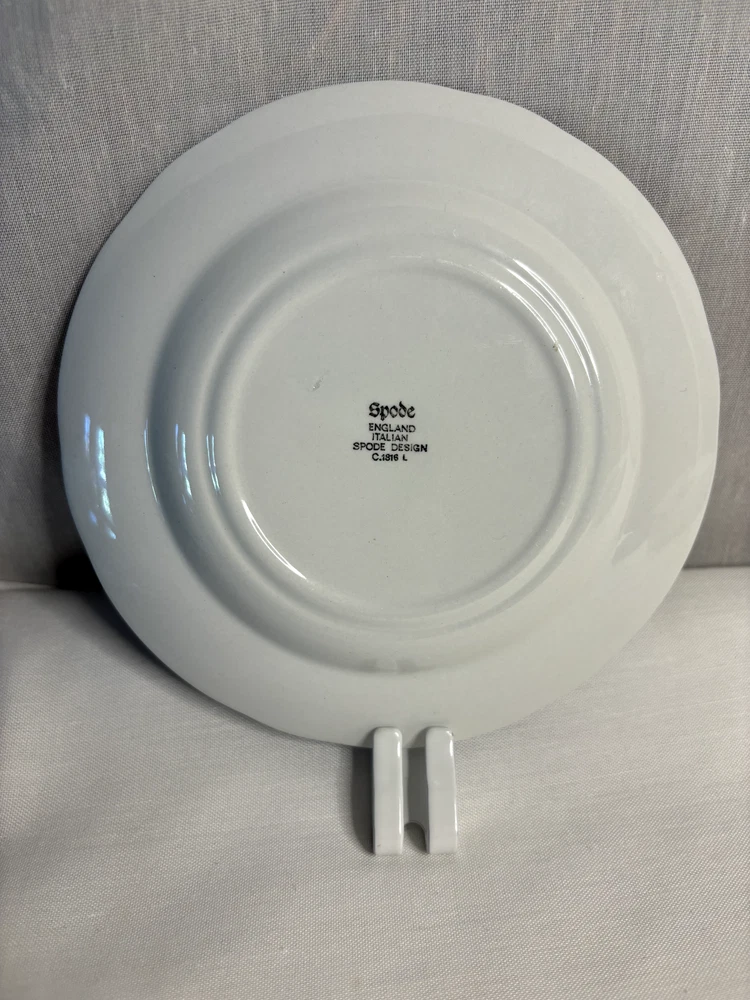 ENGLAND FOUR SCALLOPED SPODE BLUE ITALIAN BREAD PLATES 6 1/2”D UNUSED LOOK This set of four scalloped edge bread plates in the Spode design is a must-have for any collector of mid-20th century English porcelain. The blue and white checkerboard pattern, featuring a landscape theme, is eye-catching and versatile, making these plates suitable for any occasion. Crafted in 1962, these plates are in their original, glossy finish and have never been used. The set includes four round plates with a diameter of 6 1/2 inches. The product line is Blue Italian, and the plates were manufactured in the United Kingdom. Add these classic plates to your collection today!