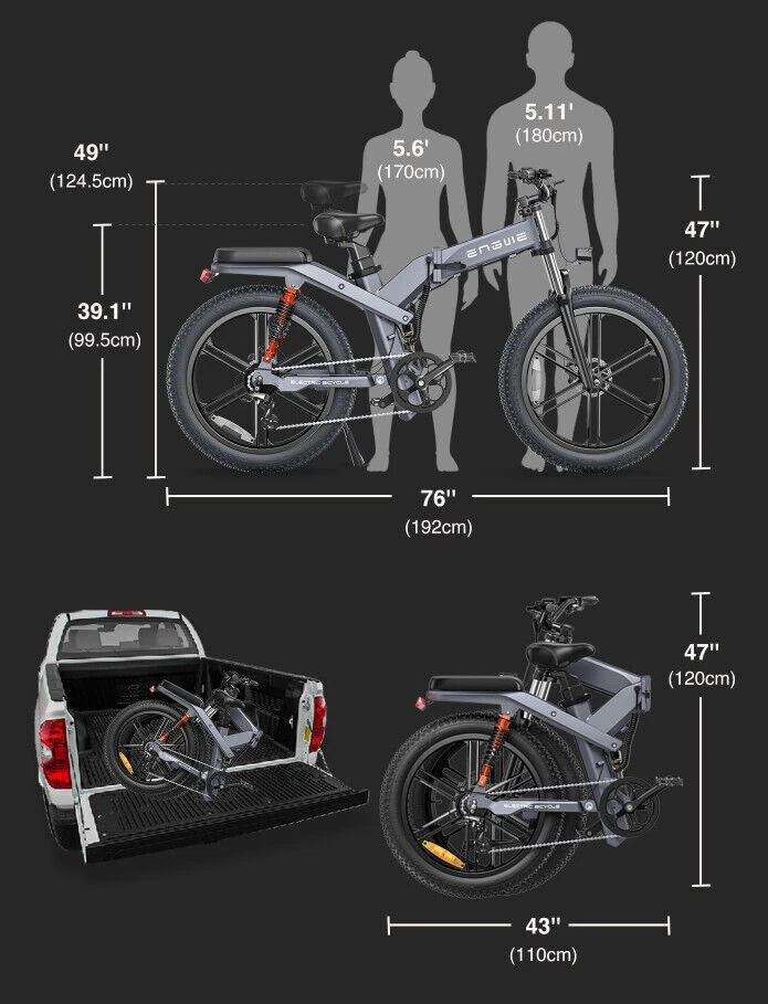 About this item: *Powerful Motor E-bike: The X26 is a powerful all-wheel drive electric bike for adults. 1200W brushless motor with Shimano 8-speed gear for an easy ride, with a top speed of about 31MPH, with a long range of more than 93 miles. Equipped with 48V, 29.2AH detachable lithium battery( Battery 2:48v 10ah Lithium-Ion Battery) Charging time: Approximately 5-8 hours, 2000 cycles of charging. *Fat Tires 26"x4.0" Ebike: Fat Tire and front suspension to ride smoothly on any terrain, including rocky roads, sandy beaches, snowy suburbs and so on. *Hydraulic Disc Brakes: Hydraulic Disc Brakes & Fat Tires:The electric dirt bike is equipped with outstanding features, including 26*4.0-inch fat tires and 180mm hydraulic disc brakes. Weighing only 96lb, this foldable and portable electric bike is stable, for riders between 5.6 to 6.5 feet tall and weighing up to 330lb. Its rugged tires excel on both dirt and road surfaces. And with headlights, this folding ebike is suitable for nighttime rides, guaranteeing safety and security during your evening adventures. *48V 29.2AH ENGWE Battery : Powered by 48V 29.2A removable Lithium single Battery and a powerful 1200W (peak) electric motor, this adult electric bike guarantees limitless exploration. Enjoy electric range of 62 miles in Throttle mode, allowing you to embark without worrying about power. With the PAS mode (Pedal assist mode), you'll be able to push your boundaries, reaching up to a remarkable 95 miles. Discover a new level of exhilaration and freedom with the ENGWE X26 E-bike *4 Riding Modes: This electric bike offers a range of riding modes to suit your preferences. You can choose from pure electric mode, pedal assist mode, classic bike mode, or even activate cruise control mode for easy riding. Each mode has its own unique benefits, allowing you to enjoy a customized riding experience every time. *440 LBS Max Capacity: ENGWE Ebike is framed by Aluminum which brings a more reliable safety system than other brands. Adjustable seat fits. The bike weighs 80 lbs and has a max load capacity of 440 lbs. The triangular Aluminum frame is extremely stable and strong to handle weight and pressure, which is friendly for people with taller or stronger and take you anywhere. *Easy installation: 85% of the bike is pre-installed, you only need to manually install a few simple accessories. *1 Year Warranty: We provide 1 year warranty. If you have any questions about this item please directly contact us. Warm Tips: * New electric bike passes road test before packing, therefore dust on the tires is inevitable. * Upon arrival, mark down the serial number, which locates on the middle axle tube, and register to vehicle management center. It is necessary to track your ebike while preventing loss. ENGWE X26 EBIKE All-Terrain Performance Beast X26 Vehicle Weight: Dual Battery Version: 96Lbs (43.6KG); Single Battery Version: 84.8Lbs (38.5KG) Specification: Bike Type E-Bike Age Range Adult Brand ENGWE Number of Speeds Shimano 8 Gears Color Black Wheel Size 26"x4.0" Brake Style Hydraulic Disc Brakes Frame 6061 Aluminum Alloy Brake Hydraulic Disc Brakes Suspensions Triple Suspensions Throttle Twist Throttle on the Right side of Handlebar Display Smart LCD display that shows speed, battery status, pedal assist level, etc. Range 93 Miles(ECO Mode) Voltage 48 Volts Model Name X26 Wattage 1200 watts Hub & Power Integrated Hub Motor with 1000W power Motor 1200w(peak) High-Speed Brushless Motor Item Weight 96 lbs (43.6 kg) Maximum Weight Recommendation 330 lbs (150 kg) Warranty 1 year Suggested Users Unisex-adult Note: Our products have been certified under UL2849 safety standards.