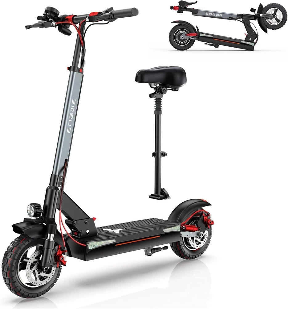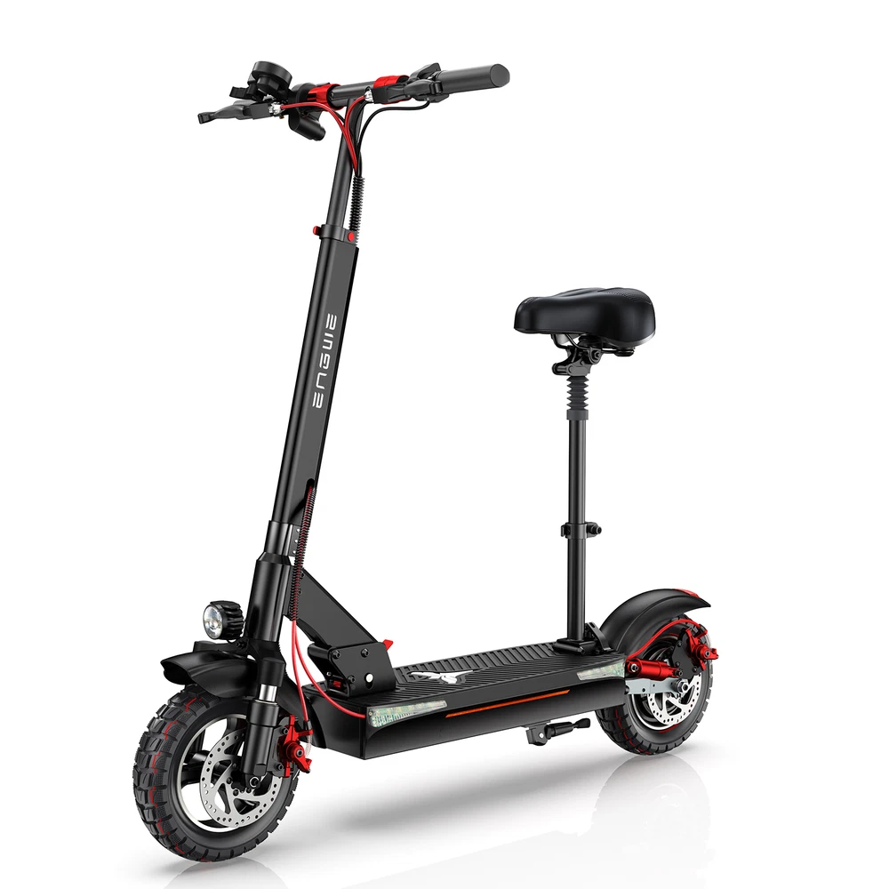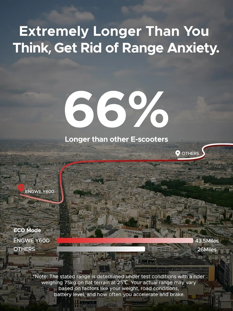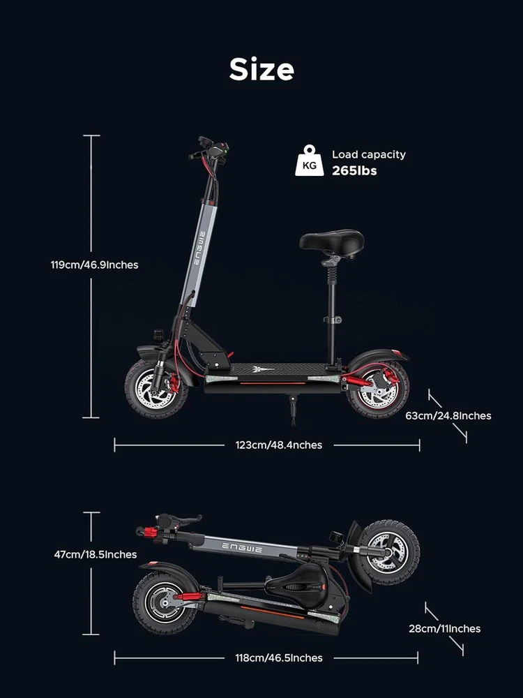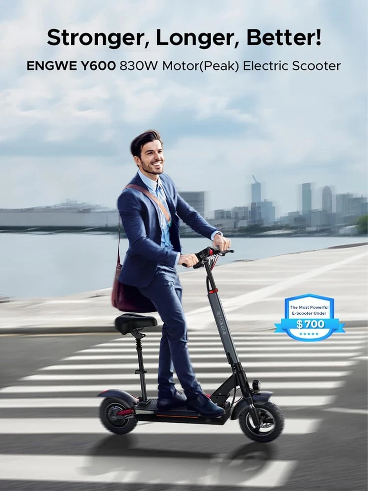 🛴A new option that allows you to freely across the city - Our New Y600 Adult Electric Scooter with Seat which is with powerful battery( 48V 18.2Ah ), makes it easier for you to complete daily travel, and one charge is enough for you to ride for 43.5 miles under specific conditions, max load of 330 lbs. 🛴Let You Ride As You Want, Easy to Drive - Our New Y600 E-scooter has three different riding modes ( Eco: 9Mph, D: 18Mph, S: 28Mph ), you can choose the most suitable mode for you according to your needs, and the 600W Motor/ 830w powerful high brushless motor allows you ride speed up to 28Mph, and handle all kinds of road conditions with ease! 🛴Comfortable Riding Experiences, Let You Enjoy Every Trip - Our New Y600 Electric Scooter for Adult adopts front and rear wheel suspension system and 10-inch pneumatic tires, which means you can enjoy a smoother and more comfortable riding experience, even on rough roads! 🛴Make Your Safety More Secure - Our New Y600 E-scooter for Adult is not only equipped with super bright headlight & taillight, but also has a side ambient light, which improves the safety of night riding and allows you to travel with peace of mind at any time. The perfect front & rear dual brakes and electronic braking system allow you to stop whenever you want. 🛴Your Great Helper for Travel - You can fold this New Y600 Electric Scooter with Seat for Adults with two-steps only in a few seconds for easy carrying and storage. The unfolded size: Package Dimensions (LWH): 48*9.4*18.9 (122x24x48 cm) . The folded size is Folded Size: 46.4*11*18.5 inches (118*28*47 cm) , easy to put in your garage or office. 🛴Buy with Confidence - ENGWE , a brand you can trust. We have always focused on the quality and technical improvement of electric scooters. Our electric scooter is designed to be the most sturdy and powerful electric scooter which will quickly become your favorite commuting or outdoor travel companion. ENGWE offer 180-days warranty for different parts, contact us to get fast and professional service. 🛴【Important Note】- The max speed and max range of per full charged vary based on a lot factors, including: rider's weight, riding surface, incline, ambient temperature, battery level, riding style (stop/start vs cruising), wind direction, wind speed etc. Specification: Model: Y600 Electric Scooter Body: Aluminium alloy Motor torque/N.M:28 NM Battery:48V18.2AH Lithium-Ion Battery*1 Range:43.5 miles Brakes: Mechanical Disc Brake/Power-off Brake Lever Tires: 10" Off-road Tires Max. loading: 330 lbs Max. speed: 28 mph Charging time: 6 Hours Product weight: 50 lb Brake:Mechanical Disc Brake/Power-off Brake Lever Tires:10*4.0 Tires Charging Time:About 10H Waterproof Grade:IPX5 Bike Weight:26.5 KG (58.4 lbs) Gross Weight:30.5 kg (67.2 lbs) Product Description The powerful 830W motor brings Speed up to 28MPH (Release speed),48V 18.2AH Battery brings long range can travel 43 miles for more fun. The enhanced climbing ability and full suspension design are suitable for more terrains. Detailed turn signals, front and rear lights will ensure your safe riding. Package contents: 1 x Electric scooter. 1 x Portable Folding Handle 1 x Tool set. 1 x Main charger. Rider Height: 5.4 (ft) -6.2 (ft) Payload Capacity: 264 lbs (120 kg) Package Dimensions (LWH): 48*9.4*18.9 (122x24x48 cm) A--Minimum Handlebar Height 38.5 inches (98 cm) B--Maximum Handlebar Height 48.4 inches (123 cm) C--Total Length 46.4 inches (118 cm) D--Minimum Saddle Height 23.6 inches (60 cm) E--Maximum Saddle Height 30.3 inches (77 cm) Folded Size: 46.4*11*18.5 inches ( 118*28*47 cm) A--Height 18.5 inches (47 cm) B--Length 46.4 inchs (118 cm) C--Width 11 inchs (28 cm) Our product: (1) Our product approved by UL2272/CE/ROHS certificates (2) Every piece of spare part will be inspected before assembling and very piece of completed product will be tested before shipment. Contact US: (1) Welcome to wholesale and purchase,If you have any question ,Please contact us first. We will reply you within 24 hours. (2)We will leave positive feedback to buyer as soon as buyer pays for the item.We hightly appreciate that you can contact with us before you leaving Negative feedback or Neutral feedback .We will offer help to resolve your problems as fast as possible.