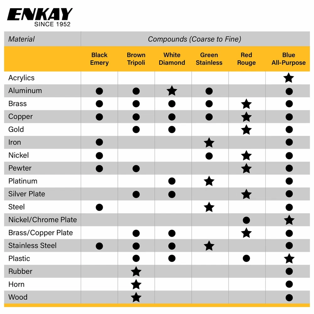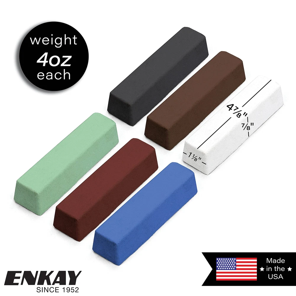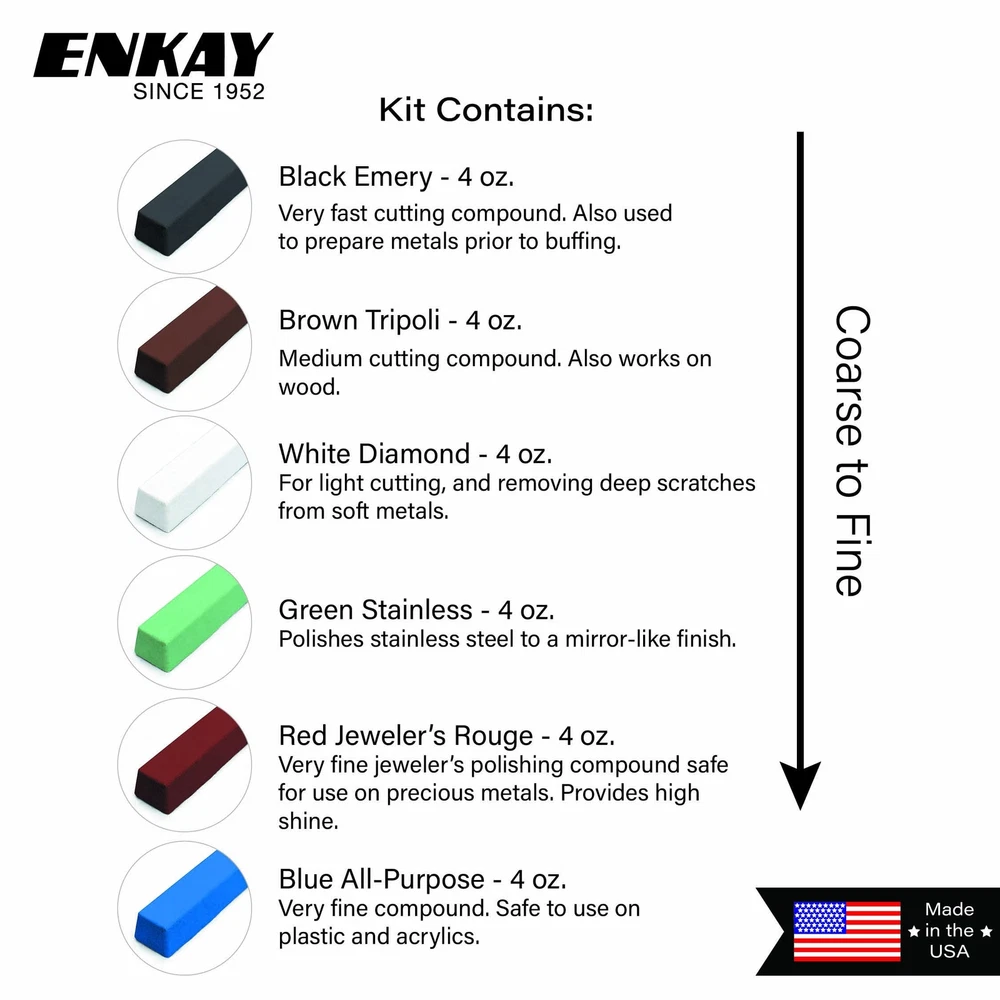 Enkay Products has been an importer and distributor of hand tools, drill accessories, hobby tools, and polishing accessories since 1952. Enkay's mission is to provide customers with a less expensive alternative to the larger more expensive tool distributors without compromising quality. The 6 pc. Jewelers Rouge & Polishing Compound Kit includes the (4) traditional polishing compounds used for cutting, removing scratches, and finishing metals and (2) specialty compounds for polishing plastic and stainless steel. Includes: Black Emery, Brown Tripoli, White Diamond, Green Stainless Steel, Red Jeweler’s Rouge, and Blue All-Purpose Polishing Compounds (from Coarse to Fine). Weight: 4 oz. each (1.5 lb. total) | Size: 4 oz. (4 ⅞” x 1 ⅛” x ⅞”) each | Made in U.S.A. | All polishing compounds are manufactured and packaged in U.S. facilities and have been stored in a cool and dry location for no more than 1 month. This Jewelers Rouge & Polishing Compound Kit has all the polishing compounds you will need to polish all metals, plastic, wood, rubber, acrylics, and more. Great for all stages of buffing and polishing, from start to end - fast cutting, removing scratches, preparing metals, restoration, coloring, cleaning tools, and fine polishing that achieves a mirror-like finish. Applied on buffing wheels. To apply, simply spin a buffing wheel on a motor or drill and gently press the compound to the wheel. The heat and friction of the spinning wheel will be enough to transfer a small amount of the compound onto the wheel for polishing.