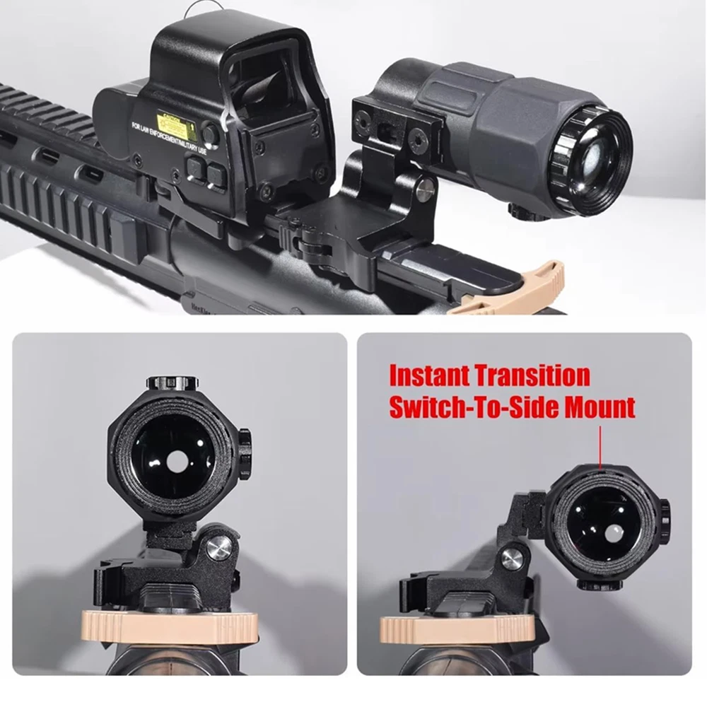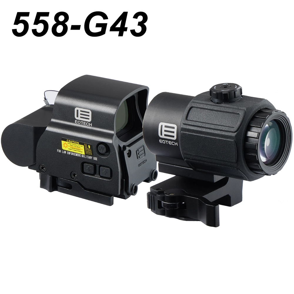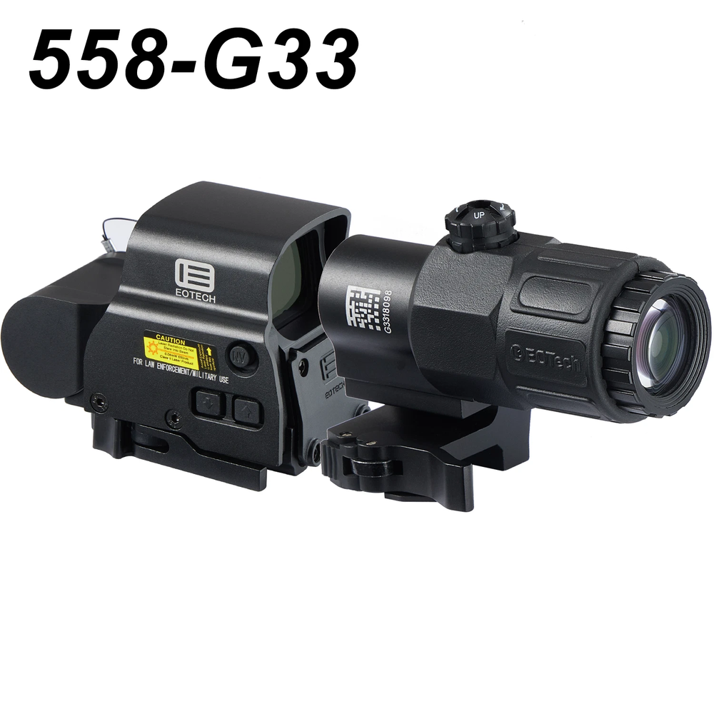 The 558 Red&Green Holographic Sights+ G33/G43/G45 3x/5x Magnifier Red and Green Dot is a high-quality optic designed for hunting enthusiasts. This holographic sight features a Picatinny rail mount for easy installation on your firearm. With a maximum magnification of 5x and adjustable red and green reticle colors, this sight allows for precise aiming and target acquisition during outdoor adventures. Powered by batteries, this black sight is durable and reliable for all your hunting needs. Description G45 Magnification: 5X Objective Lens Diameter: 25mm Eye Relief: 2.6 inch Linear Field of View: 23.3feet @ 100 yds Angular Field of View: 7.28 degrees Material: 6063 all-aluminum alloy structure Appearance size: 100*50*80MM Net weight: 334.5G Gross weight: 460G Glass: Multilayer Broadband Green Film Glass G43 : Fixed Magnification: 3 X Overall Length: 2.9″ (in) Material: 7065 Alumnium Alloy Made, Hard Anodized Eye Relief: 2.6"(67 mm) Field of View: 7.5° Sealing Fog Resistant internal Optics Water Resistance:33 ft. (10 m)depth Easy to install and setup, Integrated 5/8" 20mm Rail, with built-in quick detachable, Fits any 20mm Rail or Mounts to 1" Weaver or MIL-STD 1913 rail, both can 558 Magnification: 1x Reticle: Red / Green Dot Exit pupil distance: 20 (mm) Exit pupil diameter: 40 (mm) Field of view: 15.8M-100M Maximum Output Power:>1MW,<5MW Quick-detach lever for easy attachment and removal Fits for 20mm rail Power Supply: 1* CR123A(no included)