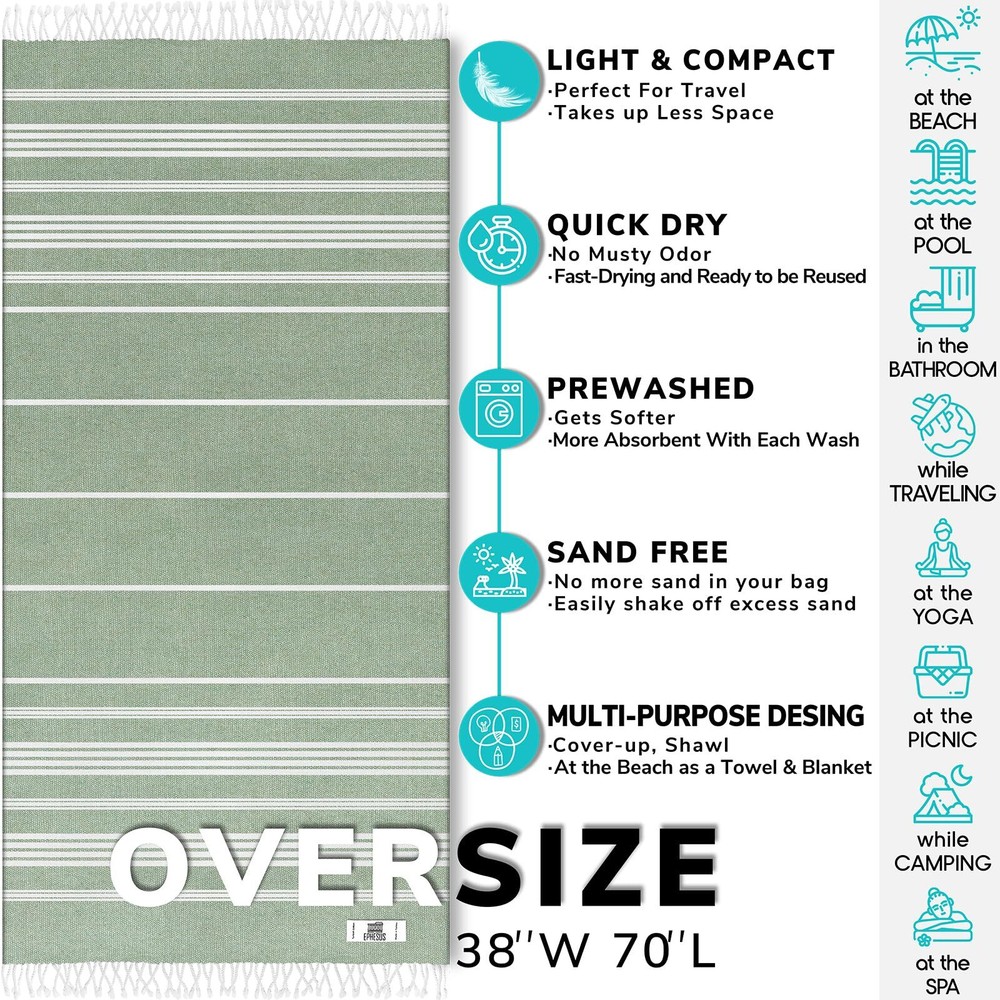 Absolutely love this Turkish beach towel! It’s super lightweight, dries quickly, and folds up small—perfect for travel. The apple green color is vibrant, and the Sultan design adds a stylish touch. Sand shakes right off, and it’s so soft after being prewashed. Great for beach days, yoga, or even as a stylish throw. Highly recommend!