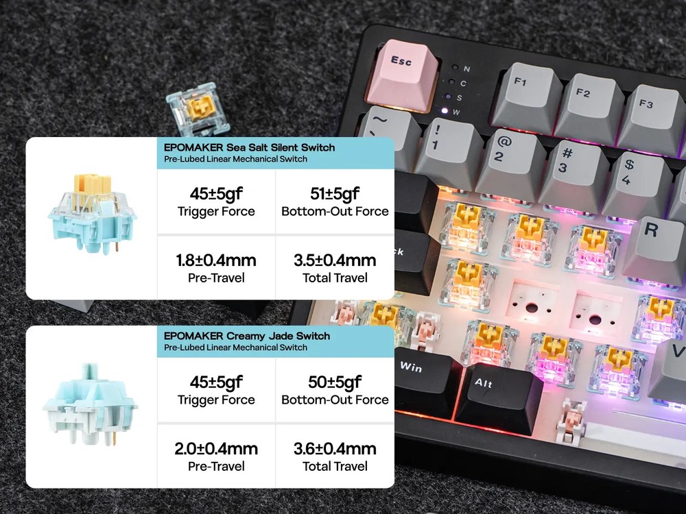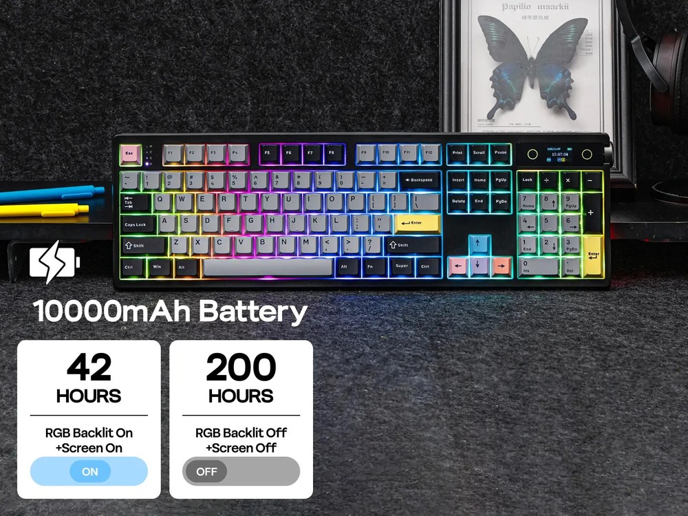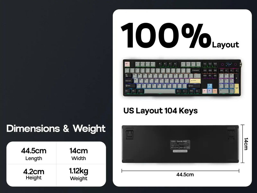 The EPOMAKER TH108 Pro Mechanical Keyboard is a sleek black keyboard with a QWERTY layout, featuring Cherry profile keys and Sea Salt Silent V2 mechanical Switch for a smooth typing experience. It offers both Bluetooth and wired connectivity, along with a 10000mAh rechargeable battery for on-the-go use. With RGB backlighting and hot-swappable functionality, this keyboard is perfect for gamers and enthusiasts looking for a high-quality, customizable typing experience. Its ANSI/full size 108-key layout ensures a comfortable and efficient typing experience for users.
