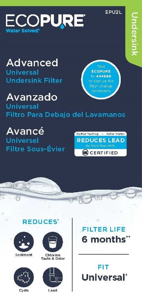 Product Description Product Description with our EPU3 system and other major brands, this filter helps deliver great-tasting drinking water right from your kitchen sink or refrigerator, reducing sediment, chlorine taste & odor, cysts and lead down to 0. 5 microns. Made using high-quality activated carbon block, the EPU2L filter features a highly adsorptive, positively-charged material that removes greater amounts of impurities from your water than you’d get with a sediment filter. This drop-in-style filter is perfect for homes with a handful of water issues that primarily want to remove lead. When you buy , you’re buying customization. is elated to offer a universal filter you can use with any standard capacity, open-sump, under sink system. While this NSF certified filter fits seamlessly into our EPU3 system, it also works with most major brands of open-sump systems, including Whirlpool, Omni, Culligan, Watts, Filtrate, 3M, GE, and DuPont. With only filter changes required per year, it’s easy to see why this filter is a reliable, cost-effective option. To ensure your under sink system is providing the highest quality water, replace your filter every six months, as recommended. From the Manufacturer Under Sink Lead, Taste and Odor Filter. 0. 5 micron rating. Removes lead, cysts, chlorine, and sediment. From the Manufacturer Under Sink Lead, Taste and Odor Filter. 0.5 micron rating. Removes lead, cysts, chlorine taste and odor, and sediment. : Designed for use in the Universal Under sink Water Filtration System (EPU3) UNIVERSAL FIT: Fits all major brands of drop-in-style under sink filtration systems, including: Whirlpool, Omni, Culligan, Watts, Filtrate, 3M, GE, and DuPont 6-MONTH FILTER LIFE: For best filtration results, filters should be replaced every six months, as recommended BETTER PROTECTION: NSF certified to reduce contaminants commonly found in drinking water, including chlorine, sediment, cysts and lead down to 0. 5 microns HELPFUL: Want filter-change reminders? Visit ’s to sign up. Questions? Our technical support staff is available –the helpline or visit ’s .