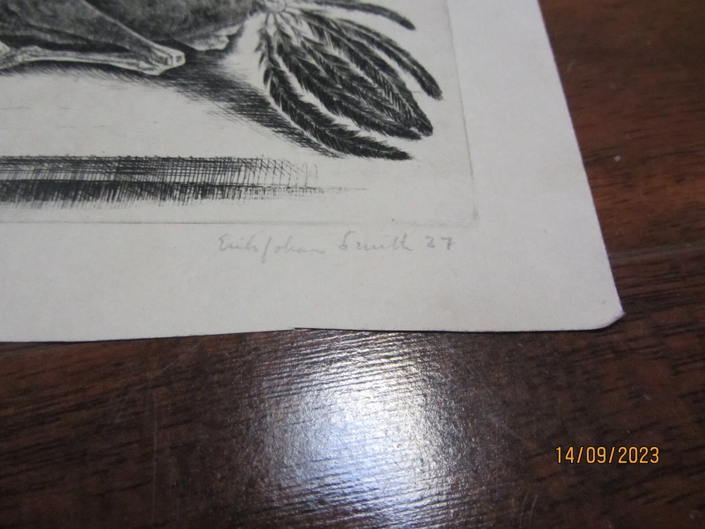 WELCOME TO MEDIA-MANIA-PLUS ERIK JOHAN SMITH ARTIST SIGNED ENGRAVING PLUCKED CHICKEN 6TH STATE DATED 1927. Biography Erik Johan Smith (American, b. 1893) Smith studied in France, Italy and Sweden and was employed in the Works Progress Administration (WPA) art program. His work is found in many private collections, as well as New York's Whitney Museum and the Uffizi Gallery in Florence. MARKED AS SHOWN CAME FROM ESTATE SALE. MEASURES 4" TALL 4-1/4" ACROSS SHIPPING BASED ON BUYER'S LOCATION ,UNLESS OTHERWISE NOTED, IF YOU WANT DIFFERENT SERVICE THAN OFFERED PLEASE EMAIL BEFORE PAYMENT AND WE WILL FIGURE OUT FOR YOU.GOOD LUCK AND HAPPY BIDDING!!! IF YOU WANT TO PAY BY ANOTHER FORM PLEASE EMAIL AND WE CAN WORK IT OUT. IF FOR SOME REASON YOU HAVE AN ISSUE WITH ITEM RECEIVED , PLEASE CONTACT US FIRST AND I AM SURE WE CAN WORK IT OUT.WE WORK HARD TO MAKE EVERYTHING RIGHT SO PLEASE EMAIL IF YOU HAVE ANY QUESTIONS. WE SALE VINTAGE ITEMS AND WE DESCRIBE THEM TO THE BEST OF OUR ABILITIES.THEY ARE NOT BRAND NEW NOR DO WE CLAIM SUCH SO IF YOU HAVE ANY QUESTIONS PLEASE FEEL FREE TO EMAIL US !!!!!