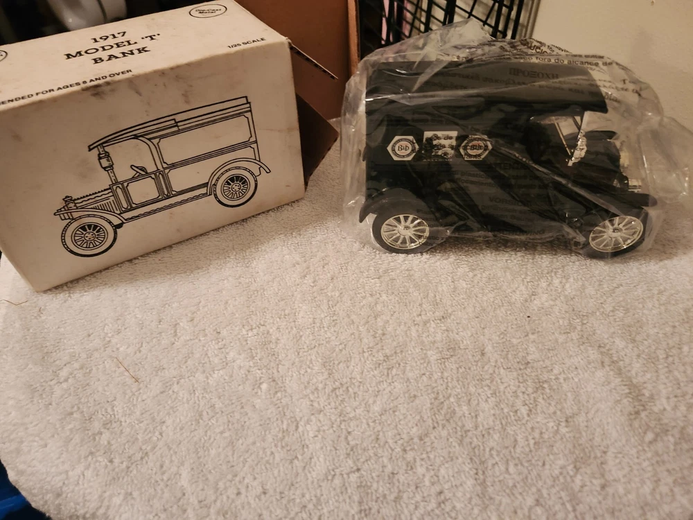 The ERTL 1917 Model "T" Coin Bank in Black & Decker Tools theme is a 1:25 scale die-cast car replica of a Ford Model T from 1917. This collectible piece features a black color scheme and functions as a bank. Manufactured in 1992, it comes in its original packaging, making it a new-in-box item for collectors and enthusiasts.