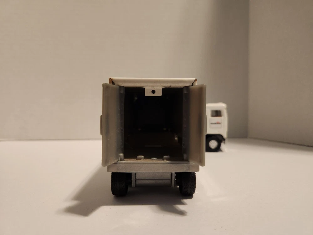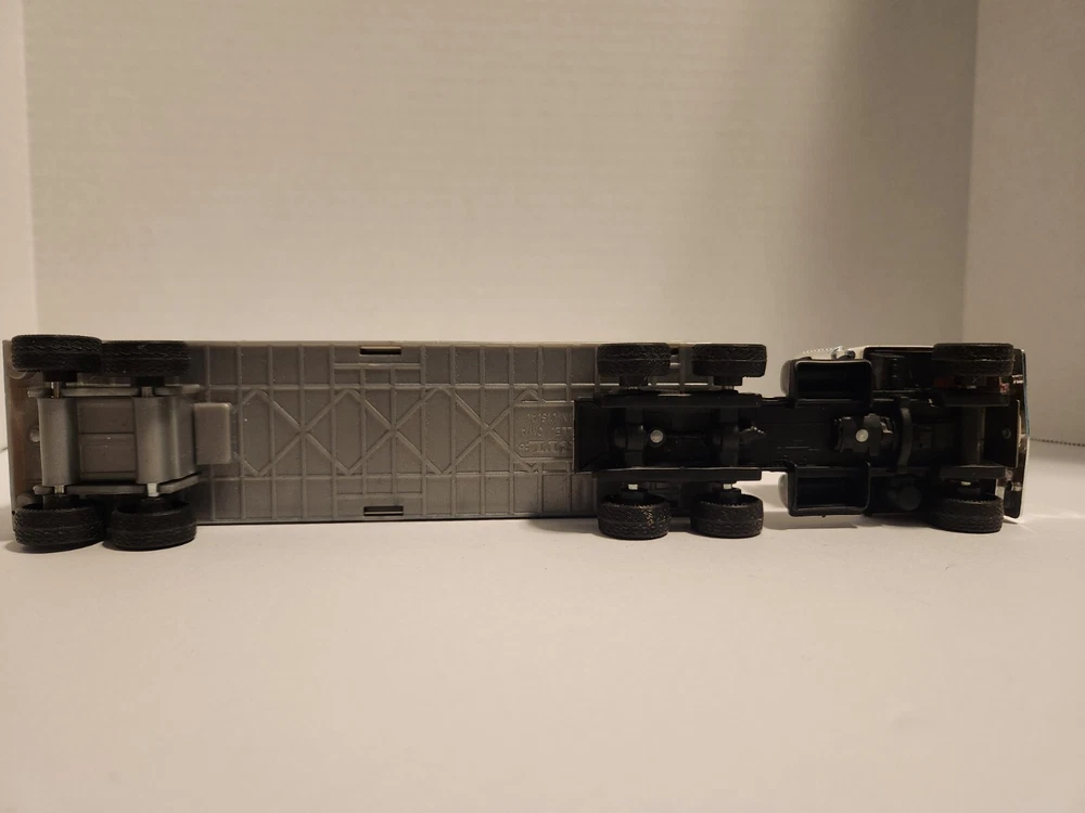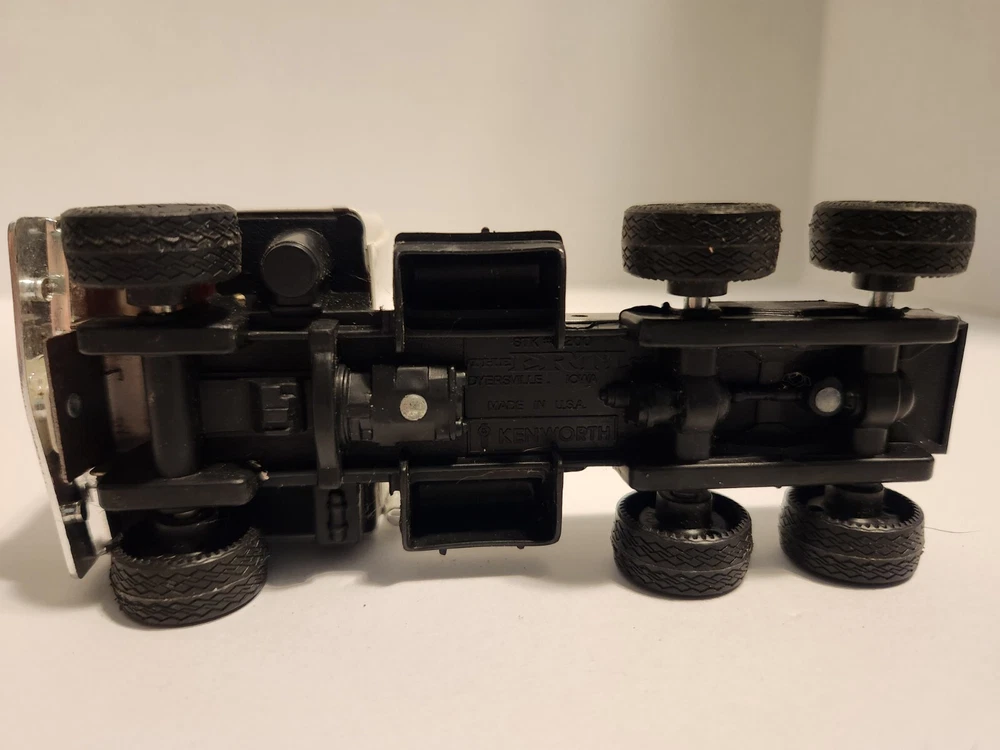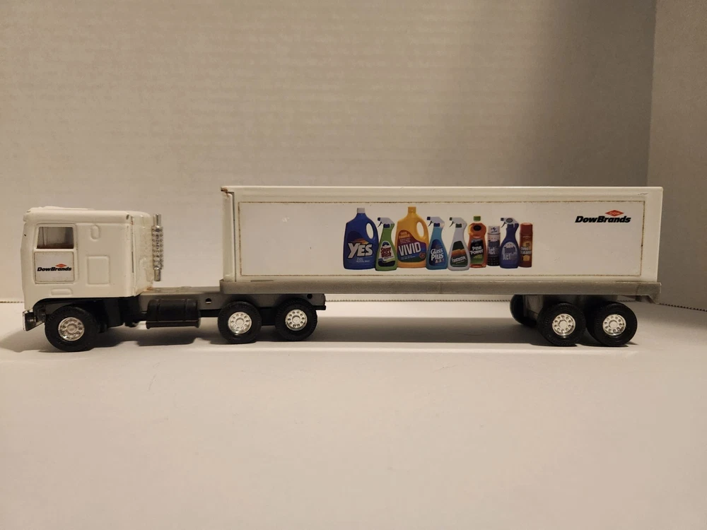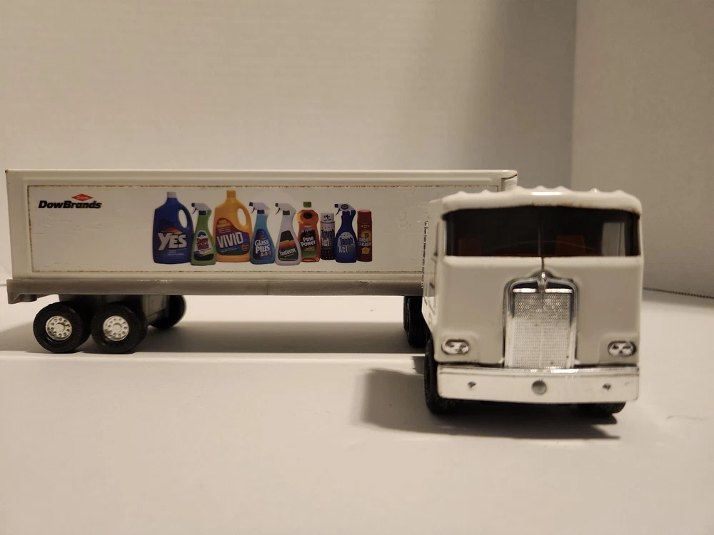 The ERTL #9923 1:48 Kenworth K100 Dow Brands Semi Truck & Trailer is a vintage diecast toy vehicle made of metal in the United States. The model features a white Kenworth K100 truck with the Dow Brands logo on the trailer, making it an advertising specimen. This 1:48 scale toy is suitable for children aged 4-11 years, appealing to both boys and girls who enjoy playing with trucks and trailers in their toy collection.