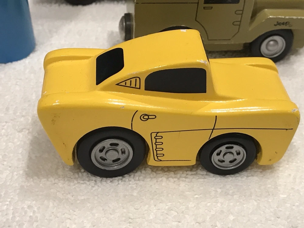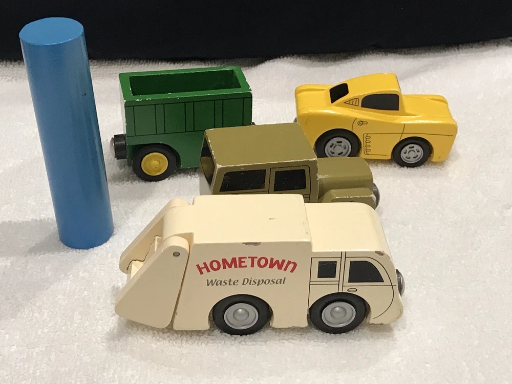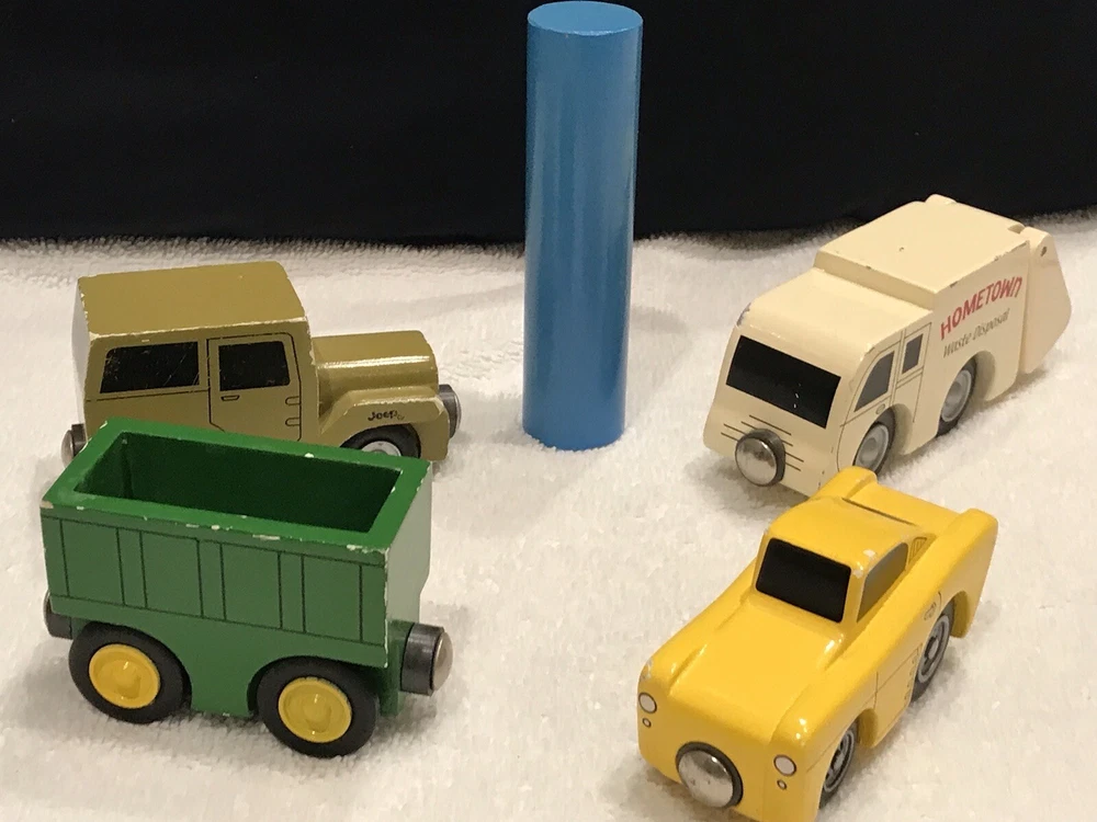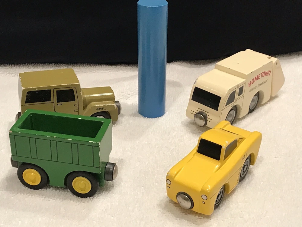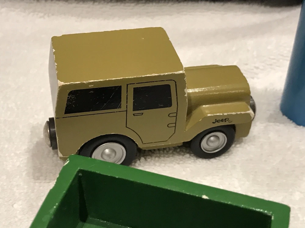 Various wooden toys DOES NOT INCLUDE THE BLUE WOODEN BLOCK ONLY FOUR VEHICLES. Toys are in played with condition, please view photos These items are not new, perfect or in mint condition This is the item you will receive, and it may need a wash, have stains, dirt marks, holes, nicks, chips, paint loss, scratches odors, fading, imperfections, etc. I am not the original owner, and I have no idea of the item's prior life. All items sold as found These are used toys which are not new, item is in used poor condition. I DO NOT ACCEPT RETURNS, PLEASE REVIEW ALL PHOTOS THAT SHOW CONDITION. THANK YOU. PLEASE CONTACT ME IF YOU HAVE ANY PROBLEMS. This is not in pristine condition and not for collector looking for perfection Thanks for looking Yes, I will combine shipping whenever I can, please message me if you want to purchase more than one item. I do not have a specific return policy, but please let me know if there is any problem with your purchase and I will work with you to resolve it. Buyer always pays return shipping fees. IF I OR EBAY AGREE TO A RETURN BUYER ALWAYS PAYS RETURN SHIPPING FEE AND RETURN REFUND AMOUNT WOULD BE FOR PURCHASE PRICE ONLY (SHIPPING COST NON- REFUNDABLE)