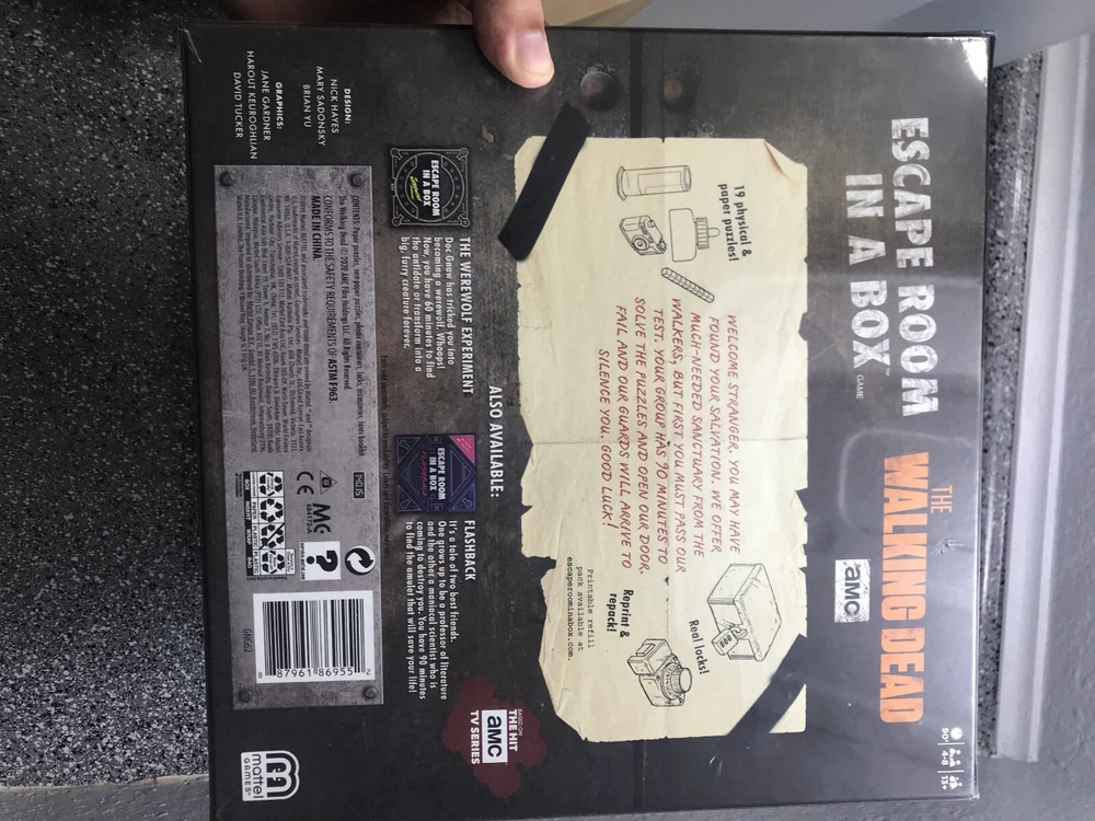 Year:2019Theme:Escapegtin13:887961869552Type:Complete GameAward:Games 100Brand:Mattel GamesGame Title:Escape RoomUPC:887961869552Custom Bundle:NoModified Item:NoCountry/Region of Manufacture:ChinaMin. Number of Players:4 playersGame Type:Party GameAge Level:12-16 YearsRelease Year:2020MPN:88796186955Recommended Age Range:13 Years & UpCharacter Family:The Walking DeadFeatures:19 Physical & Paper Puzzles!Title:Mattel Games - Escape Room In A Box: Walking DeadGender:Boys & Girls