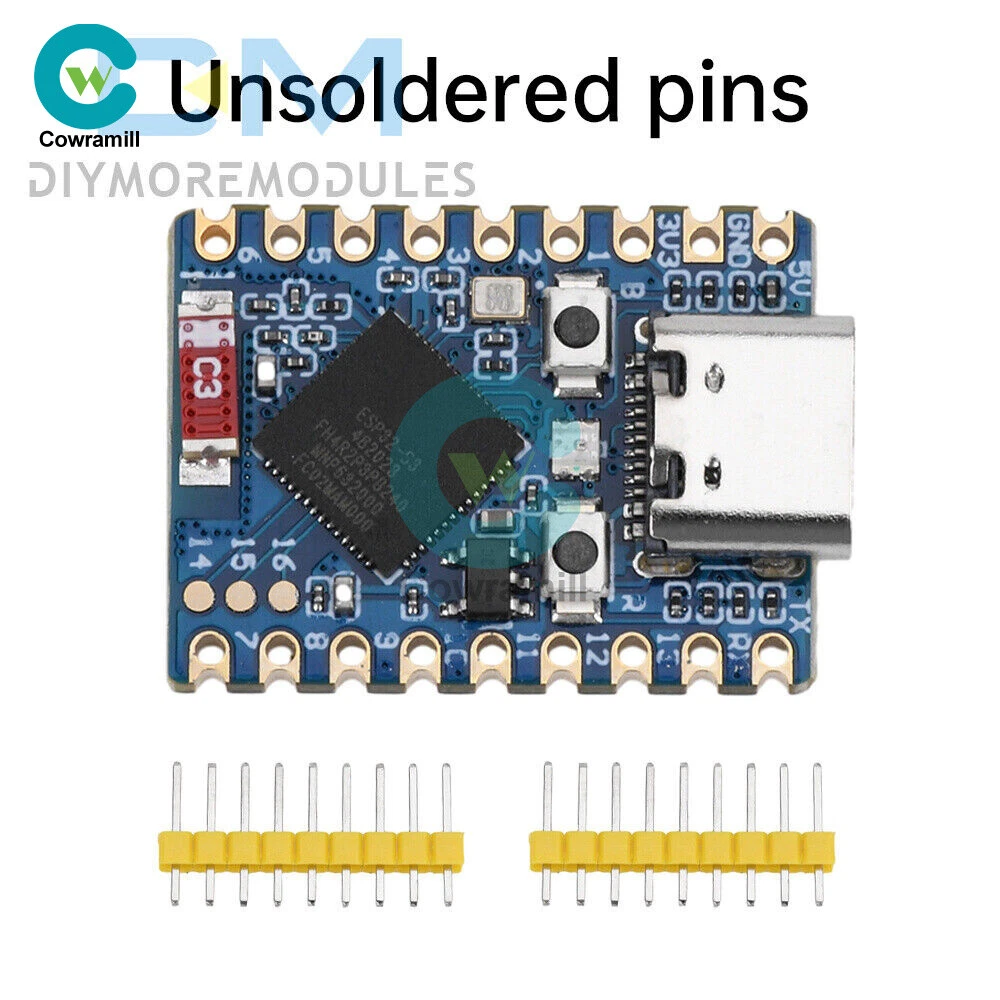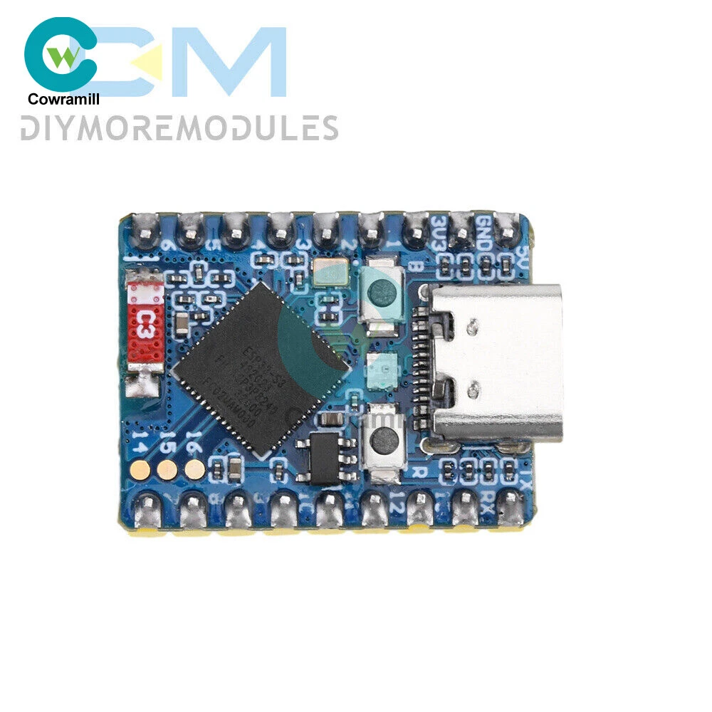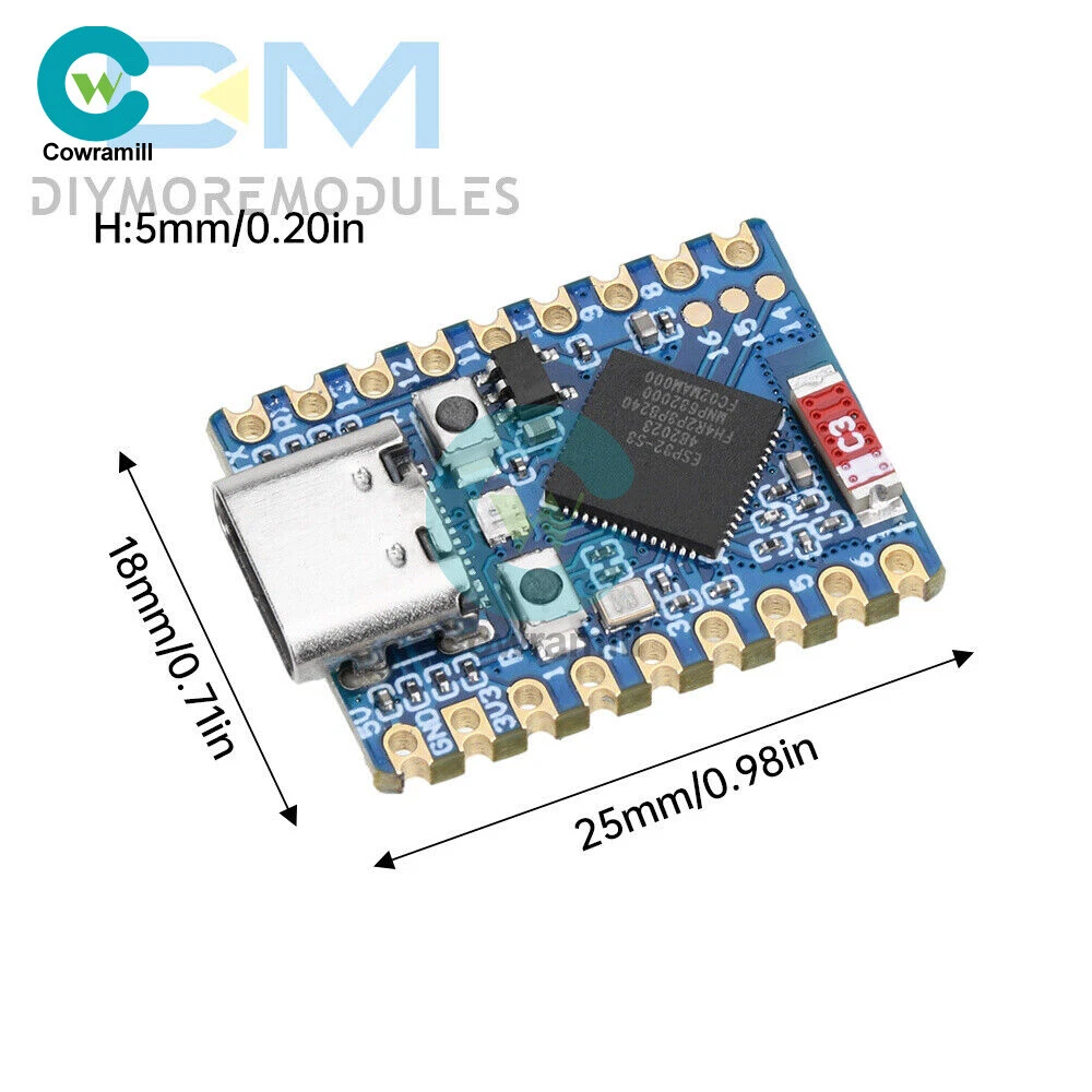 Home Arduino Module Sensor Chips About Us Item Description Features 1. Equipped with high-performance Xtensa® 32-bit LX7 dual-core processor with 240MHz. 2. Supports 2.4GHz Wi-Fi (802.11 b/g/n) and Bt® 5 (LE). 3. Built-in 512KB SRAM and 384KB ROM, stacked with 4MB Flash and 2MB PSRAM. 4. Adopting stamp hole design and on-board ceramic antenna, easy to integrate into user-designed backplane. 5. Support flexible clock, module power supply separate settings and other controls, to achieve multi-scenario low-power mode. 6. Integrated USB serial port full-speed controller, leading to 34 GPIO can be flexibly configured peripheral functions. 7. With 4xSPI, 2xI2C, 3xUART, 2xI2S, 2xADC and other peripherals. 8. Based on ESP32-S3 FH4R2, pin out most of the pins under small board type, using half-hole process, can be soldered on customized board. Specification Processor: ESP32-S3 FH4R2 dual-core processor, up to 240MHz operating frequency Interface: USB Type-C interface Current: (Max) 800mA Antenna: 2.4G ceramic antenna Button: BOOT button, press and then press reset to enter download mode. RESET reset button LED:WS2812 Cool RGB LED Size: 23.5*18mm List 1 x Development Board 2 x Pin Header (Soldering or unsoldering optional) Payment Shipping Refund Payment We accept PayPal only. But we only Accept your Ebay Address ,Please Make sure it's 100% right. Payment must be received in 5 business days of auction closing. Please leave note for your special request (e.g. Colors or Size) in PayPal when you pay the order. Any special request cannot be accepted after 24 hours of payment, because most of orders will be processed instantly and same day dispatched. Shipping Fill your shipping info Refund All package need to wait 30 days (US only need 7-10 days) , Please take care it.Less than 30 days,we can't take a refund . If the item is defect when you receive it or you are not satisfied with it, please return it within 14 days for a replacement or money back. But the items must be back in factory condition. Please contact us and double check the return address before you return it. If is item is defective in 12 months, you can return it to us. We will send you a new replacement after receiving the defective item.