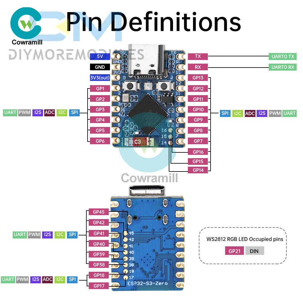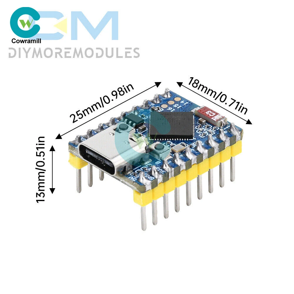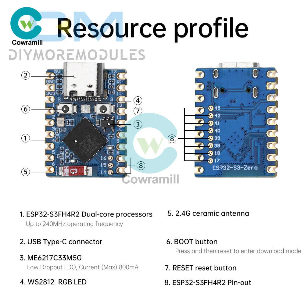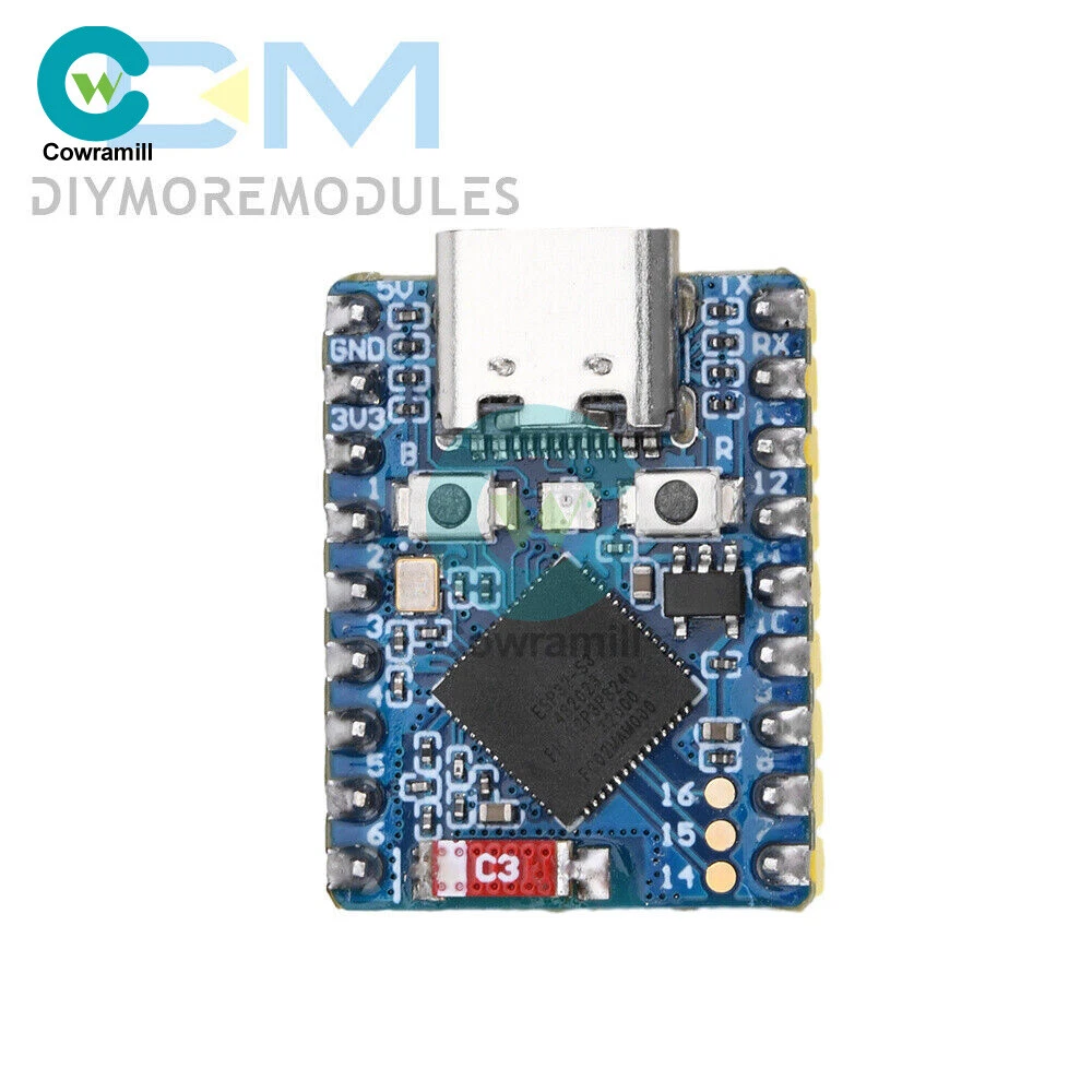 Home Arduino Module Sensor Chips About Us Item Description Features 1. Equipped with high-performance Xtensa® 32-bit LX7 dual-core processor with 240MHz. 2. Supports 2.4GHz Wi-Fi (802.11 b/g/n) and Bt® 5 (LE). 3. Built-in 512KB SRAM and 384KB ROM, stacked with 4MB Flash and 2MB PSRAM. 4. Adopting stamp hole design and on-board ceramic antenna, easy to integrate into user-designed backplane. 5. Support flexible clock, module power supply separate settings and other controls, to achieve multi-scenario low-power mode. 6. Integrated USB serial port full-speed controller, leading to 34 GPIO can be flexibly configured peripheral functions. 7. With 4xSPI, 2xI2C, 3xUART, 2xI2S, 2xADC and other peripherals. 8. Based on ESP32-S3 FH4R2, pin out most of the pins under small board type, using half-hole process, can be soldered on customized board. Specification Processor: ESP32-S3 FH4R2 dual-core processor, up to 240MHz operating frequency Interface: USB Type-C interface Current: (Max) 800mA Antenna: 2.4G ceramic antenna Button: BOOT button, press and then press reset to enter download mode. RESET reset button LED:WS2812 Cool RGB LED Size: 23.5*18mm List 1 x Development Board 2 x Pin Header (Soldering or unsoldering optional) Payment Shipping Refund Payment We accept PayPal only. But we only Accept your Ebay Address ,Please Make sure it's 100% right. Payment must be received in 5 business days of auction closing. Please leave note for your special request (e.g. Colors or Size) in PayPal when you pay the order. Any special request cannot be accepted after 24 hours of payment, because most of orders will be processed instantly and same day dispatched. Shipping Fill your shipping info Refund All package need to wait 30 days (US only need 7-10 days) , Please take care it.Less than 30 days,we can't take a refund . If the item is defect when you receive it or you are not satisfied with it, please return it within 14 days for a replacement or money back. But the items must be back in factory condition. Please contact us and double check the return address before you return it. If is item is defective in 12 months, you can return it to us. We will send you a new replacement after receiving the defective item.