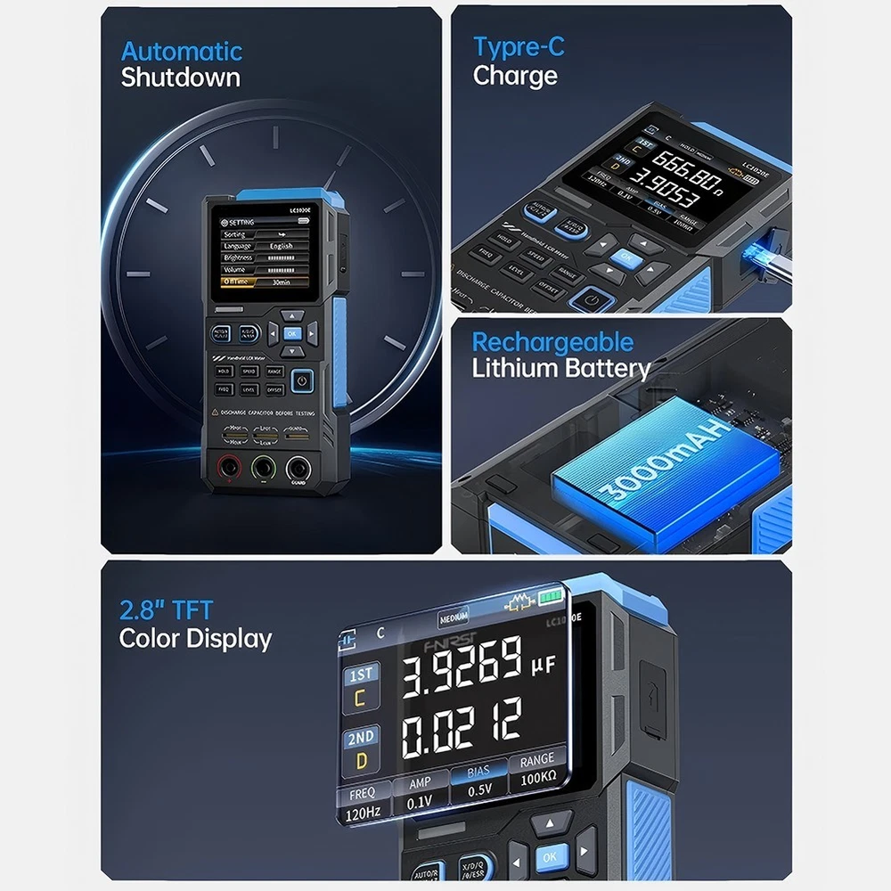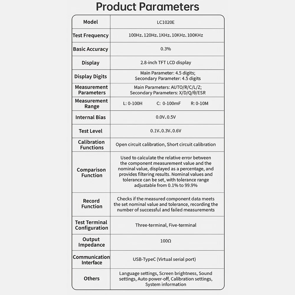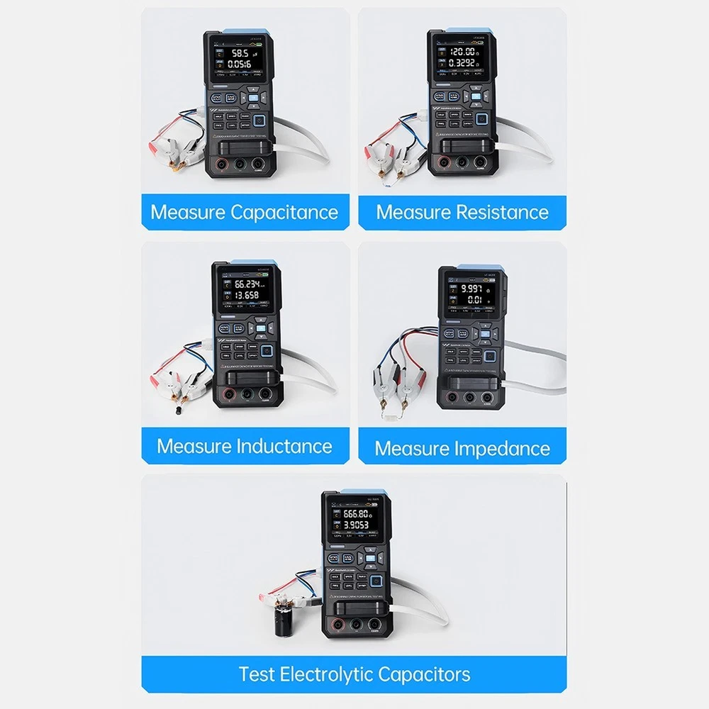 ESR Tester Digital Bridge Tester 2.8-inch TFT Display Component Testing DESCRIPTION Features: 1. High-Precision, Wide-Range Measurement: The LC1020E boasts a basic accuracy of up to 0.3%, reliable and precise professional measurements. It supports a wide measurement range of inductance (0-100H), capacitance (0-100mF), and resistance (0-10MΩ), making it suitable for a wide range of components. 2. Multiple Frequencies and Selectable Test Levels: This LCR meter five selectable test frequencies (100Hz, 120Hz, 1kHz, 10kHz, 100kHz) and three test levels (0.1V, 0.3V, 0.6V), providing the flexibility to accurately analyze component characteristics under a wide range of conditions, from general-purpose testing to high-frequency parameter analysis. 3. Dual Test Ports for Versatile Versatility and Reliability: The device a convenient three-terminal test socket for quick, everyday measurements, as well as a five-terminal test slot. The five-terminal configuration supports full four-terminal Kelvin measurements when used with professional test fixtures, minimizing impedance errors and the highest measurement accuracy. 4. Intelligent Component Sorting and Data Logging: The intelligent comparison function significantly improves batch testing efficiency. Simply set the nominal value and tolerance (0.1% - 99.9%) to automatically sort components, with pass/fail results confirmed via visual and audio prompts. Data logging mode records the number of pass and fail measurements for effective quality control. 5. Portable Design, Clear Display, and Long Battery Life: The LC1020E is designed for laboratory, production line, and field use. Its compact design a powerful 3.7V, 3000mAh rechargeable lithium battery. The large 2.8-inch TFT color screen clearly displays all primary and secondary parameters (L/C/R/Z, X/D/Q/θ/ESR), making it easy to read measurement values anytime, anywhere. Specifications: Part Name: LC1020E Digital Bridge Handheld Tester Material: ABS Model: LC1020E Color: Black size: As shown 1. Display: 2.8-inch TFT LCD 2. Basic Accuracy: 0.3% 3. Number of Display Digits: Primary Parameter: 4.5 digits; Secondary Parameter: 4.5 digits 4. Test Frequency: 100Hz, 120Hz, 1kHz, 10kHz, 100kHz 5. Test Level: 0.1V, 0.3V, 0.6V 6. Internal Bias: 0.0V, 0.5V 7. Measurement Parameters: Primary Parameters: AUTO/R/C/L/Z; Secondary Parameters: X/D/Q/θ/ESR 8. Measurement Range: L: 0-100H, C: 0-100mF, R: 0-10MΩ 9. Measurement Speed: Fast (4 times/second), Medium (2 times/second), Slow (1 time/second) 10. Calibration Function: Open-circuit calibration, short-circuit calibration 11. Comparison Function: Calculates the relative error between the measured component value and the nominal value, displays it as a percentage, and provides a filtered result. The nominal value and tolerance can be set, with an adjustable range of 0.1% to 99.9%. 12. Recording Function: Checks whether the measured component data meets the set nominal value and tolerance, and records the number of successful and failed measurements. 13. Test terminal configuration: three-terminal, five-terminal 14. Output impedance: 100Ω 15. Communication interface: Type C (virtual serial port) 16. Other functions: Language setting, screen brightness, sound settings, auto power off, calibration settings, system information. Package Contents: 1. LC1020E LCR meter *1 2. Data cable *1 3. Short circuit board *1 4. Kelvin test clip *1 5. Test (black *1 + red *1) 6. User manual *1 Note: 1. The real color of the item may be slightly different from the pictures shown on website caused by many factors such as brightness of your monitor and light brightness. 2. Please allow slight manual measurement deviation for the data. POLICES Shipping Payment WARRANTY We only ship to confirmed ebay Order addresses. Please comfirm that your Order address is in line with your shipping address. Please kindly note that the combined shipping is not provided because the shipping fee is calculated by weight. Also, the each additional item means exactly the the same color and size. It takes about 7-15 working days to Australia; about 10-30 working days to other countries. Transit time may be a little delayed because of the bad weather and customs inspection. If you do not receive your item within 30 working days since payment finished, please contact us immediately for further assistance. Payment must be completed within 5 days. If you have any problems about payment, please contact us via ebay message. We strive for 100% customer satisfaction! Positive Feedback is very important to us. If you have any questions, please feel free to contact us via "Ask seller a question" . We will reply your email within 24 working hours.