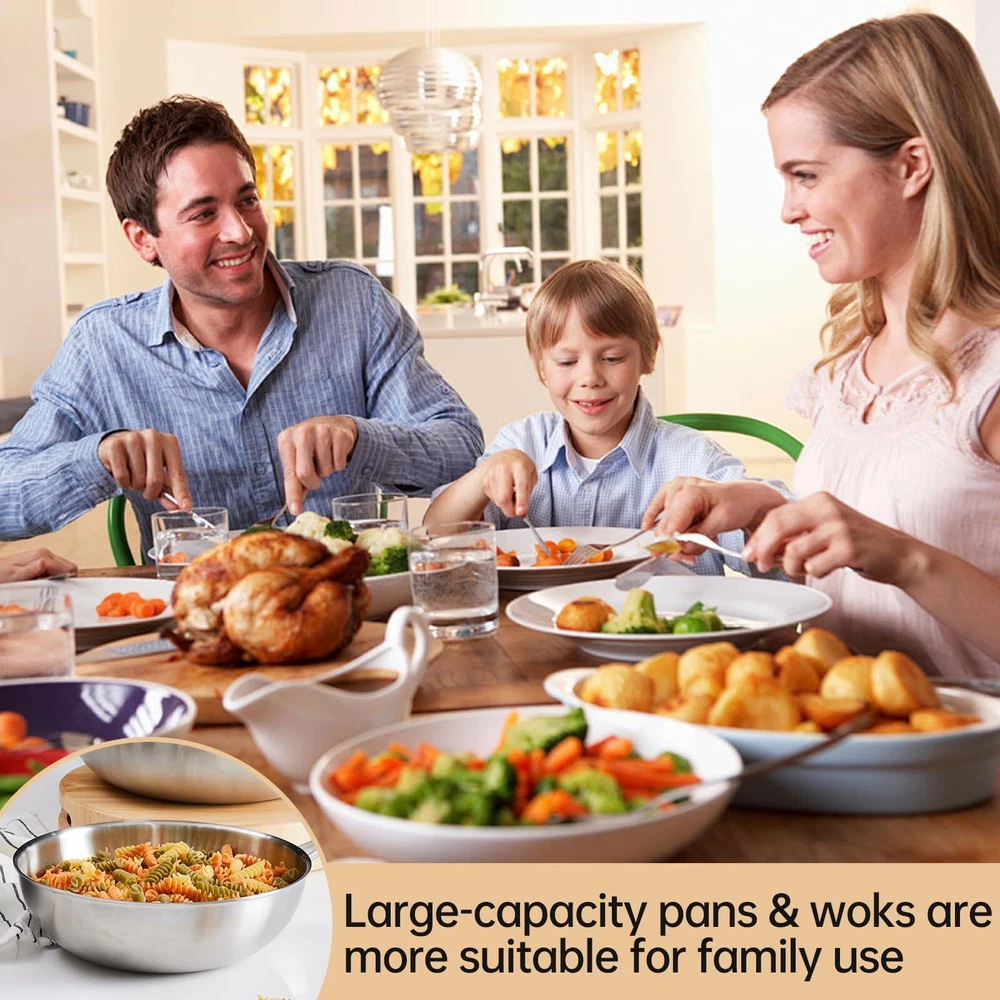 【Tri-ply Construction】Premium stainless steel wok pan with lid, featuring a durable tri-ply construction for even heat distribution and retention, uses 20% less gas or electricity than you used to cook. 【Food Stainless Steel】Highly polished 18/10 food stainless steel cooking surface, superior stick resistance, and easy to clean. 【Practical and Elegant】Rivet-free stainless steel long handle fastening ensures a secure grip while providing a comfortable grip and cool-touch handle when cooking on the stovetop. The durable glass lids for easy food monitoring and sealing in heat and flavors for more flavorful and healthier meals. 【Thick & Durable】Fully clad, 3-layer metal construction provides performance and durability for years. High-quality stainless steel material, thick and durable, with a packaging weight of 1.65-2.20 kilograms. 【Suitable for All Stoves】The stainless steel pan is suitable for all stoves, including induction stoves, gas stoves, stoves, halogen stoves, glass stoves and ceramic stoves. The high-quality stainless steel and aluminum core makes it dishwasher-safe and oven-safe up to 500°F.
