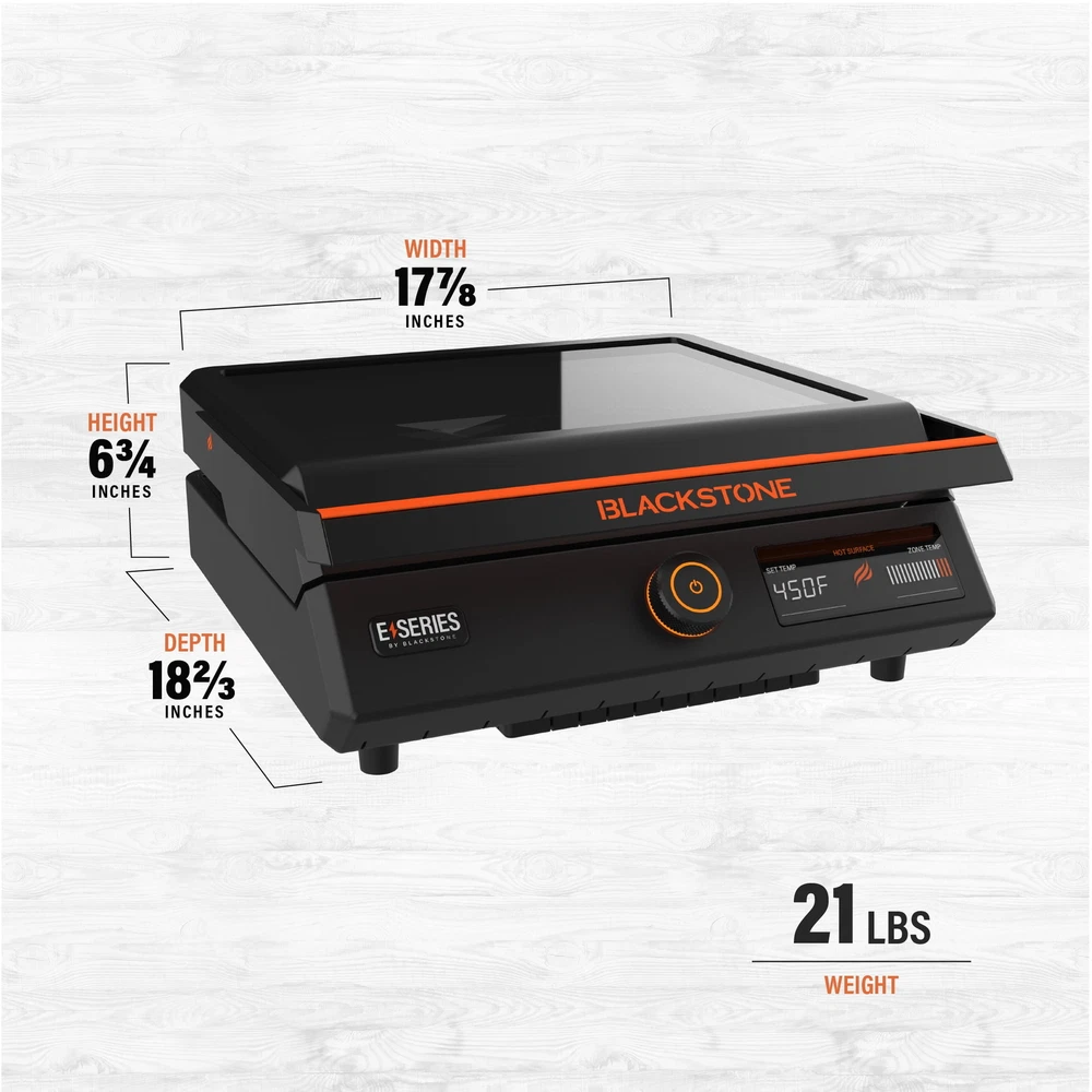 E-Series 17" Electric Tabletop Griddle with Hood, Black Item Description Introducing the Blackstone E-series 17" Electric Tabletop Griddle with Hood. This 17" E-Series Griddle is a brand new style from Blackstone and is perfect for any occasion, whether it be indoor or outdoor. The 238-sq-in griddle plate is machine cast with a durable and elegant ceramic-titanium coating. It has a clean-catch, low profile, rear grease management system. The entire grease cup is dishwasher safe making cleanup simple. You can rotate and remove the E-Series hood for ease of use. Control the temperature with the EZ-Touch control dial and the large LCD Display. If you are new to Blackstone cooking or in the market for an indoor griddle with outdoor performance, this is the griddle for you. Blackstone's first electric griddle for indoor and outdoor cooking 238-square-inch cooktop surface Clean-catch low profile patented rear grease management system makes clean-up quick, easy, and discrete Large LCD digital display for easy readability The patented rotate and remove glass hood provides sleek protection and traps heat for cooking and steaming Non-stick ceramic titanium coated griddle surface for easy cooking and clean-up Dishwasher safe grease cup EZ-Touch control dial is easy to use and control Space to cook up to 9 pancakes, 12 eggs, or 4 steaks 1500W/120V/5A/60HZ Electricity requirements This item has passed certification for an IPX4 rating and a 4-hour rain exposure test. Note: Do not submerge this griddle or attempt to use in the rain. Assembled dimensions: 17.89" L x 18.7" W x 6.97" H NOTE: Existing Grease Cup Liners do not fit the E-Series grease cup. Grease Cup Liners fit Blackstone propane griddles only. 1-Year Limited Warranty Customer Service: +1 (435) 252-3030 Ext. 1 Model # 8000 Shipping Policy Fast and reliable shipping with tracking provided. Orders processed and shipped within 2 business days. International shipping options available. Return Policy 30-day return policy for any reason. Item must be in original condition. Contact us for any return inquiries. Customer Satisfaction We strive to provide 100% satisfaction. Please reach out with any questions or concerns. Positive feedback is always appreciated! Contact Us