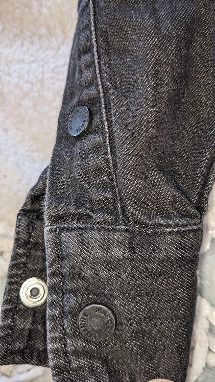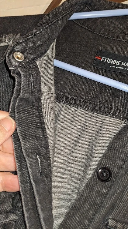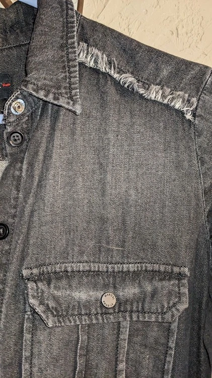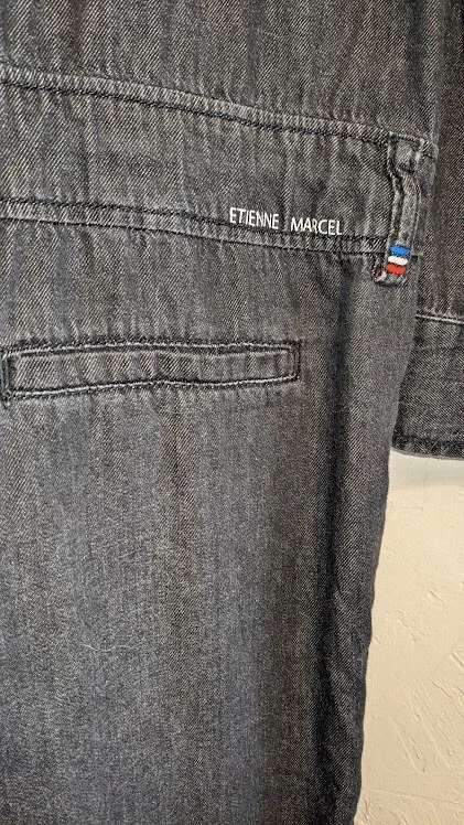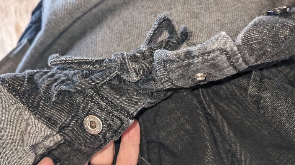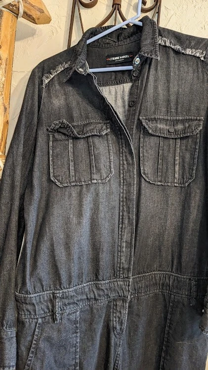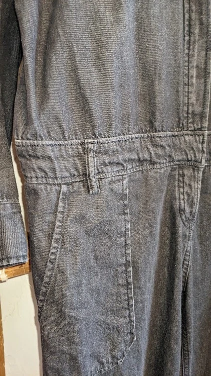 Lots of details on this jumpsuit--snap and tie at waist, button front, fringe detail, large front pockets. No size tag, but adjustable waist measures 35 in, pit to pit is 39.